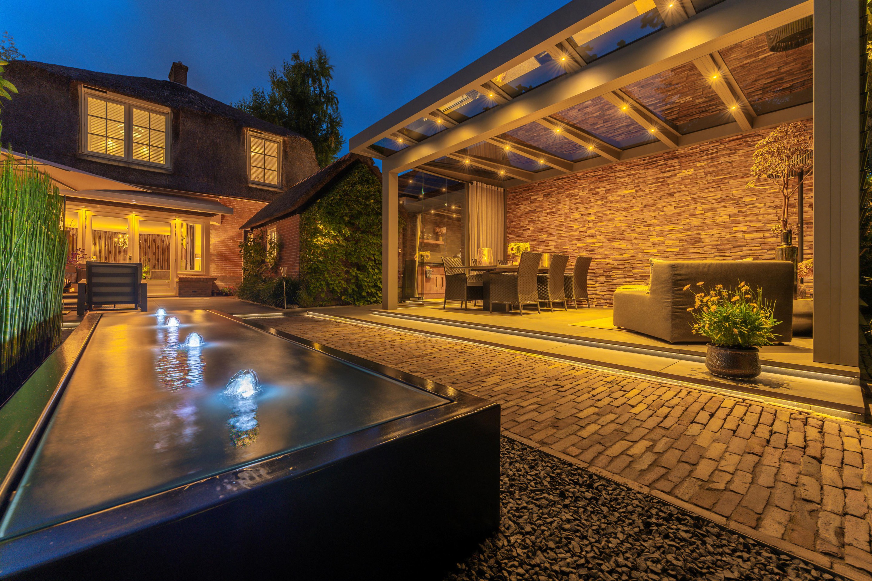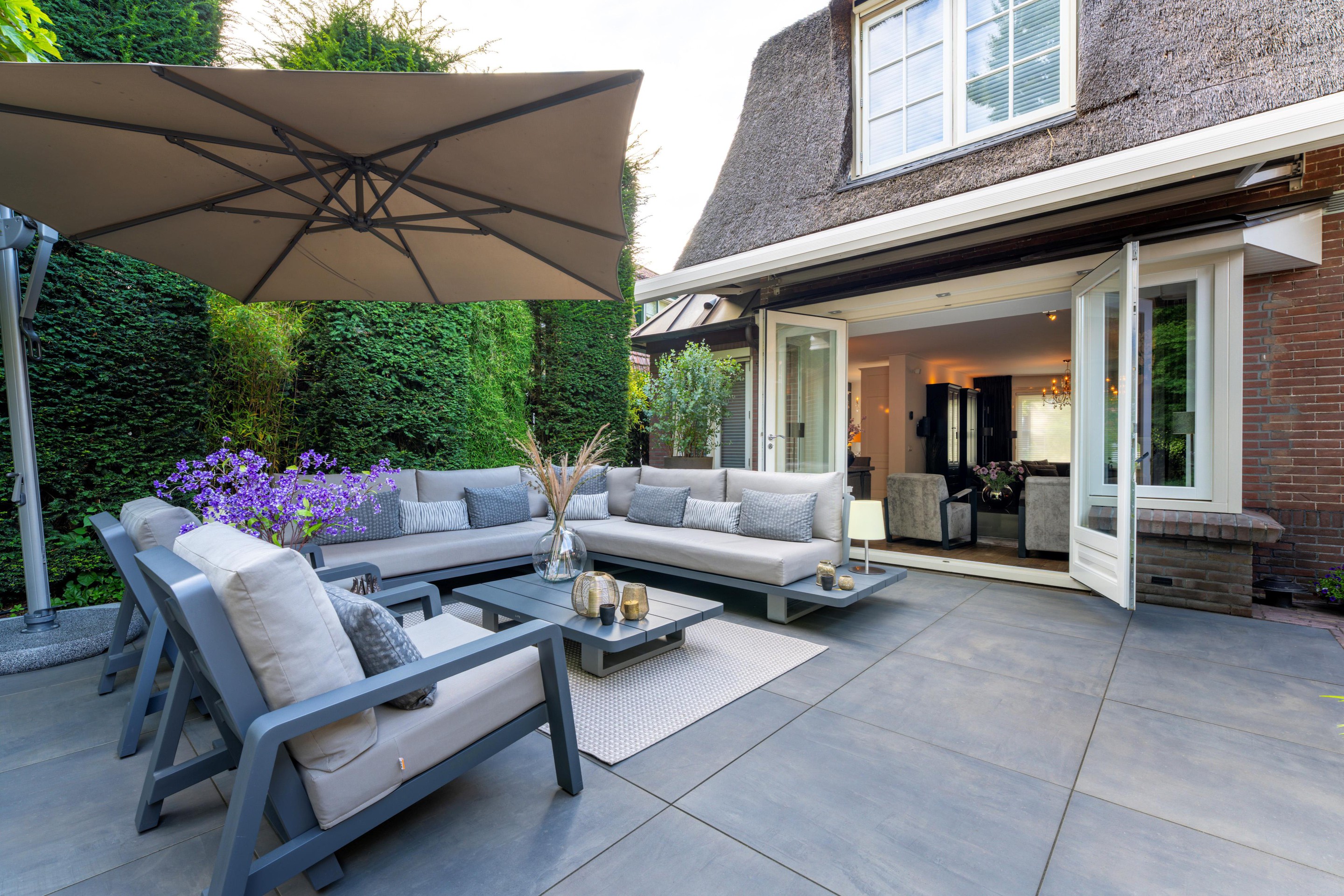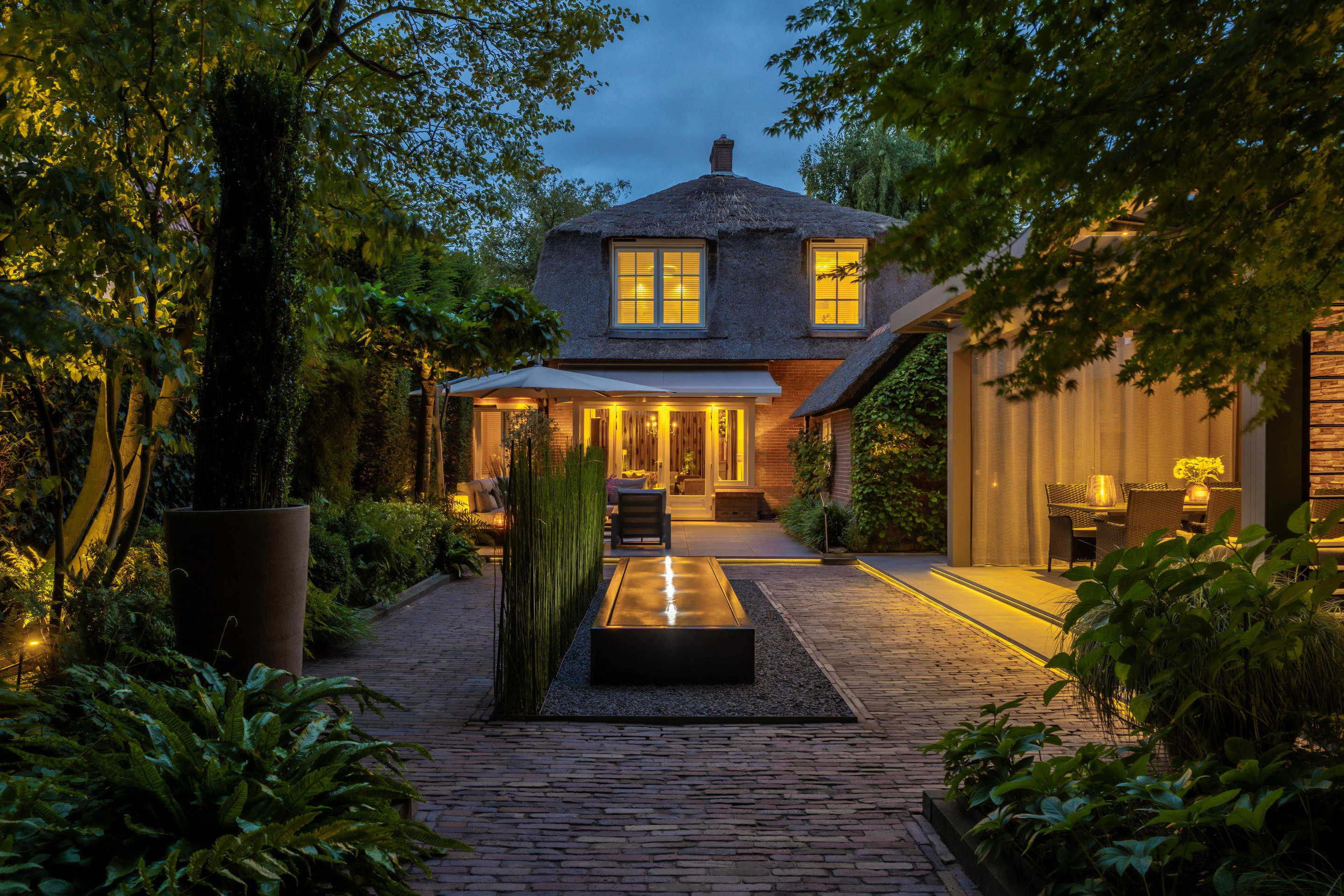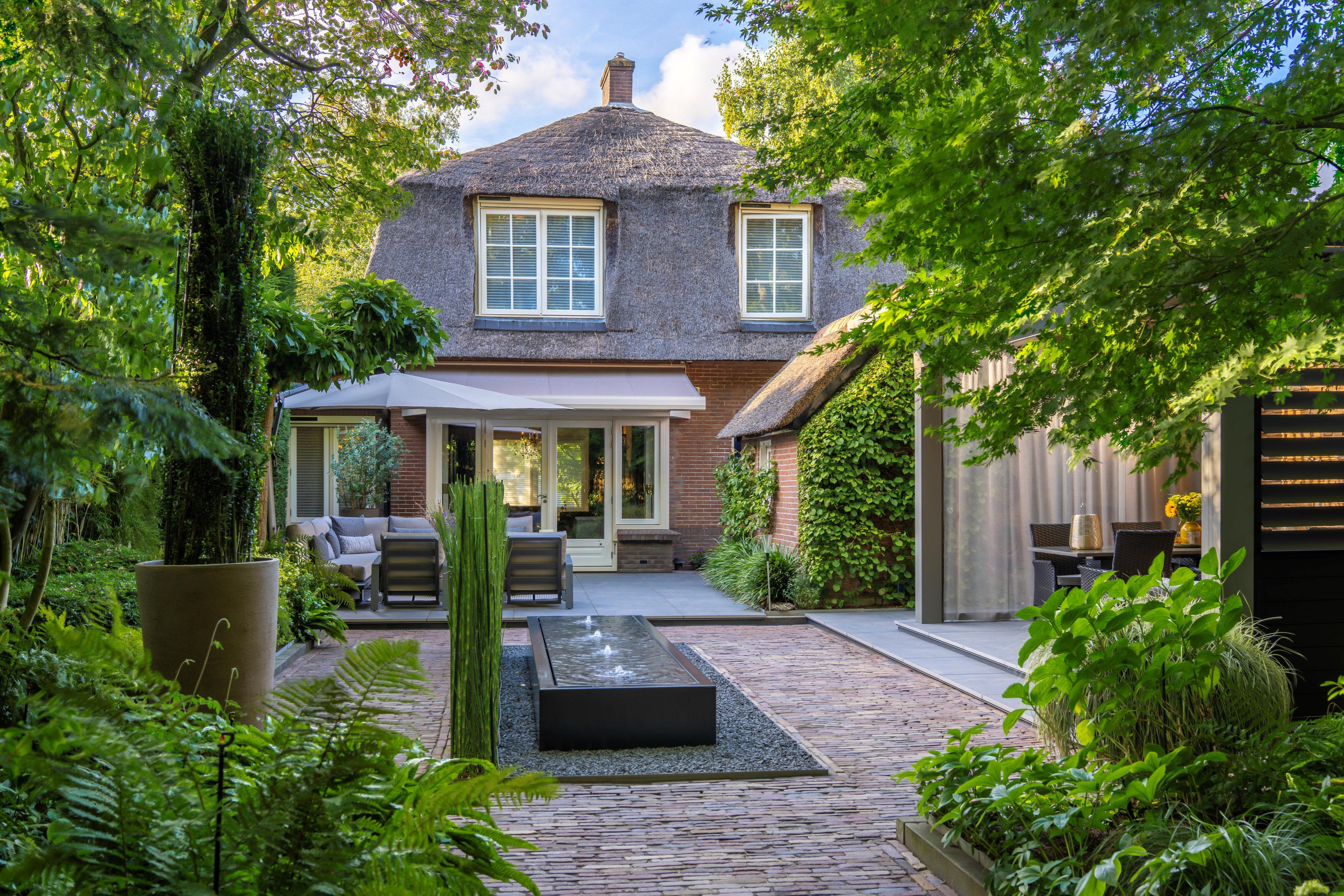 Tuin Wat deze villa zo bijzonder maakt, is de tuin. Alles ademt hier zorg en aandacht: professioneel aangelegd, met liefde onderhouden en ingericht voor optimaal genieten. Ruime terrassen, strak betegeld met stijlvolle Pien Boon-tegels van 90x90 cm, nodigen uit tot ontspannen buitenleven. Dankzij de openslaande deuren vanuit de woonkamer en de boerendeur vanuit de keuken lopen binnen en buiten naadloos in elkaar over. Op warme dagen zorgt een elektrisch zonnescherm boven het terras direct achter het huis voor extra comfort. De tuin is tot in detail doordacht. Een uitgekiend lichtplan laat het groen ’s avonds sprookjesachtig tot leven komen en maakt de tuin net zo sfeervol als overdag. Het waterspel met vier fonteinen vormt een echte blikvanger en brengt een rustgevend geluid met zich mee. Het onderhoud is verrassend eenvoudig dankzij het automatische sproeisysteem met buitenkraan. Of het nu lente, zomer, herfst of winter is – deze tuin biedt altijd een plek van rust, luxe en privacy. Een buitenruimte om trots op te zijn.