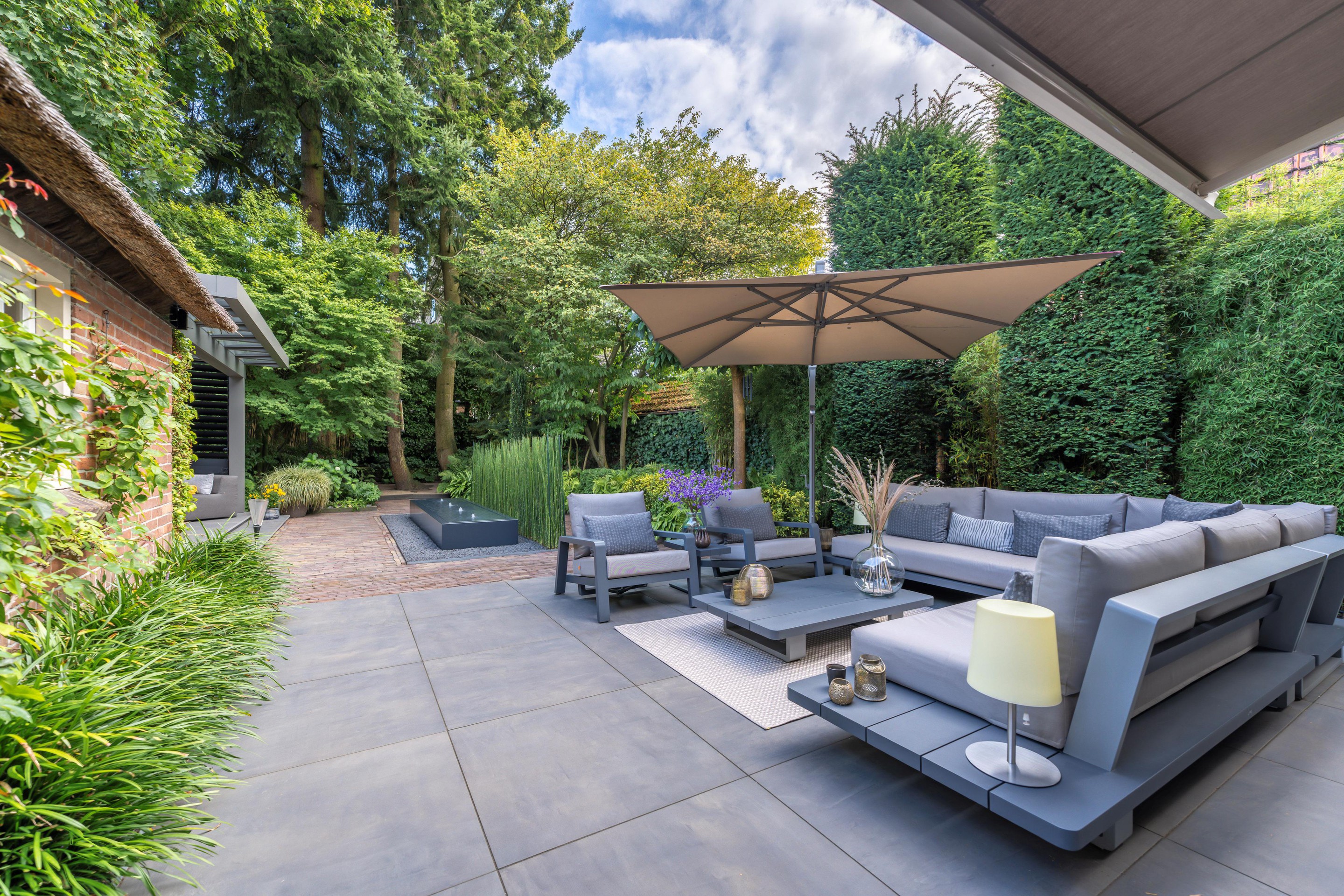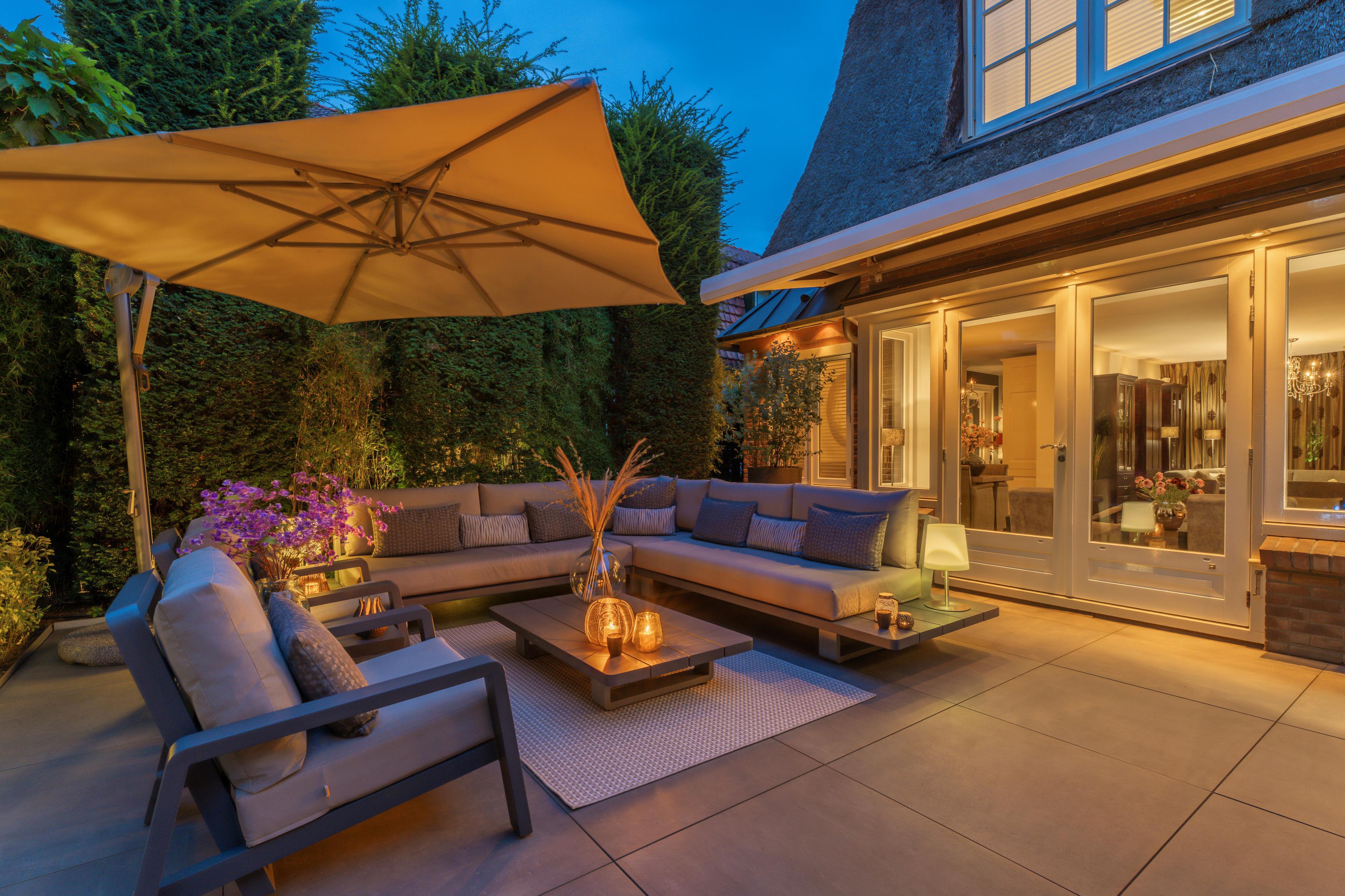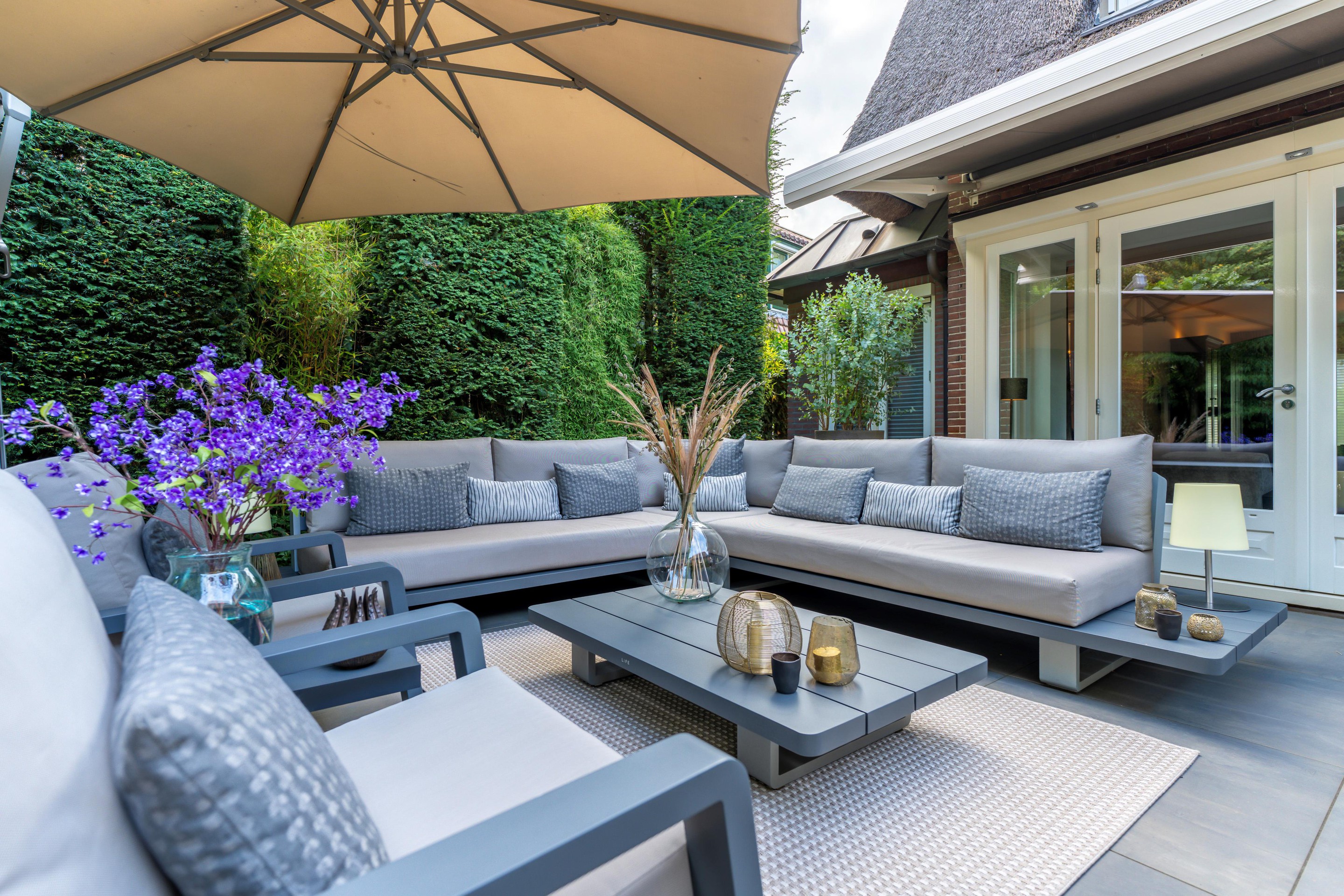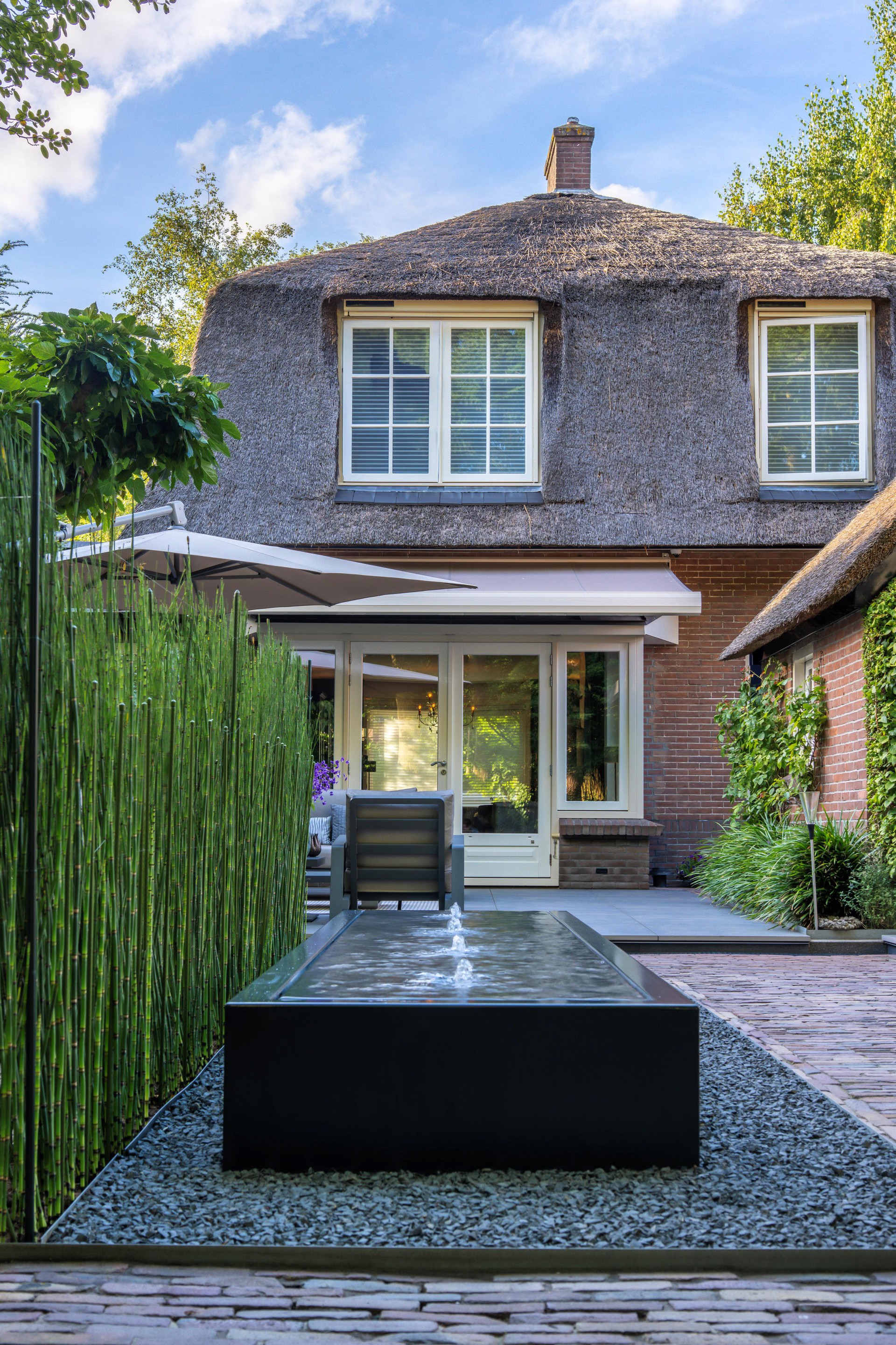 Tuin Wat deze villa zo bijzonder maakt, is de tuin. Alles ademt hier zorg en aandacht: professioneel aangelegd, met liefde onderhouden en ingericht voor optimaal genieten. Ruime terrassen, strak betegeld met stijlvolle Pien Boon-tegels van 90x90 cm, nodigen uit tot ontspannen buitenleven. Dankzij de openslaande deuren vanuit de woonkamer en de boerendeur vanuit de keuken lopen binnen en buiten naadloos in elkaar over. Op warme dagen zorgt een elektrisch zonnescherm boven het terras direct achter het huis voor extra comfort. De tuin is tot in detail doordacht. Een uitgekiend lichtplan laat het groen ’s avonds sprookjesachtig tot leven komen en maakt de tuin net zo sfeervol als overdag. Het waterspel met vier fonteinen vormt een echte blikvanger en brengt een rustgevend geluid met zich mee. Het onderhoud is verrassend eenvoudig dankzij het automatische sproeisysteem met buitenkraan. Of het nu lente, zomer, herfst of winter is – deze tuin biedt altijd een plek van rust, luxe en privacy. Een buitenruimte om trots op te zijn.