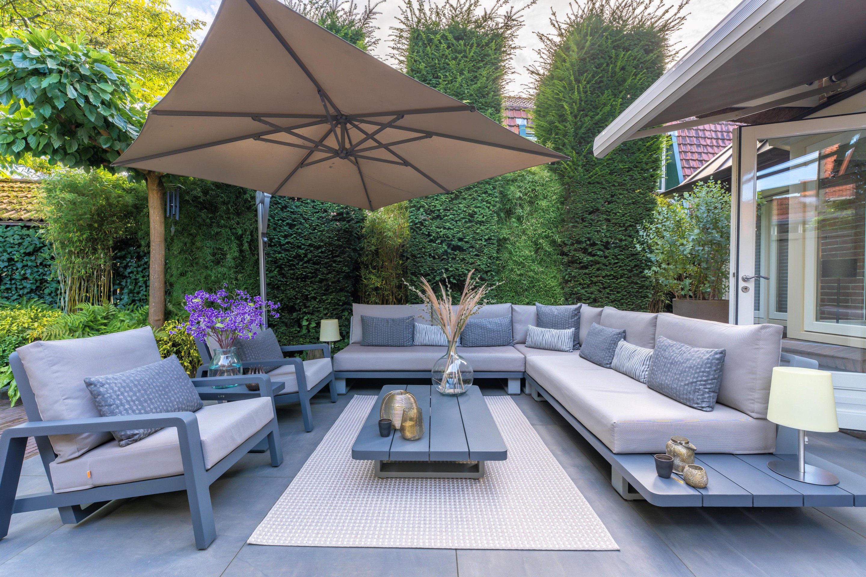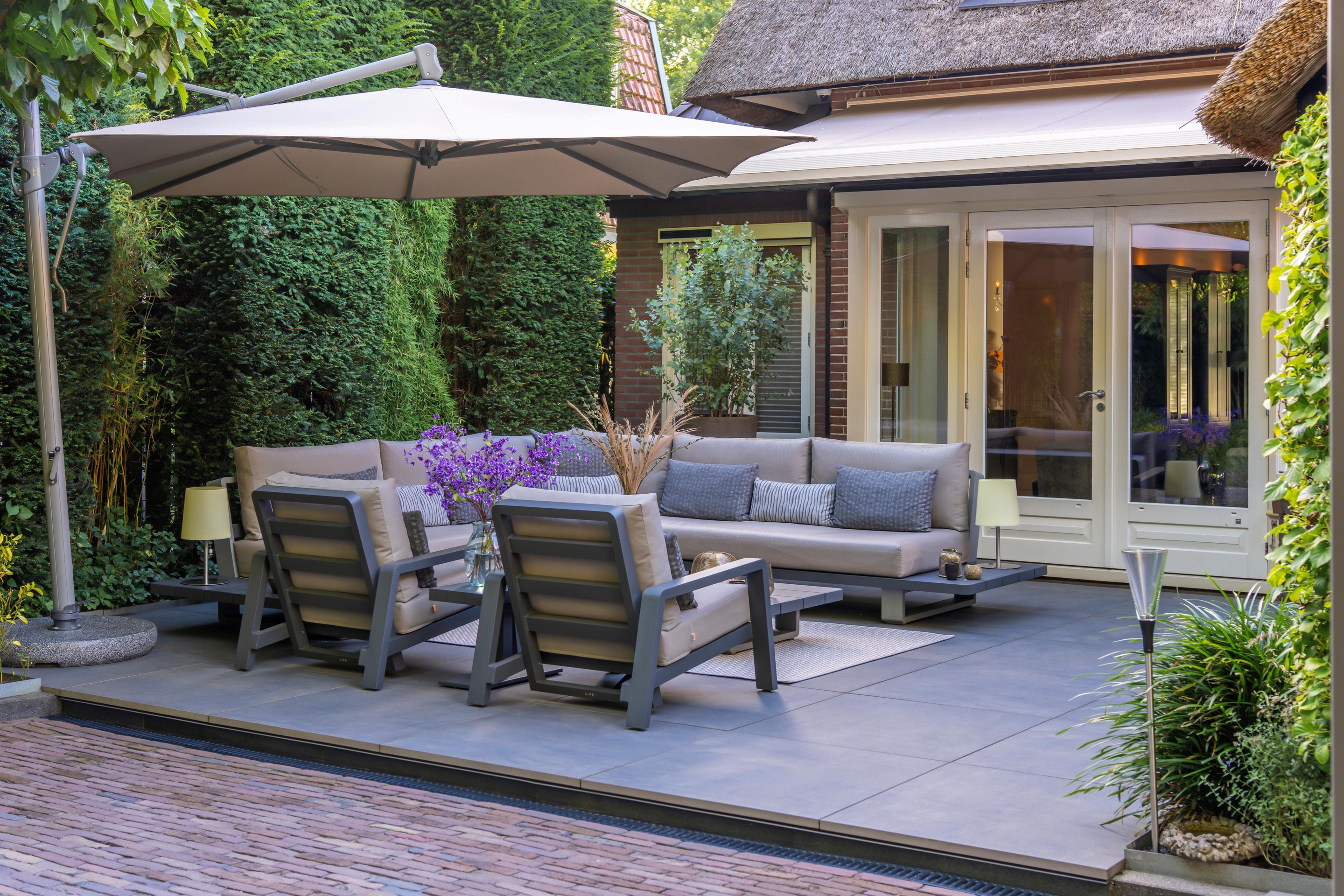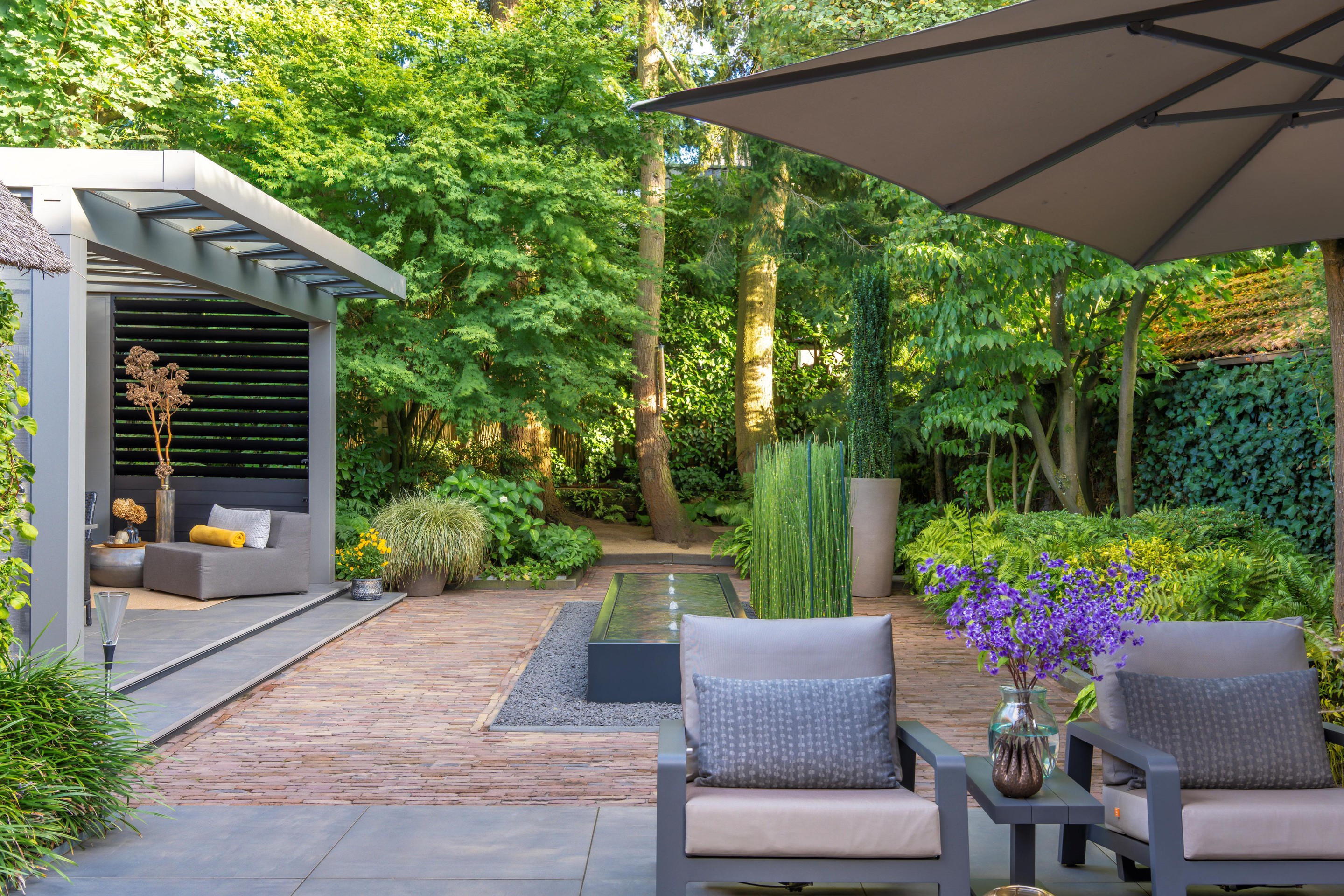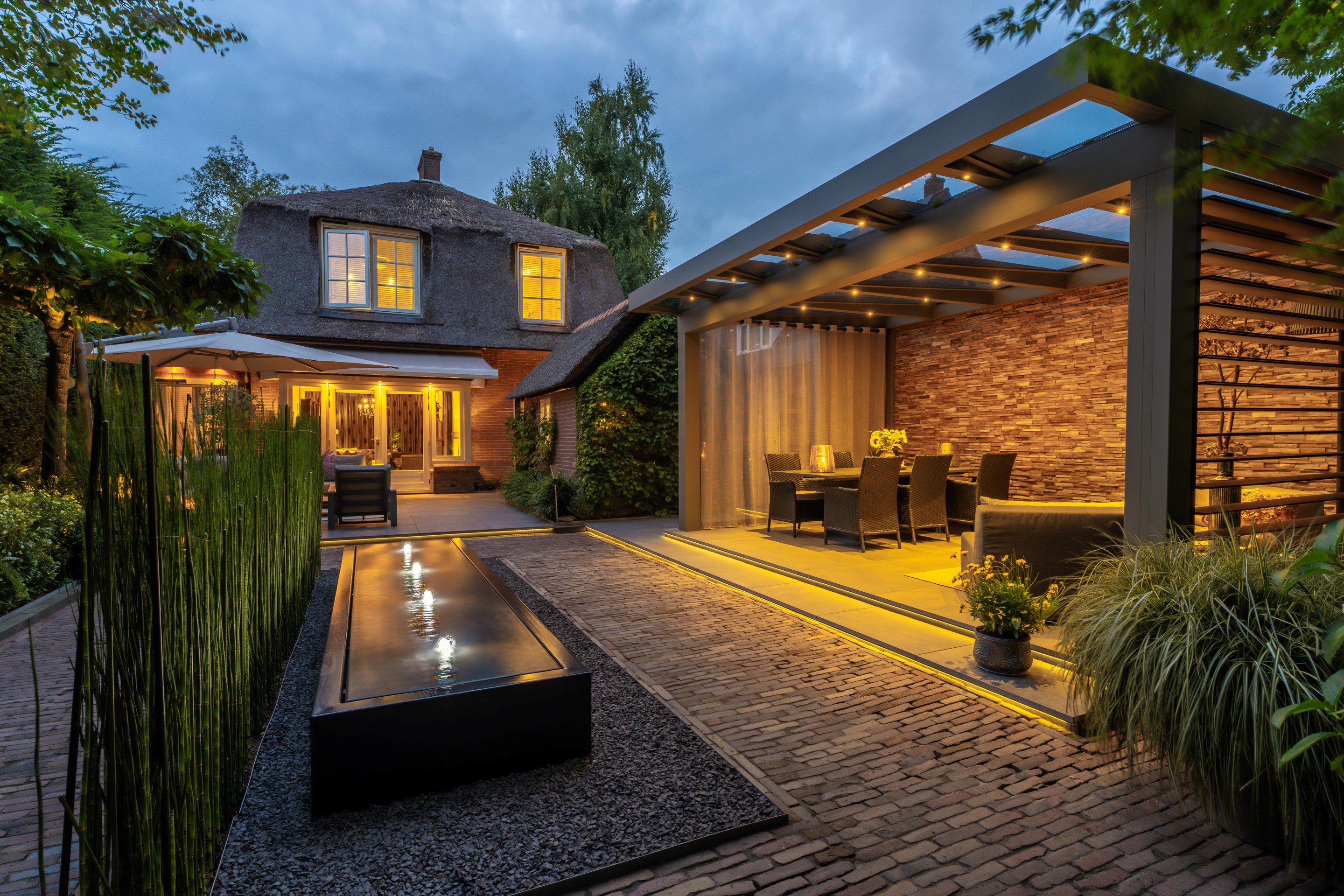 Tuin Wat deze villa zo bijzonder maakt, is de tuin. Alles ademt hier zorg en aandacht: professioneel aangelegd, met liefde onderhouden en ingericht voor optimaal genieten. Ruime terrassen, strak betegeld met stijlvolle Pien Boon-tegels van 90x90 cm, nodigen uit tot ontspannen buitenleven. Dankzij de openslaande deuren vanuit de woonkamer en de boerendeur vanuit de keuken lopen binnen en buiten naadloos in elkaar over. Op warme dagen zorgt een elektrisch zonnescherm boven het terras direct achter het huis voor extra comfort. De tuin is tot in detail doordacht. Een uitgekiend lichtplan laat het groen ’s avonds sprookjesachtig tot leven komen en maakt de tuin net zo sfeervol als overdag. Het waterspel met vier fonteinen vormt een echte blikvanger en brengt een rustgevend geluid met zich mee. Het onderhoud is verrassend eenvoudig dankzij het automatische sproeisysteem met buitenkraan. Of het nu lente, zomer, herfst of winter is – deze tuin biedt altijd een plek van rust, luxe en privacy. Een buitenruimte om trots op te zijn.