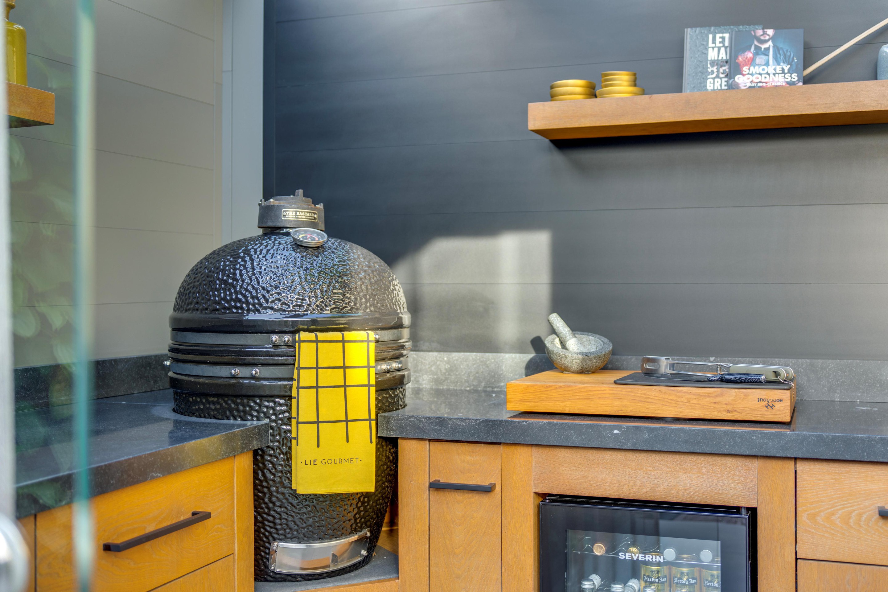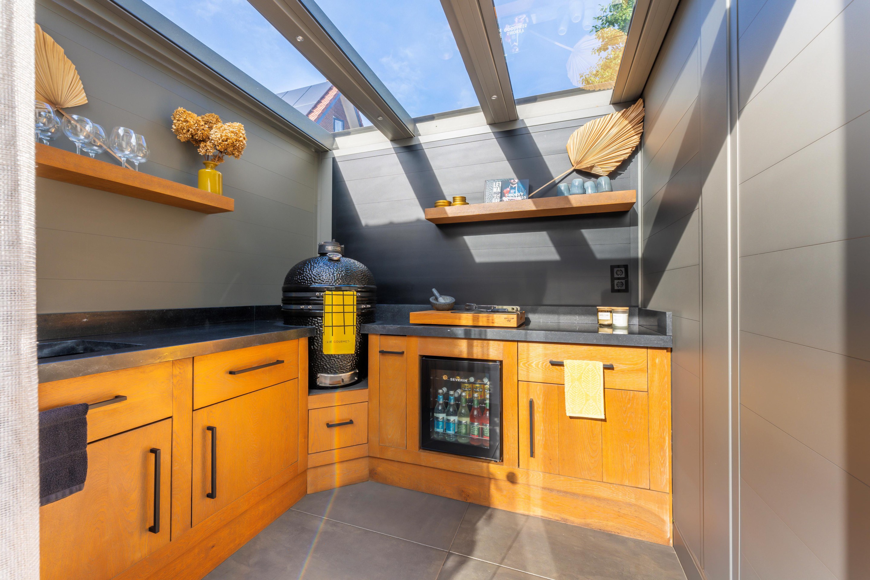 Deze woning beschikt over een schitterende Aluxe Ultraline overkapping, afgewerkt met Woodwall-bekleding en uitgevoerd als volwaardige buitenkamer. Het hoogwaardige glazen dak met zonwerende folie zorgt voor een lichte en luxe uitstraling, terwijl je hier beschut en comfortabel kunt genieten – het hele jaar door. De overkapping loopt naadloos over in een op maat-gemaakte buitenkeuken met een Basterd BBQ, koelkast en wasbak met stromend water. Alles is hoogwaardig afgewerkt en volledig overdekt, waardoor dit dé plek is voor lange zomeravonden en gezellige diners.