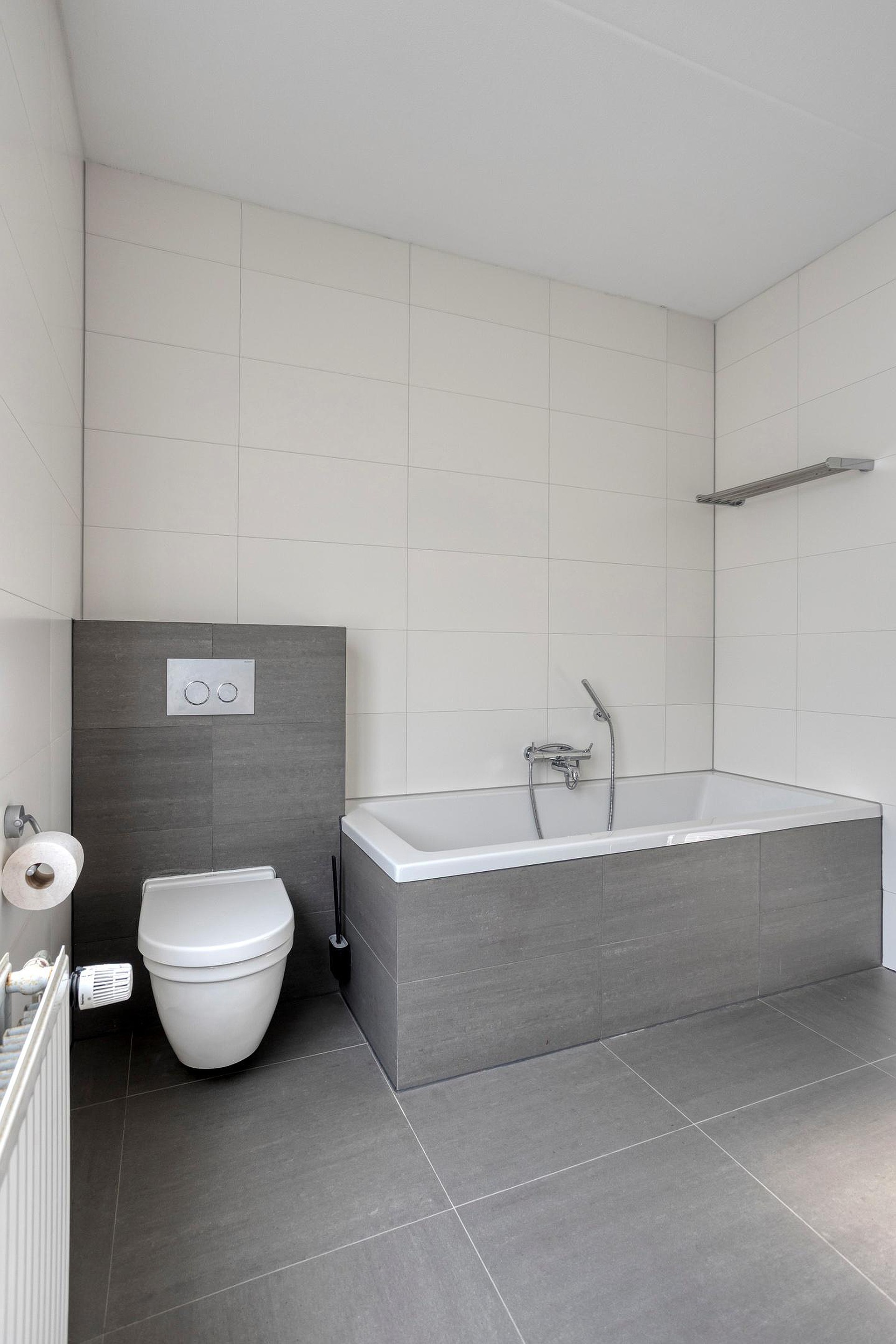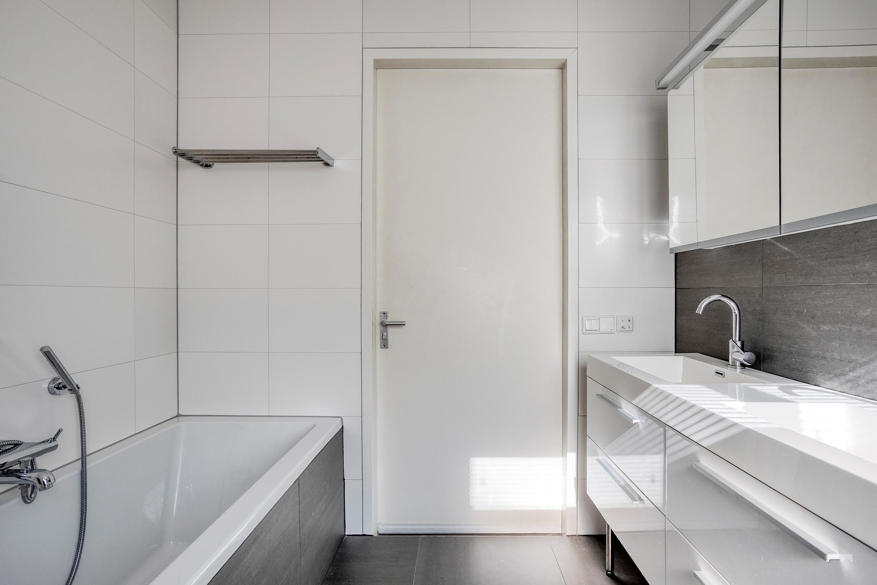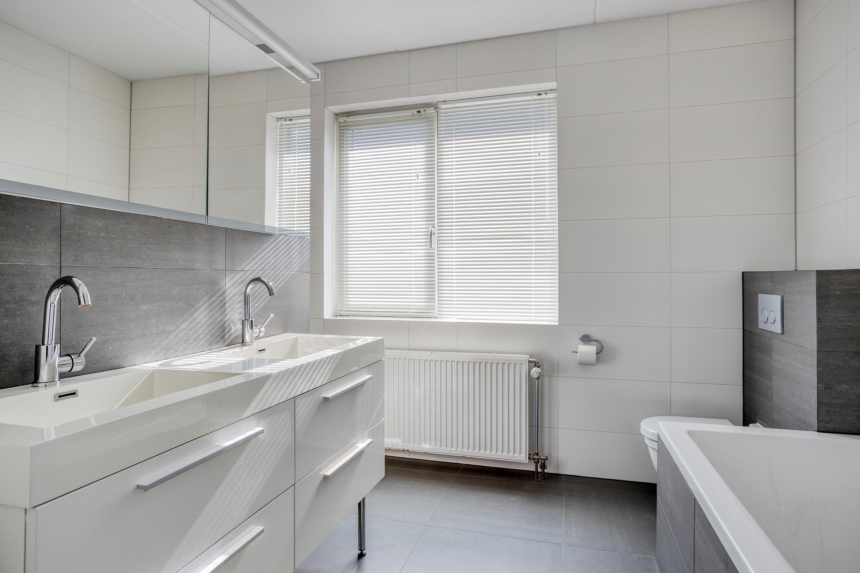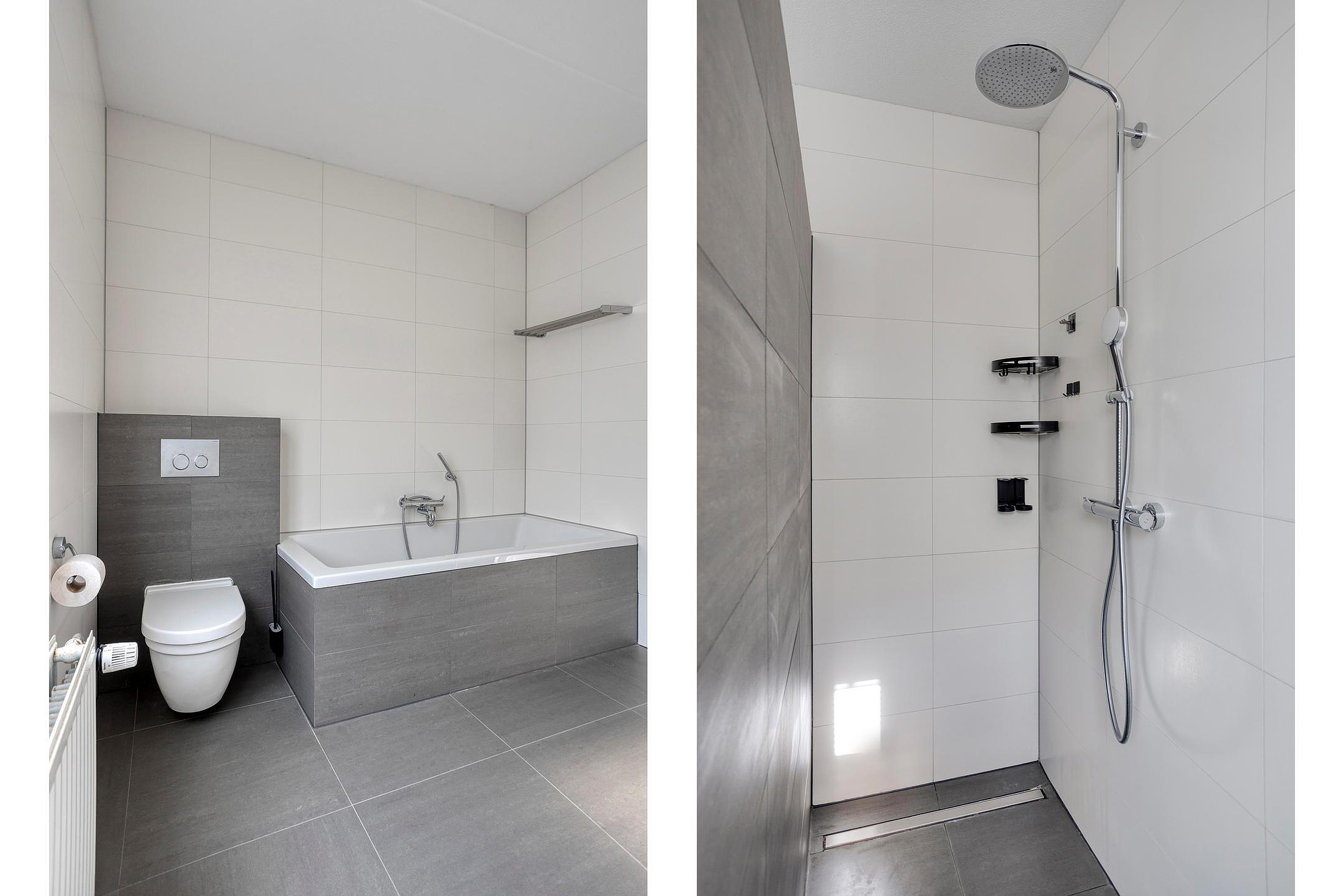 De moderne badkamer is volledig betegeld en keurig onderhouden. Deze is uitgerust met een royale inloopdouche met hand- en regendouche, een ligbad, een badmeubel met dubbele wastafel en een vrijdragend toilet. Een complete en comfortabele ruimte.