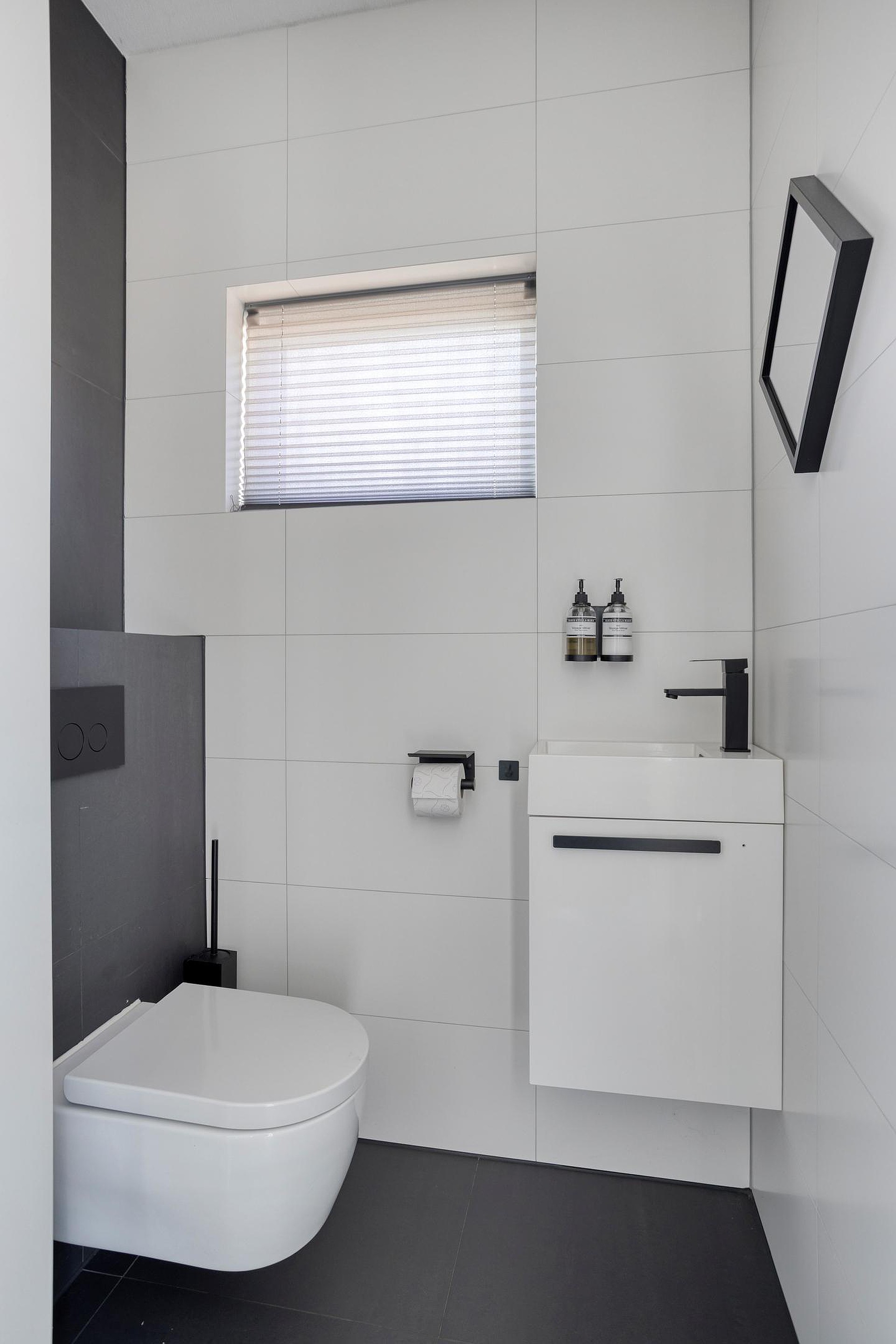 De uitgebreide meterkast beschikt over 12 groepen, 3 aardlekschakelaars en de glasvezelaansluiting. De moderne toiletruimte is geheel betegeld en voorzien van een vrijdragend toilet en een meubel met fonteintje.