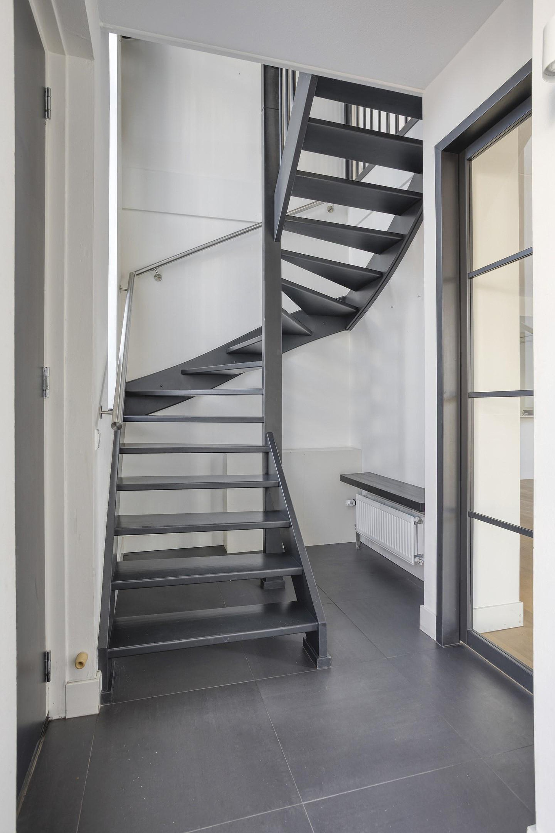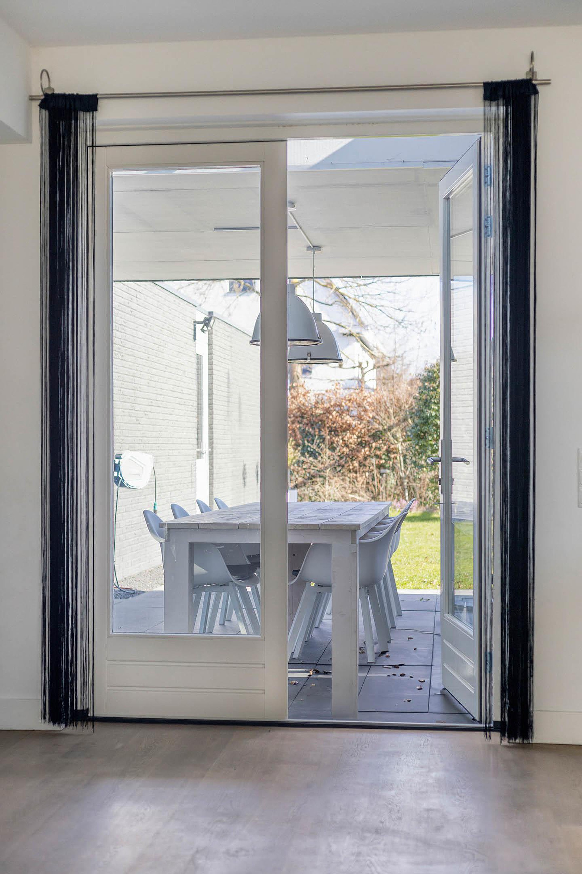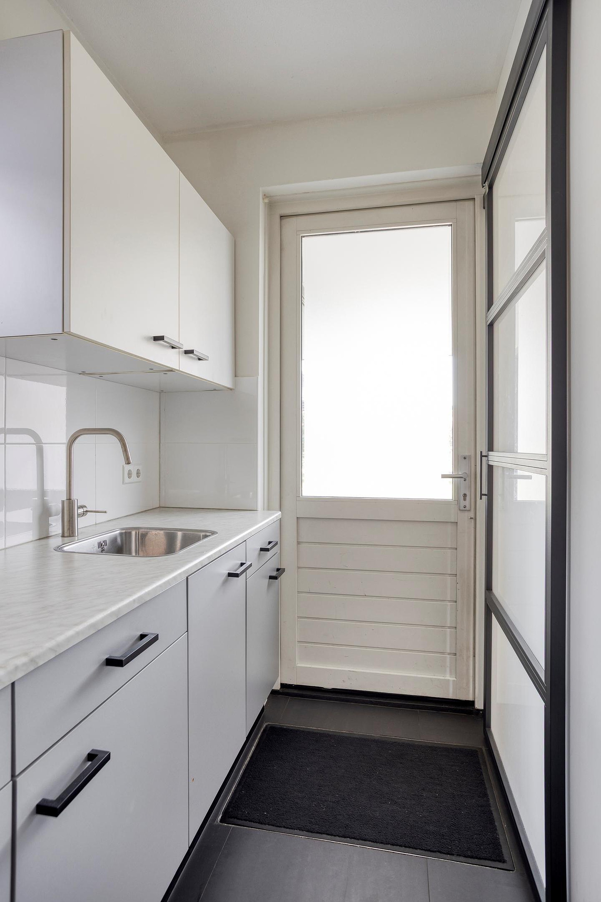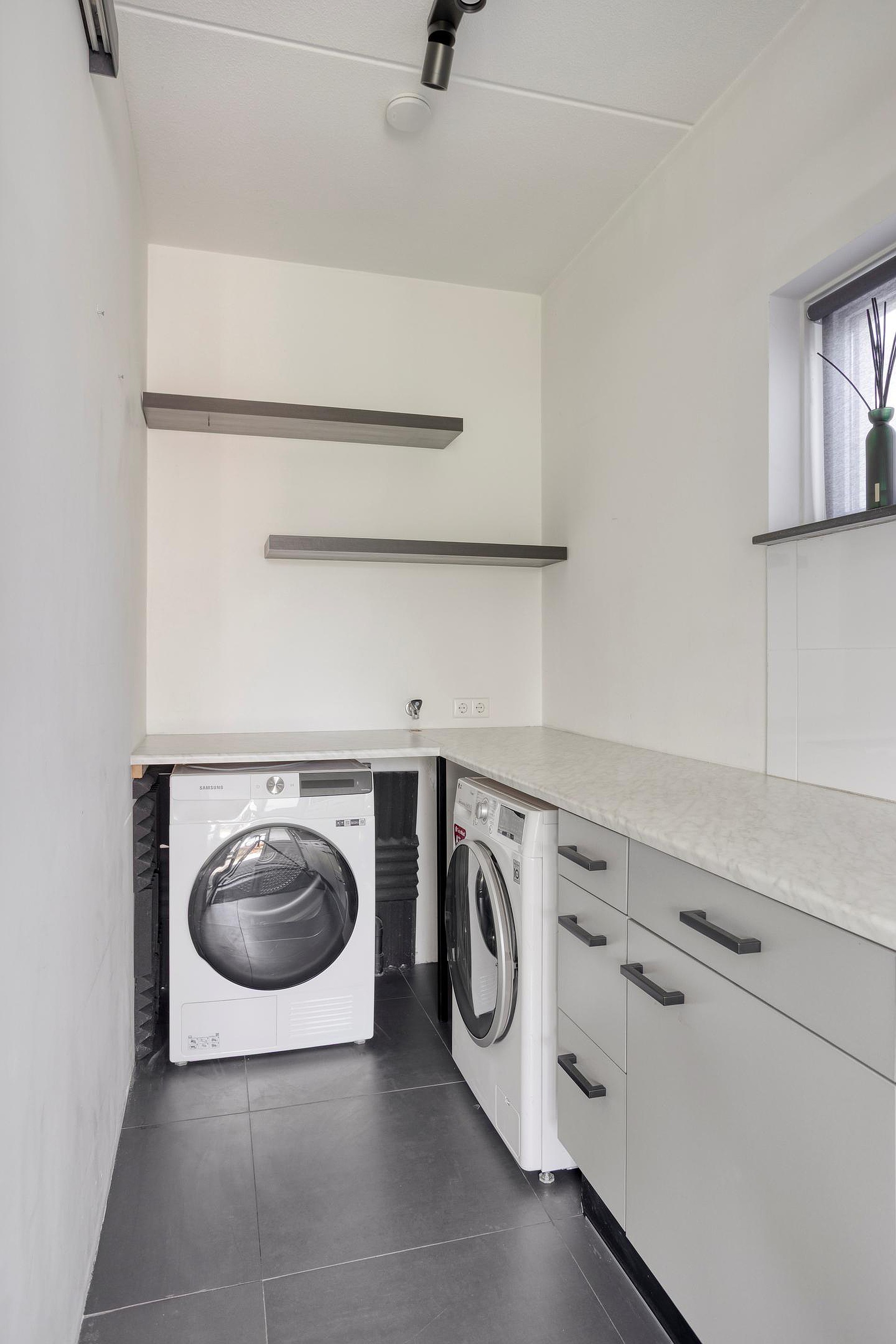 Aansluitend toegang tot de praktische bijkeuken met betegelde vloer, extra werkblad en aansluitingen t.b.v. de wasapparatuur. Deze ruimte is afsluitbaar middels een industriële schuifdeur en biedt tevens toegang tot de tuin.