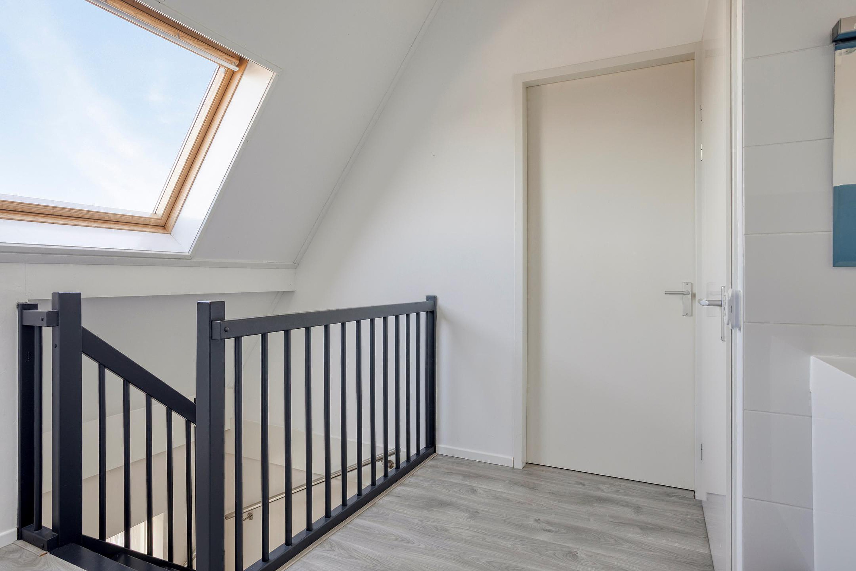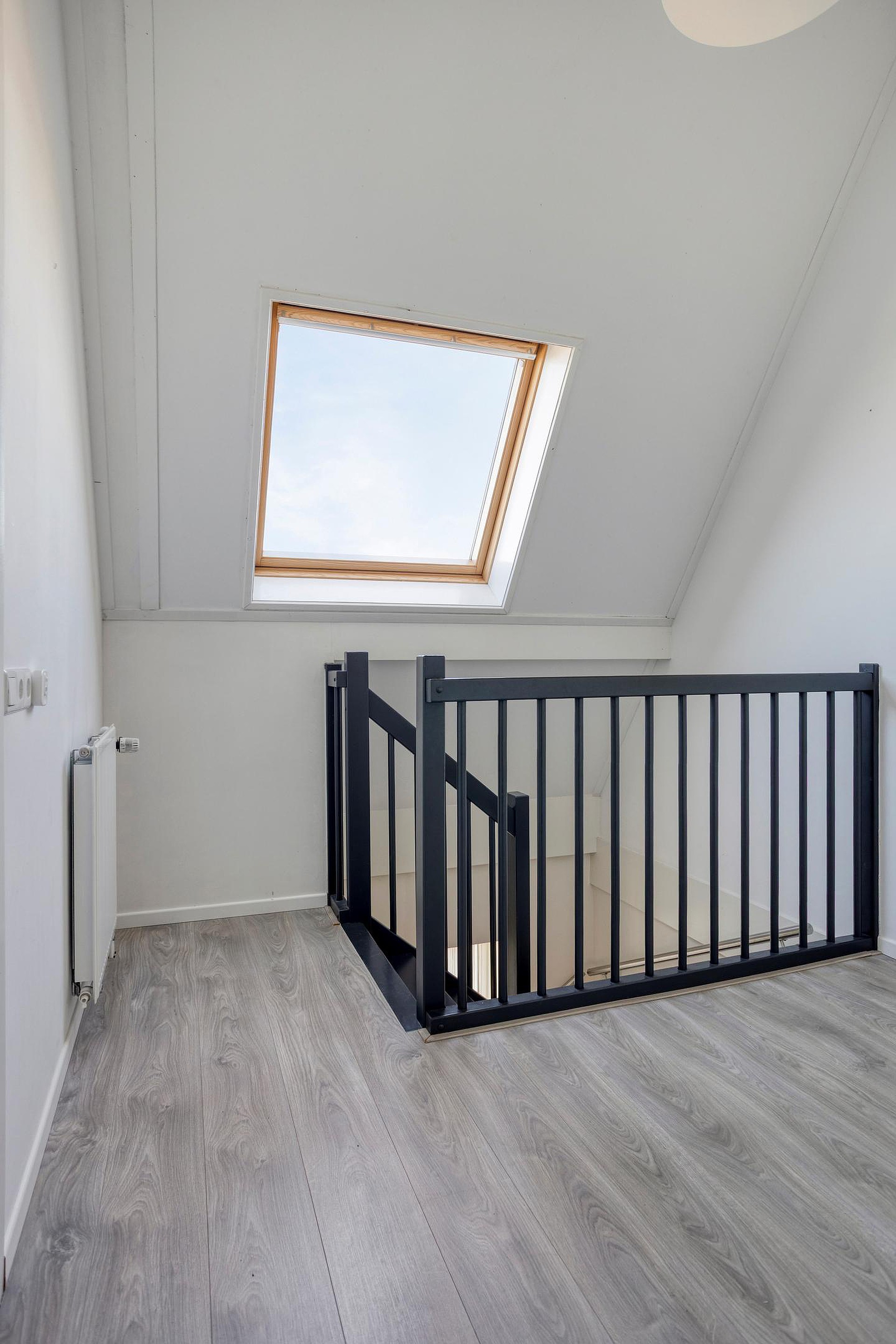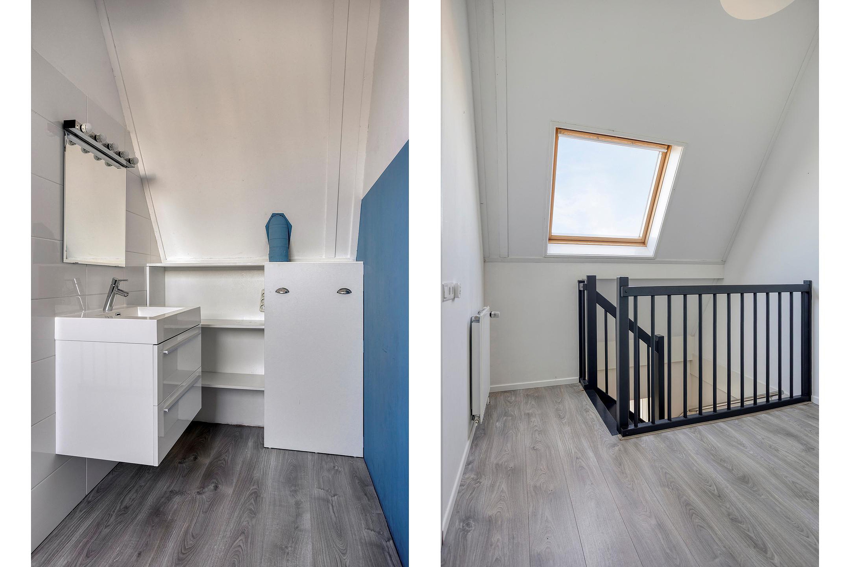 Tweede verdieping Via de vaste trap bereiken we de tweede verdieping. De lichte overloop is afgewerkt met een laminaatvloer, gestucte wanden en plafond en beschikt over een groot Velux dakraam dat zorgt voor aangename lichtinval. Hier bevindt zich een badmeubel met vaste wastafel en kastruimte, met daarachter netjes weggewerkt de mechanische ventilatie-unit. Tevens is er toegang tot de cv-kast met de HR-combiketel van Intergas (bouwjaar 2011).