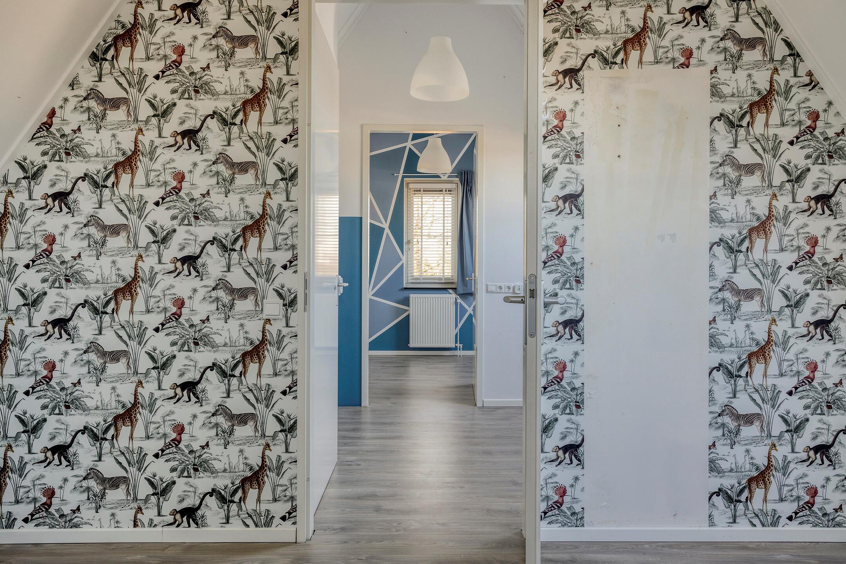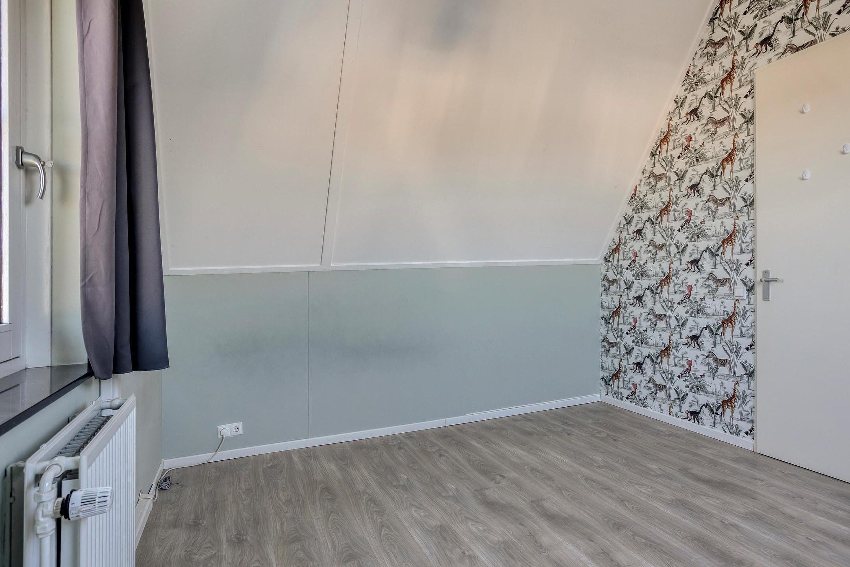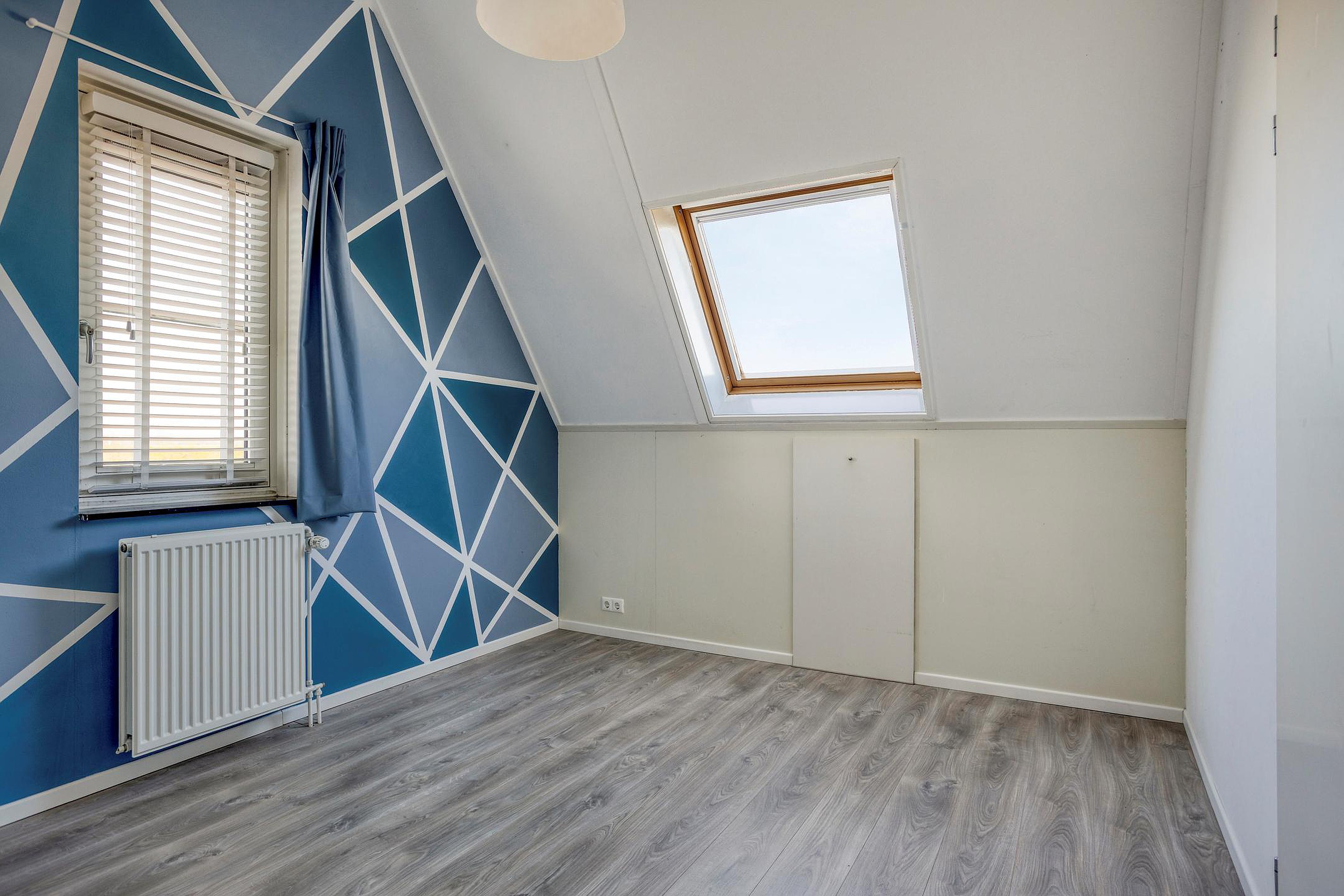 De tweede slaapkamer is eveneens netjes afgewerkt met laminaatvloer, deels stuc- en deels behangwanden, een Velux dakvenster met verduistering en een zijgevelraam. Achter de knieschotten bevindt zich praktische bergruimte.
