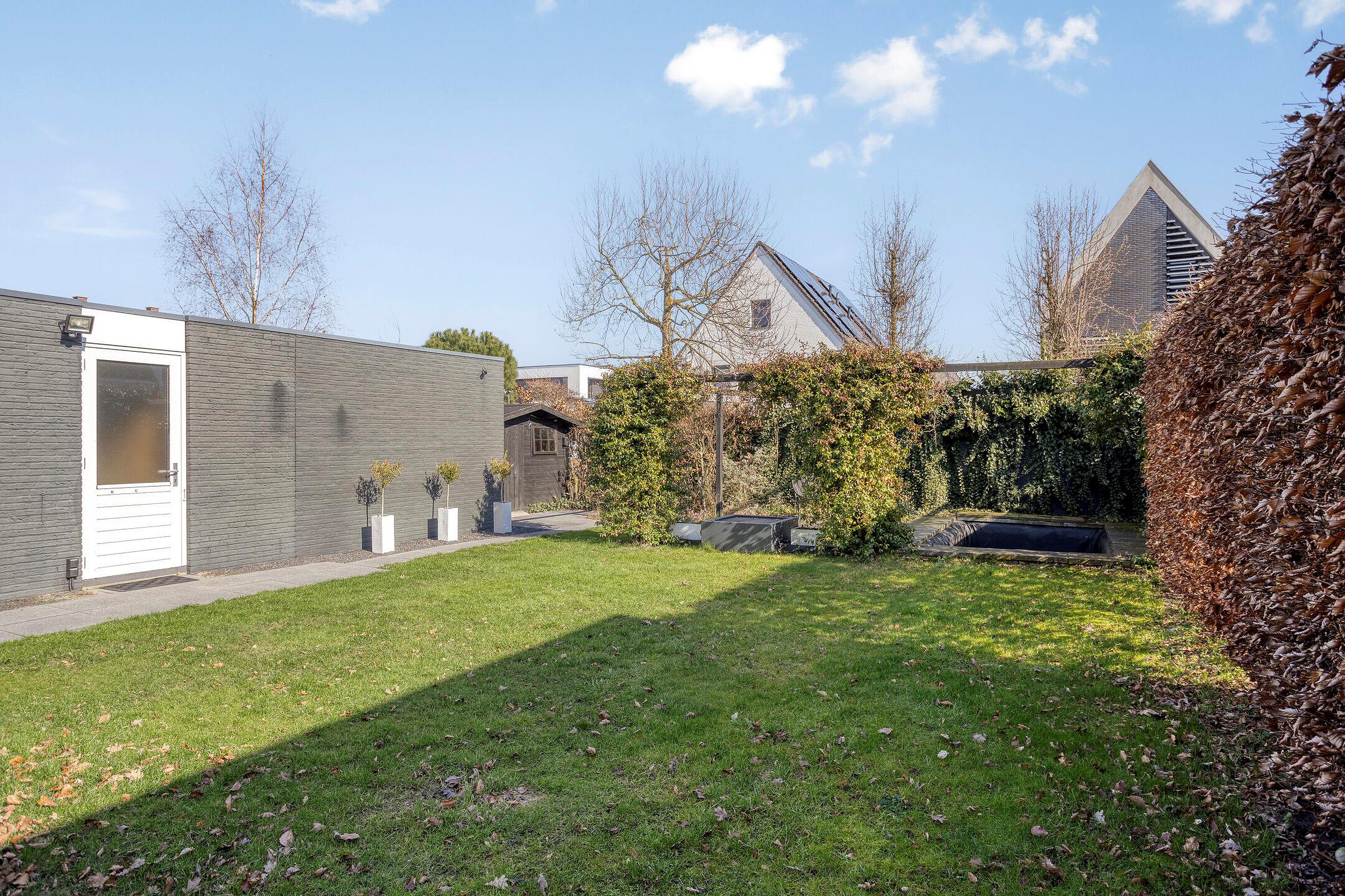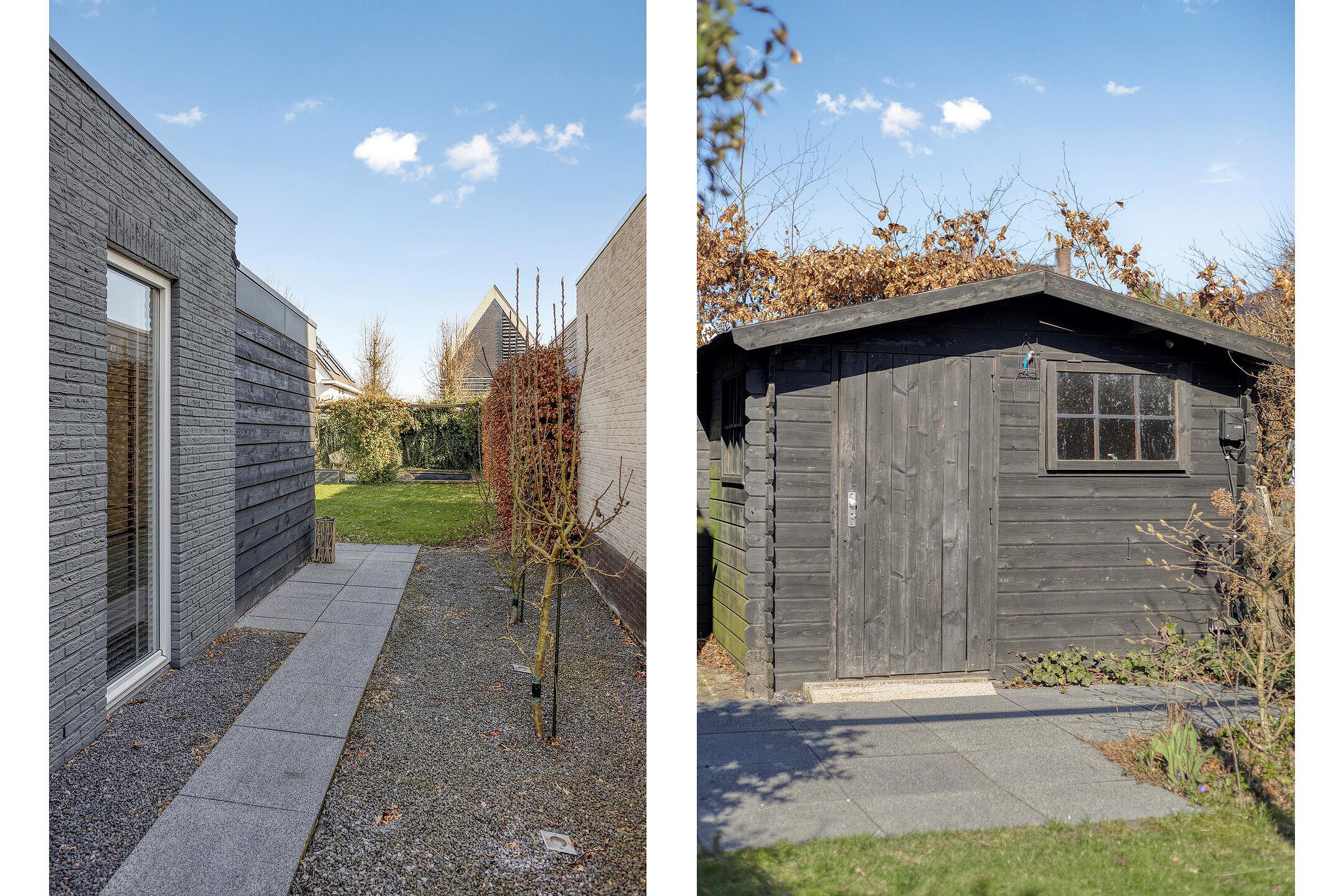 De tuin beschikt verder over een gazon, hagen en vaste beplanting. Daarnaast zijn er een buitenkraan, achterom middels afsluitbare poort (aan de voorzijde). Achter in de tuin staat een houten tuinhuis/berging voor extra opslag.