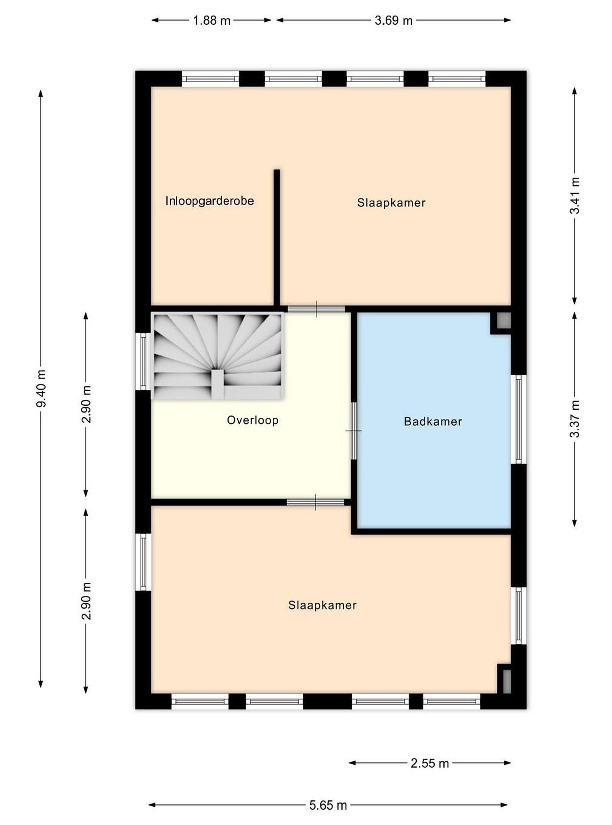 Eerste verdieping Op de overloop treffen we opnieuw een nette afwerking aan met laminaatvloer, gestucte wanden en plafond. Een zijgevelraam zorgt voor extra daglicht. De overloop biedt toegang tot de twee slaapkamers en de badkamer.