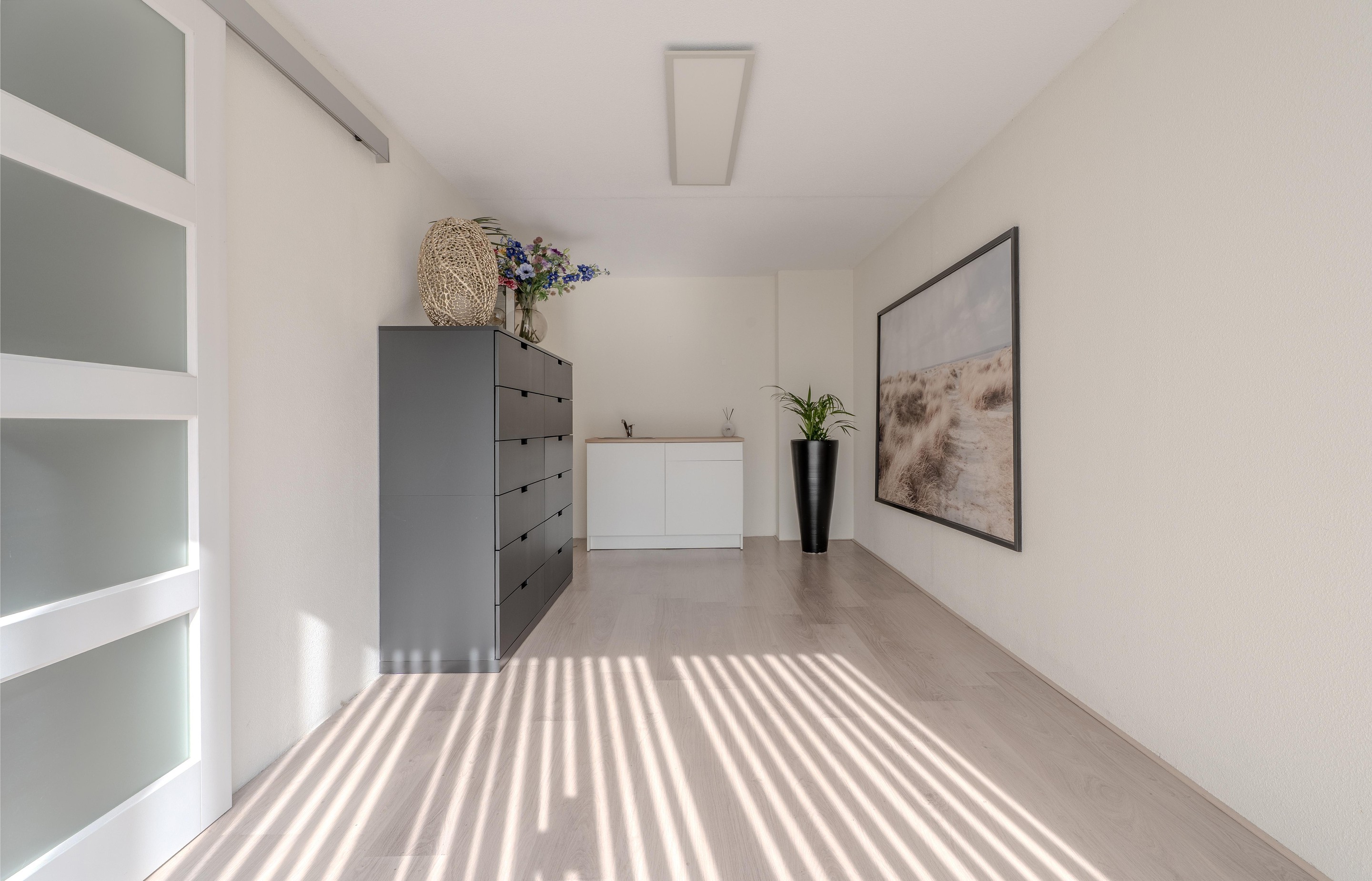 De voormalige garage is volledig bij de woning betrokken en omgebouwd tot extra woonruimte. Door de vaste pui, verwarming en goede isolatie is hier een volwaardige kamer ontstaan die uitstekend kan dienen als bijvoorbeeld een werkruimte, speelkamer of slaapkamer. Ook deze ruimte is afgewerkt met een laminaatvloer en biedt toegang tot een extra bergkast onder de trap.