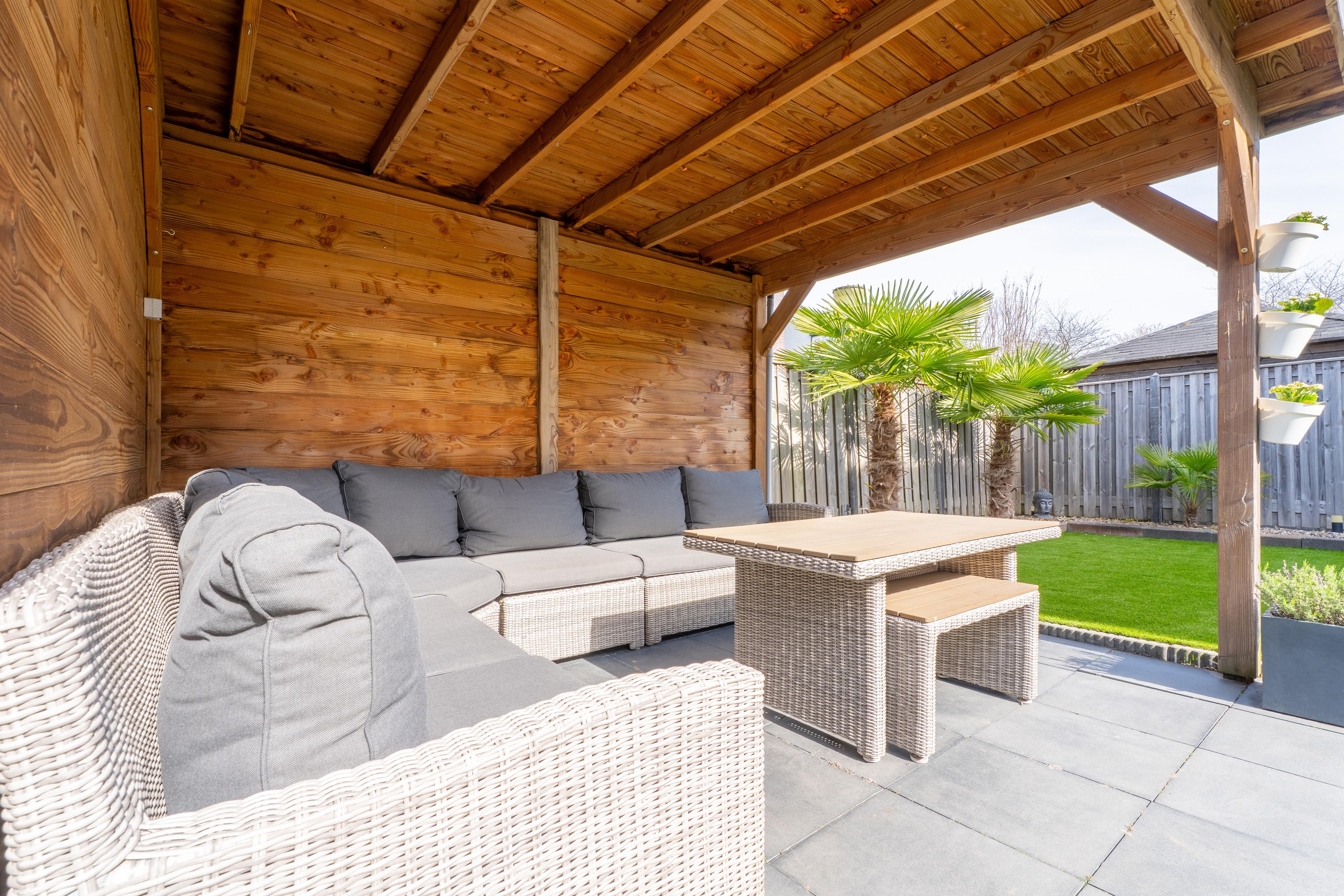 De achtertuin is ruim opgezet en biedt volop privacy. Onder de sfeervolle overkapping is het hier heerlijk genieten van lange zomeravonden en het buitenleven.