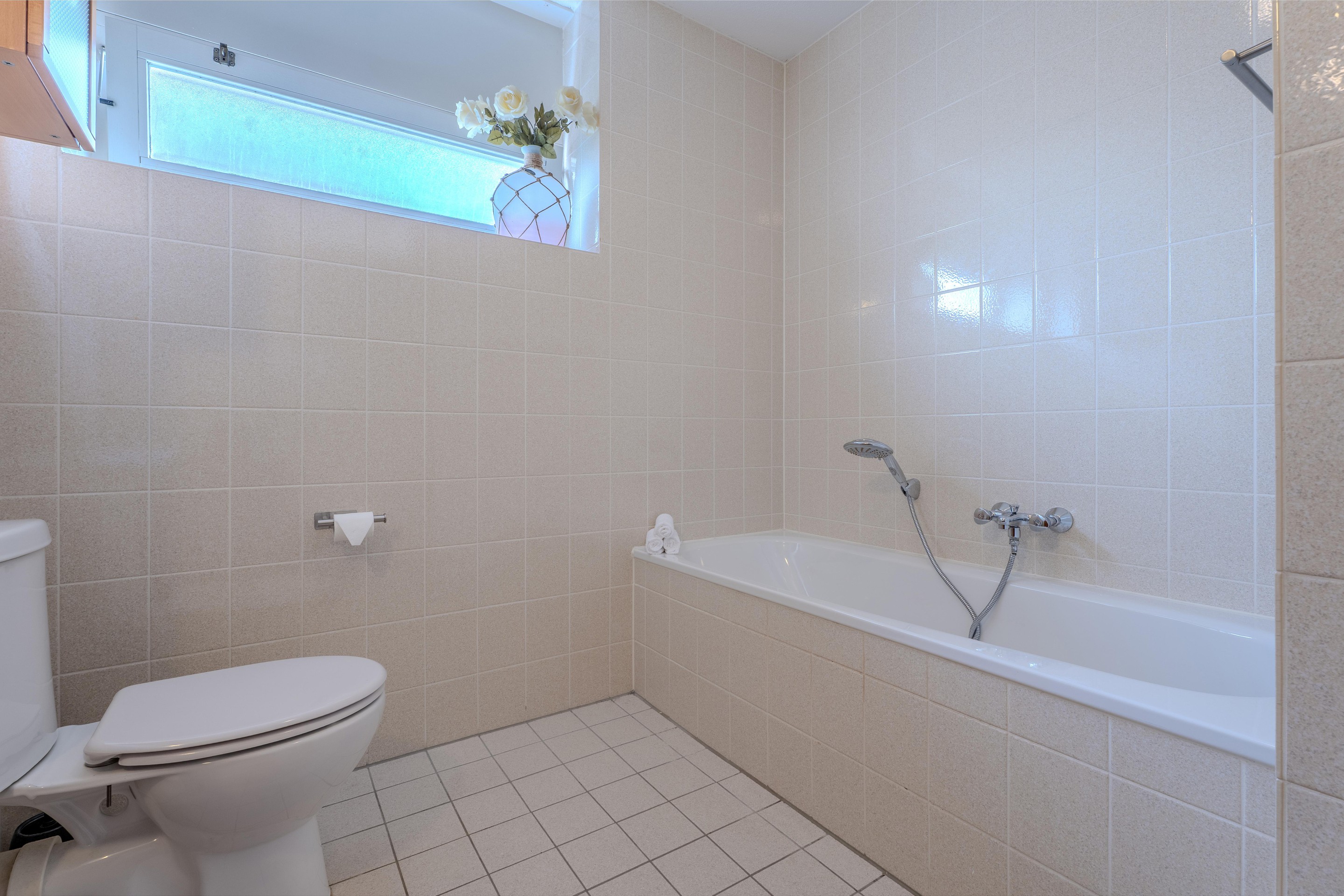 De ruime inpandige badkamer is volledig betegeld en uitgerust met een ligbad, een douchecabine, een staand toilet en een dubbele wastafel met meubel.