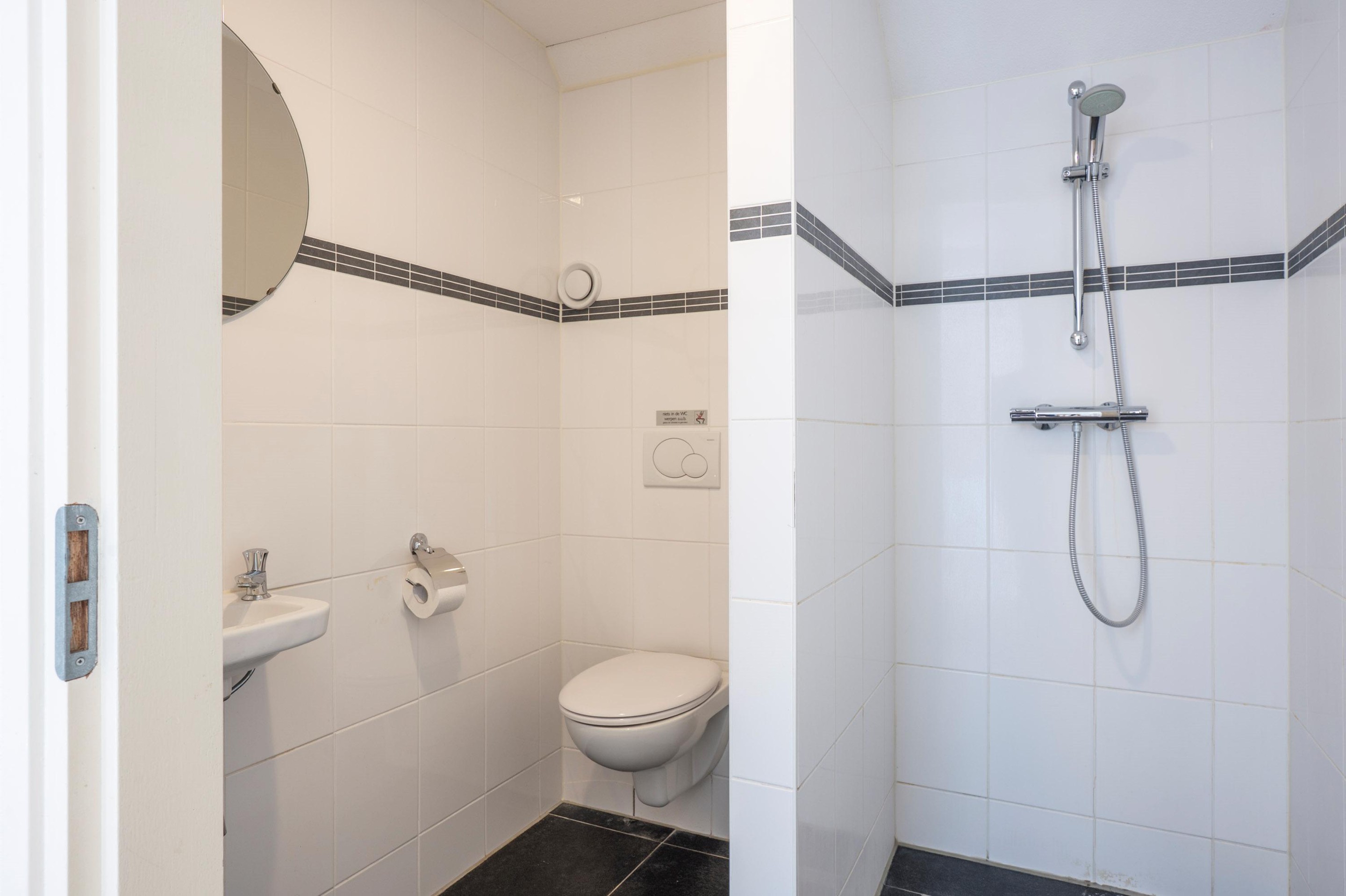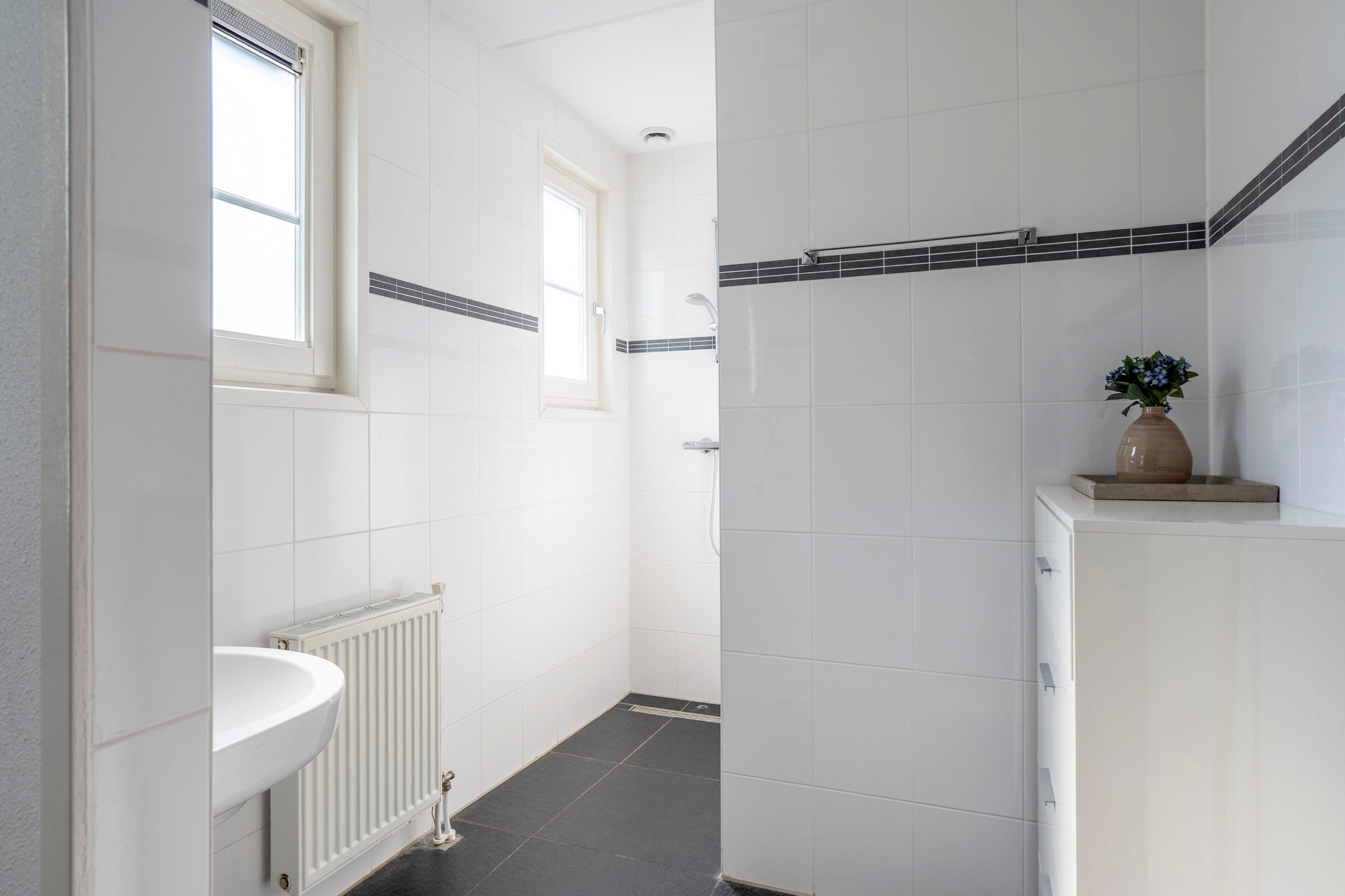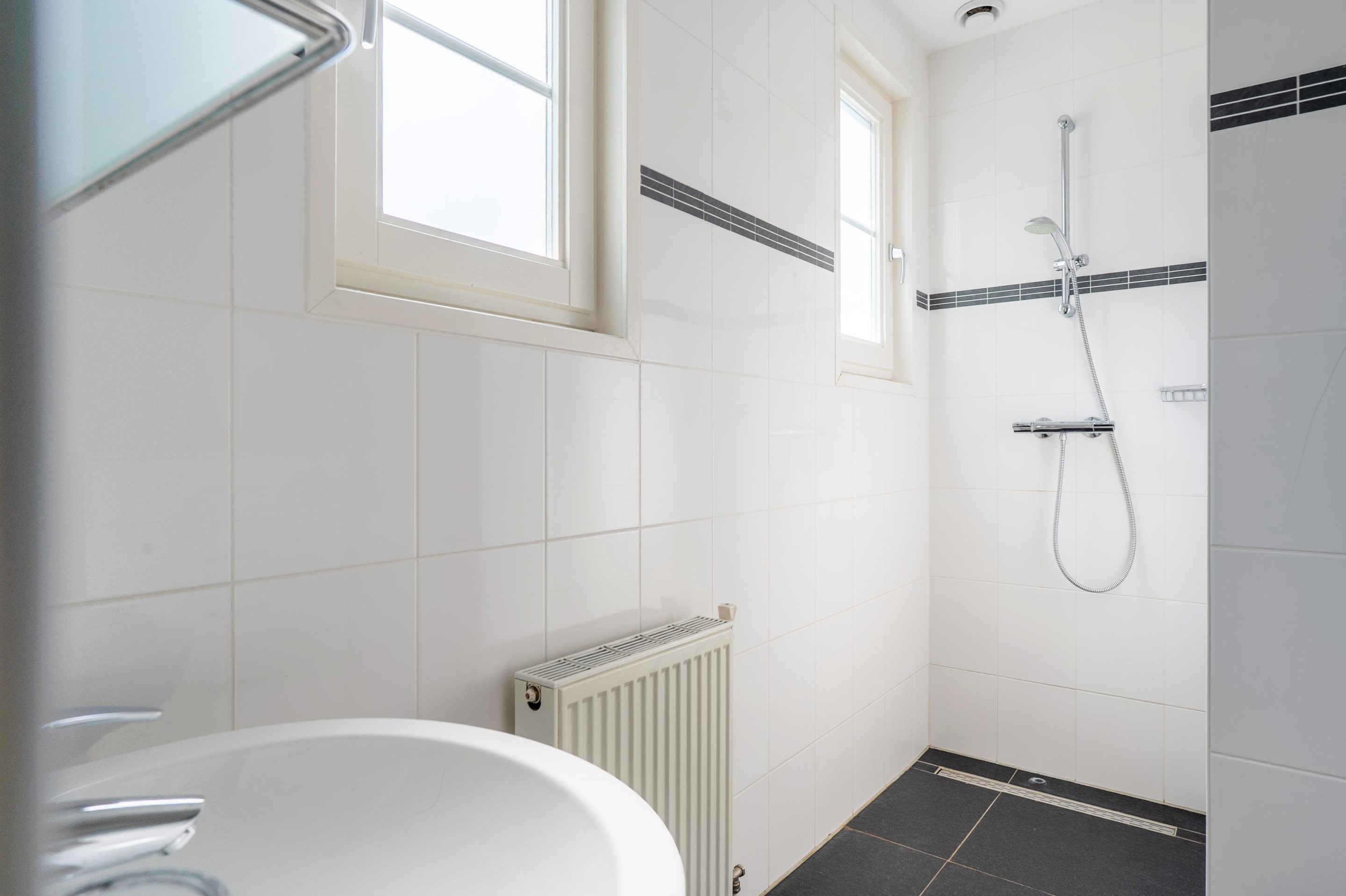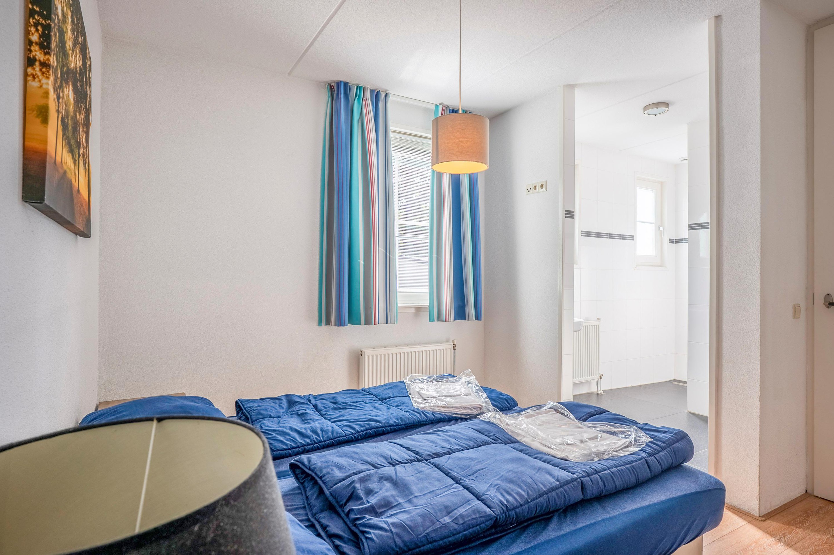Slaapkamer met en-suite badkamer welke voorzien is van een wastafel en een inloopdouche.