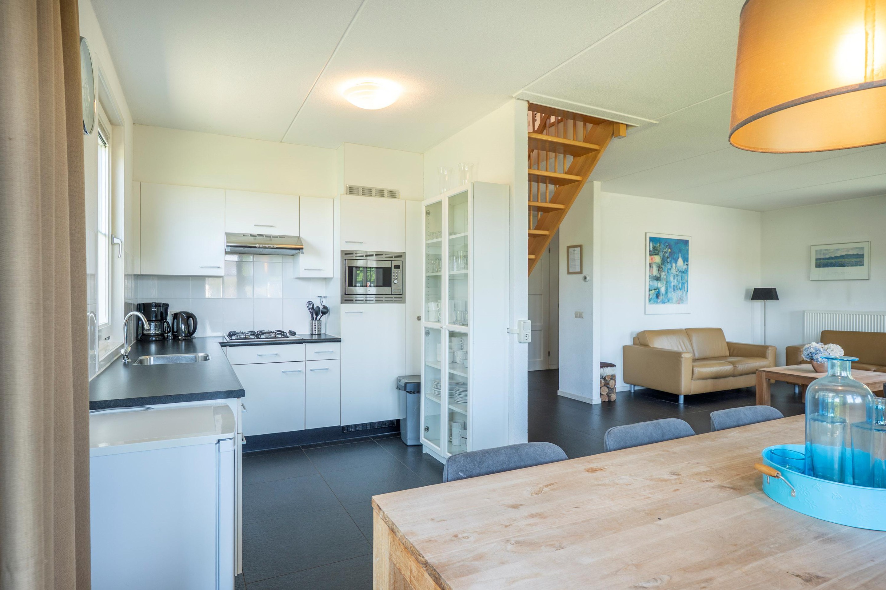 Ruime living verdeeld in een zit-en eetgedeelte. Open keuken voorzien van de volgende inbouwapparatuur: gasfornuis, afzuigkap, vaatwasser, koelkast, diepvries? en een combi-oven.