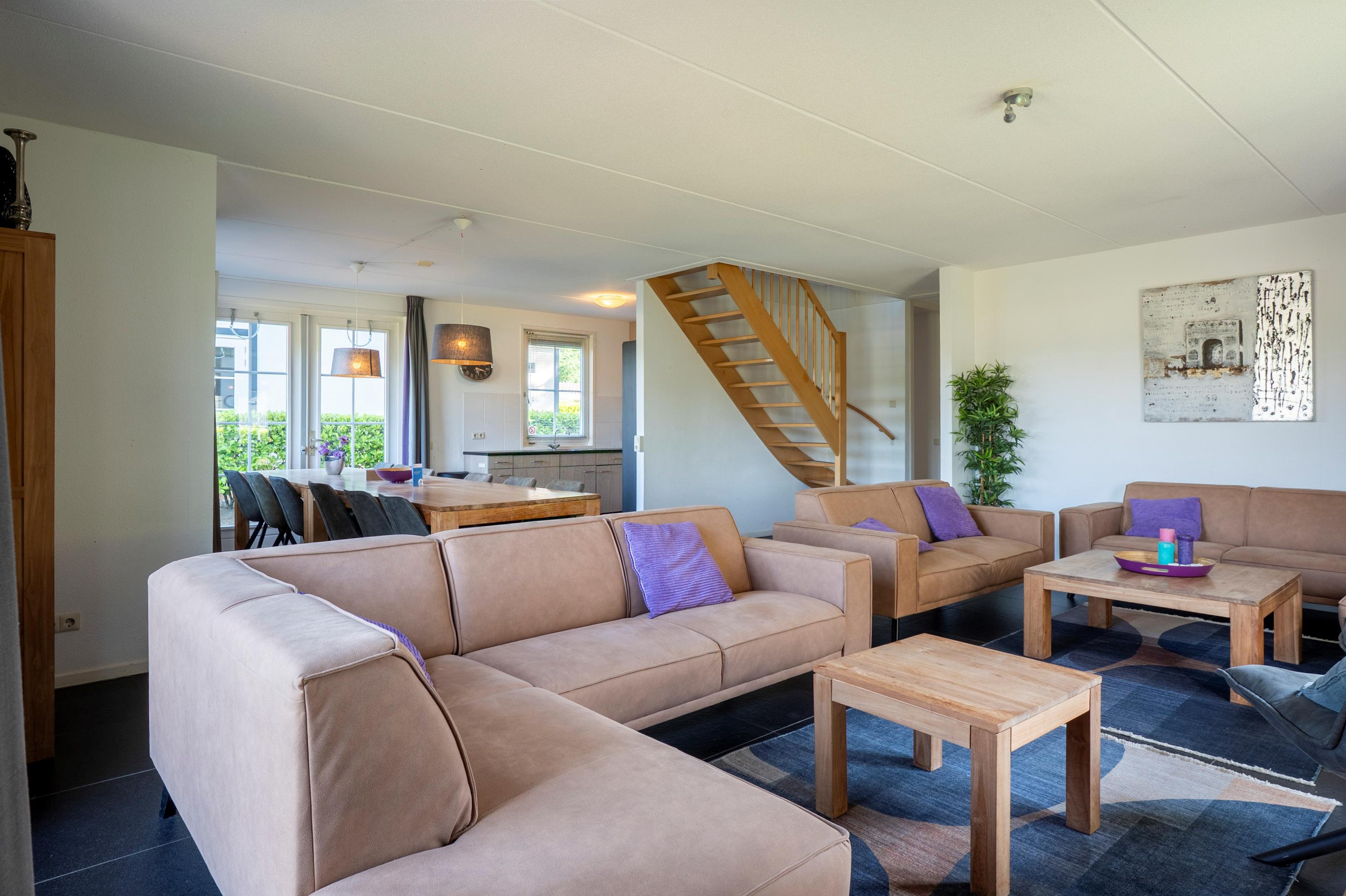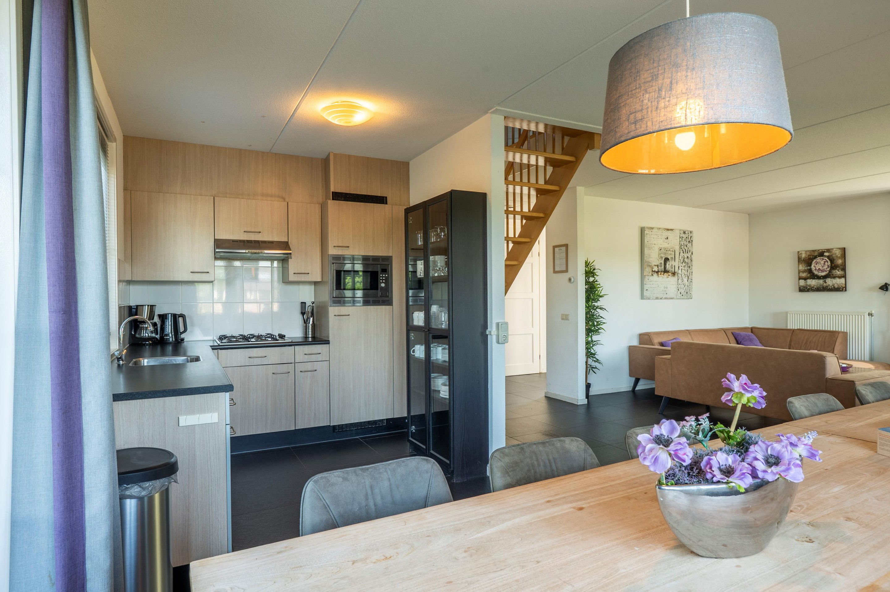 Ruime living verdeeld in een zit-en eetgedeelte. Open keuken voorzien van de volgende inbouwapparatuur: gasfornuis, afzuigkap, vaatwasser, koelkast, diepvries? en een combi-oven.
