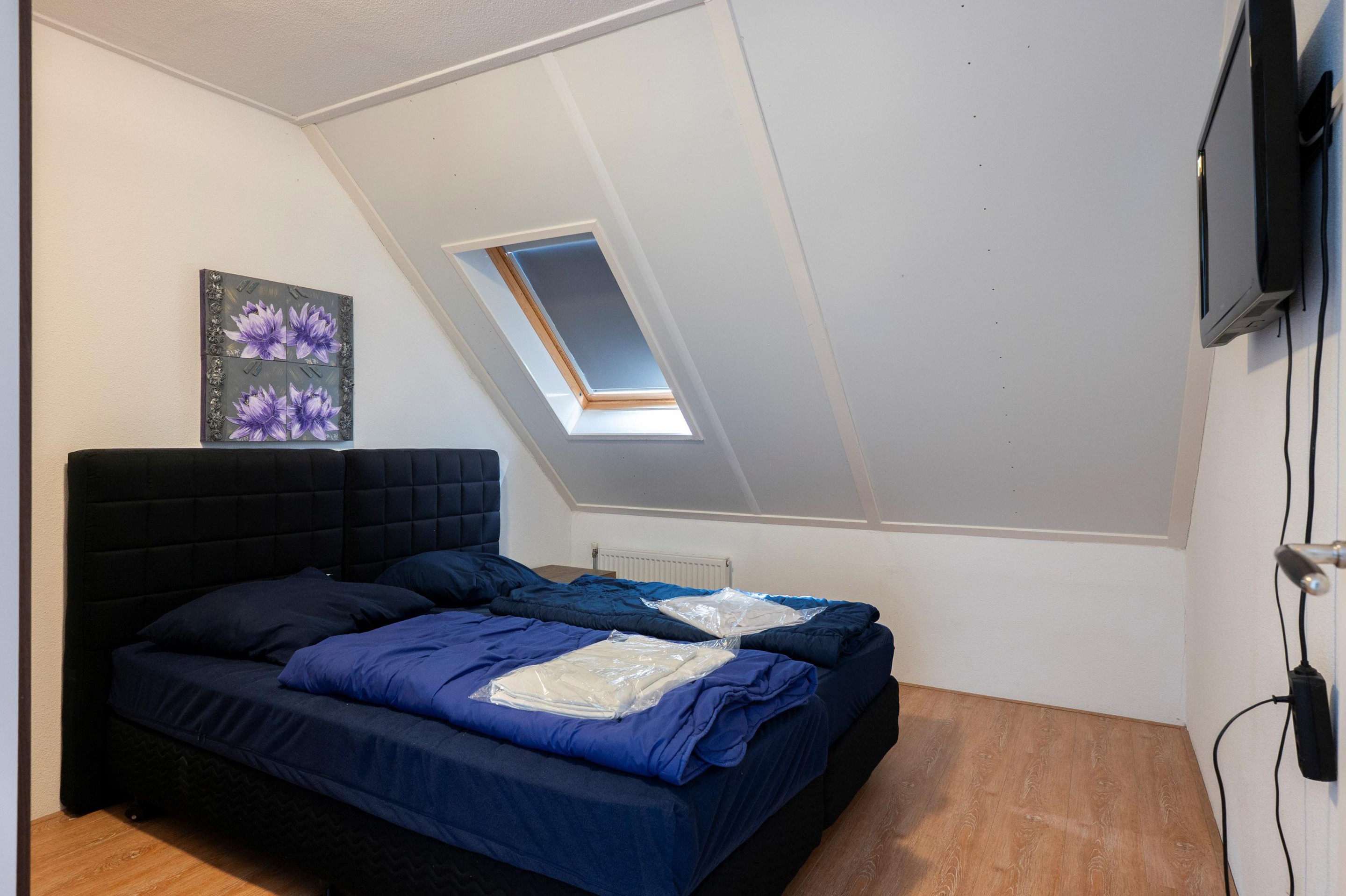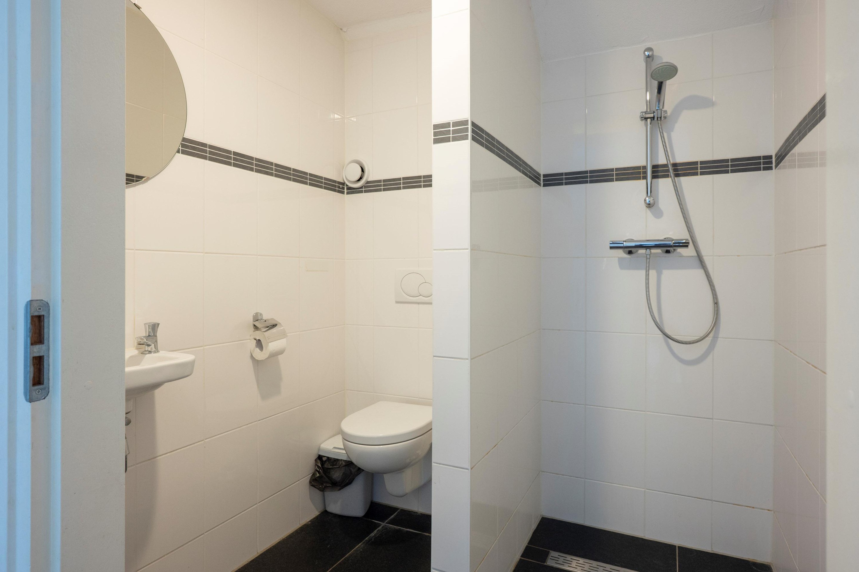 Slaapkamer met en-suite badkamer welke voorzien is van een wastafel en een inloopdouche.