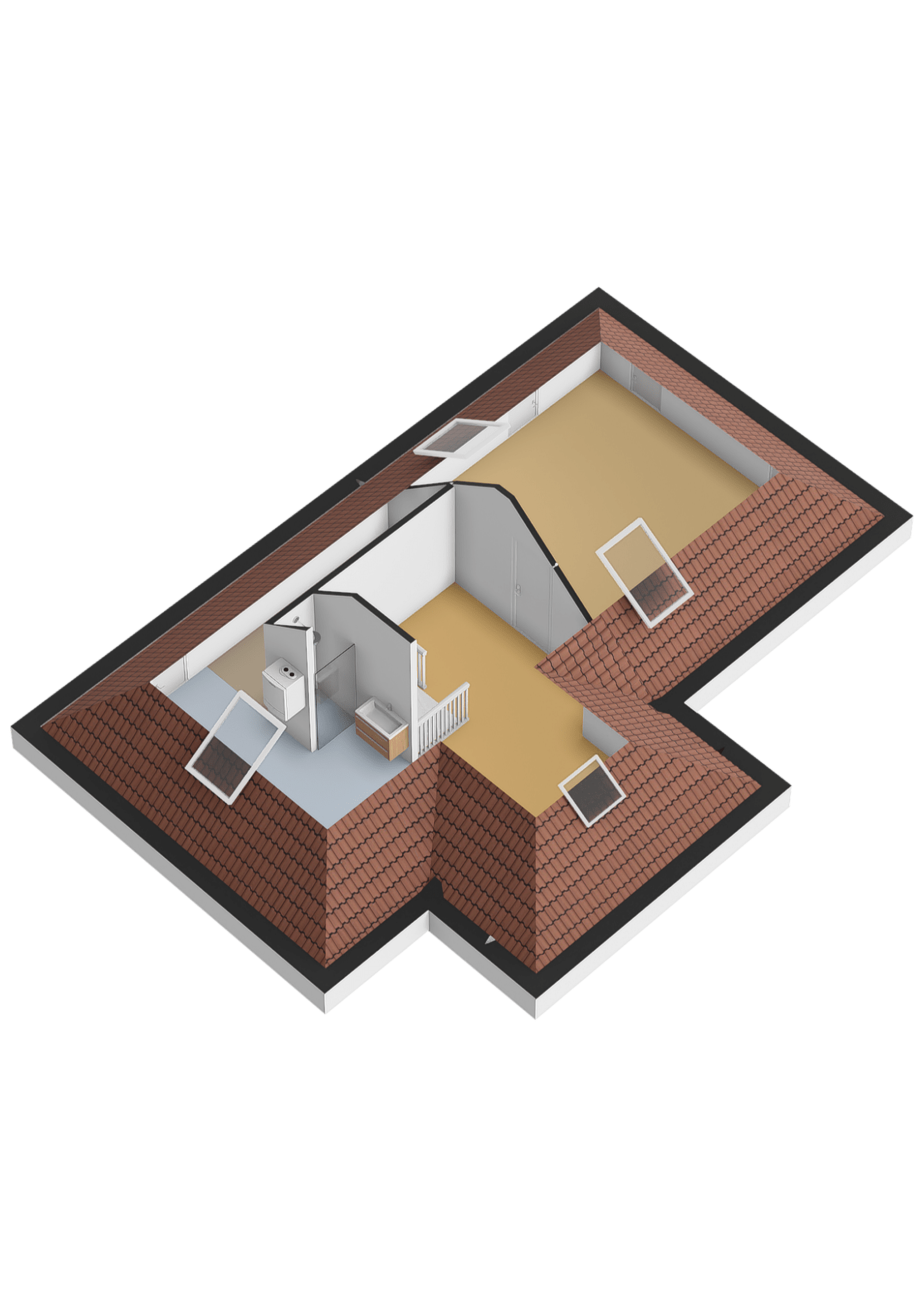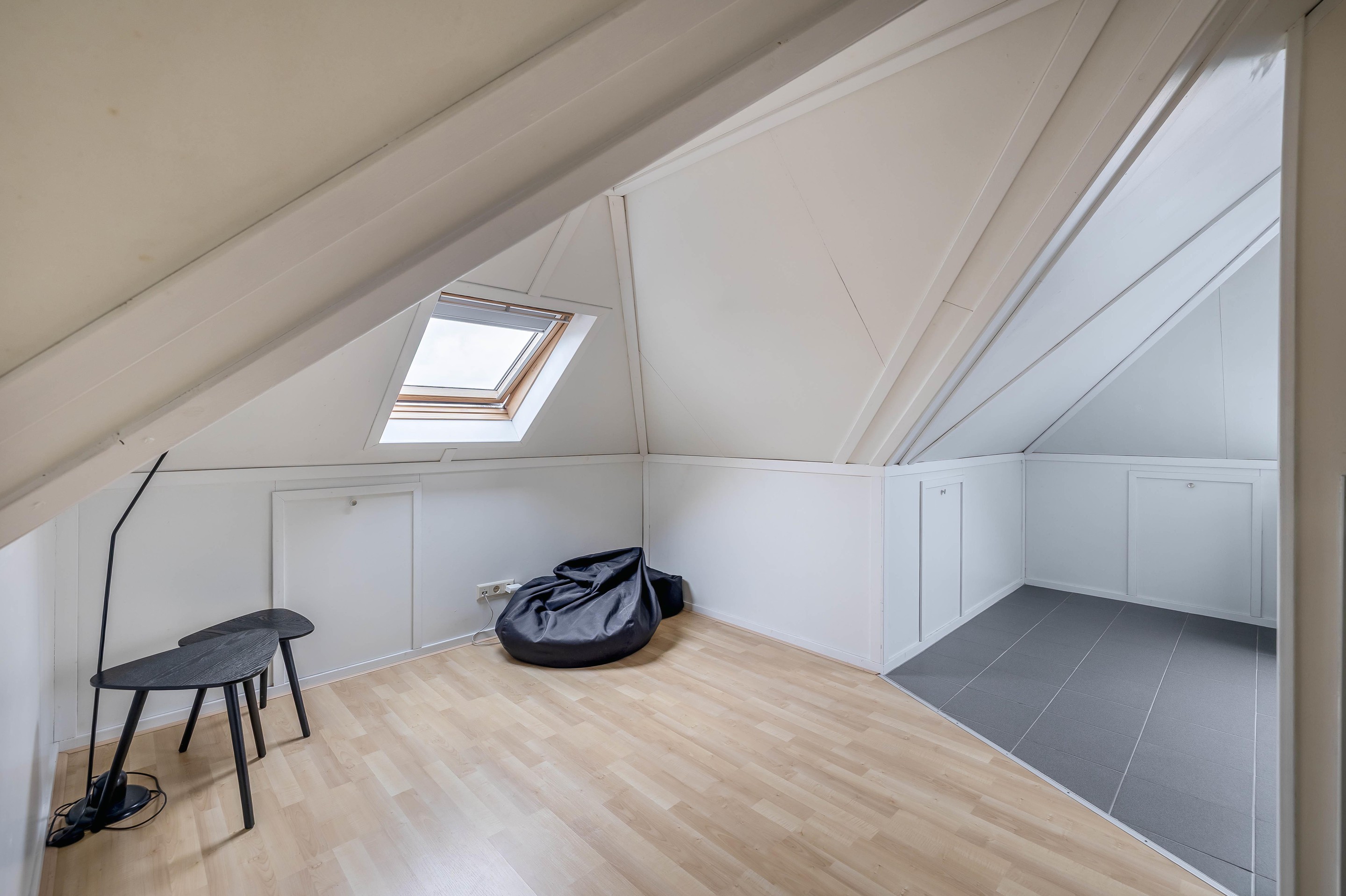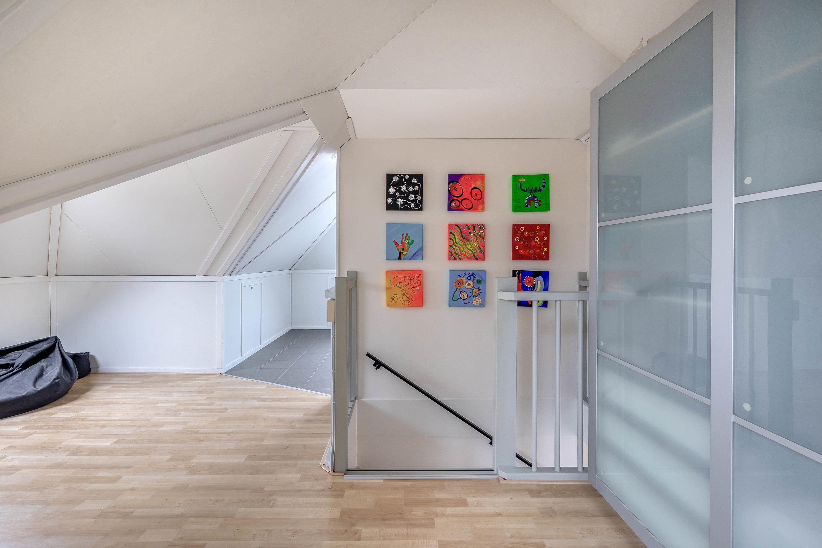 Tweede verdieping De zolder verdieping van de woning is slim ingedeeld en biedt veel ruimte. Bij het betreden van deze verdieping kom je op de ruime overloop, waar de kapconstructie goed zichtbaar is en een open gevoel geeft door de dakramen.