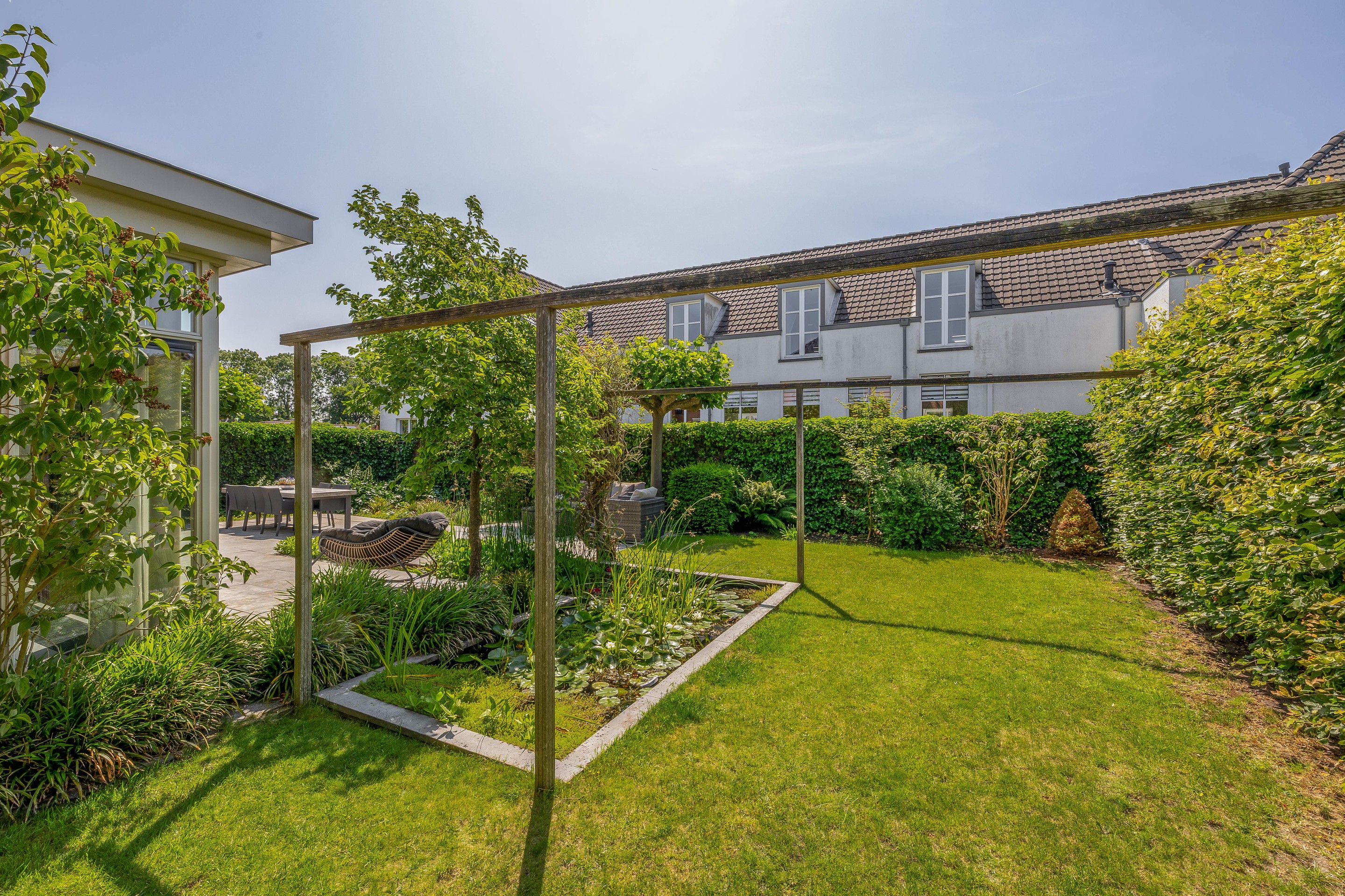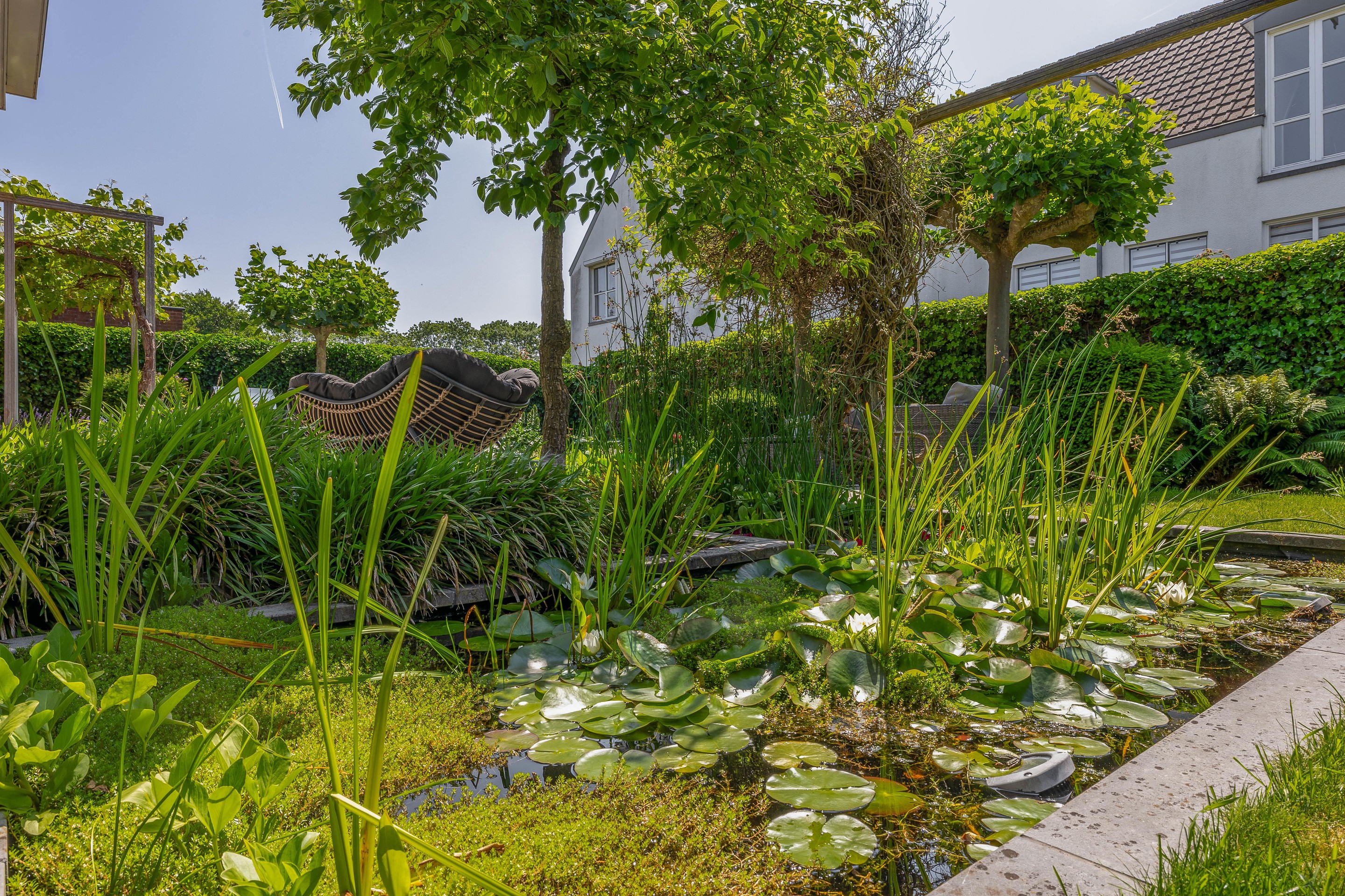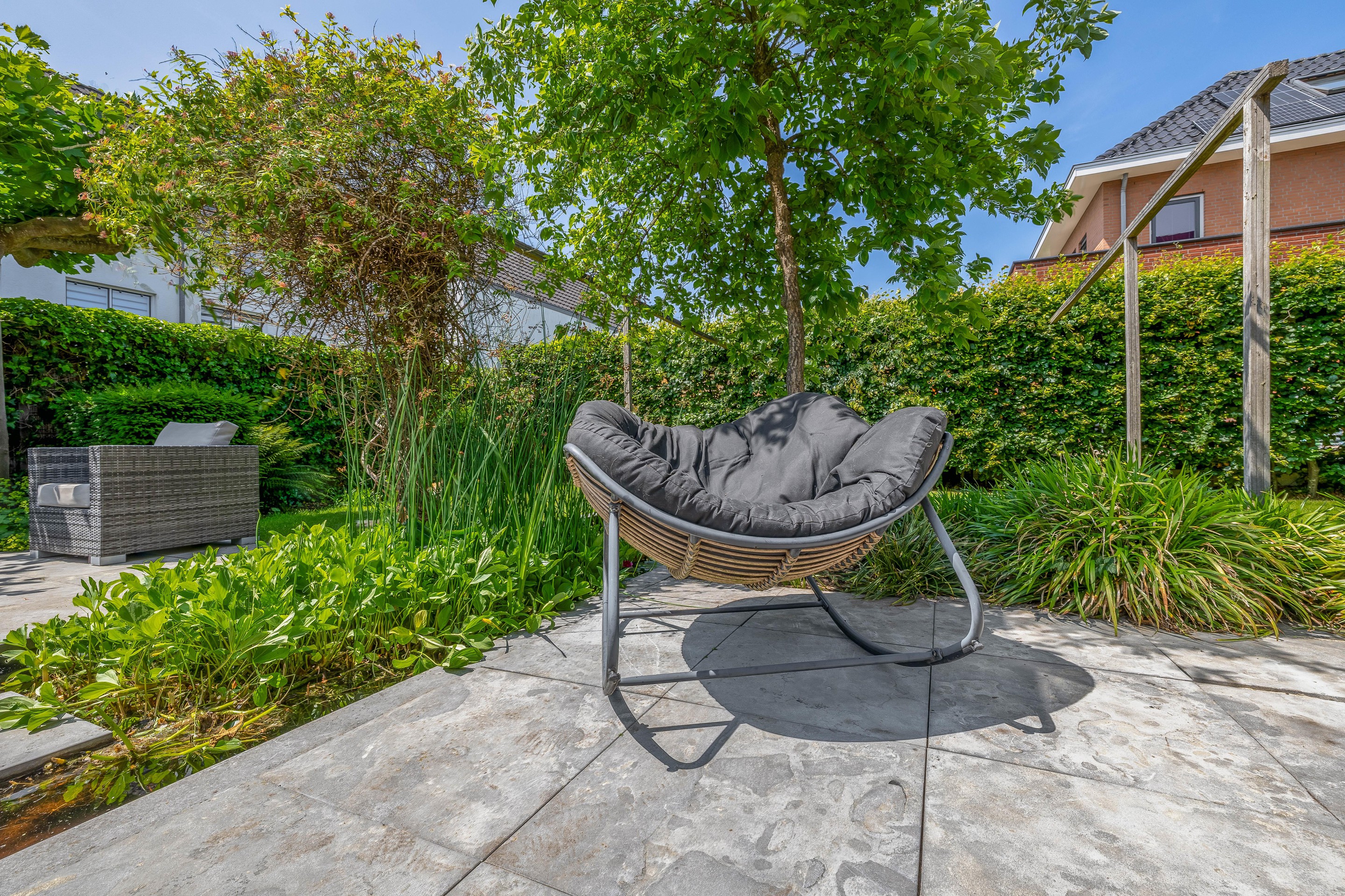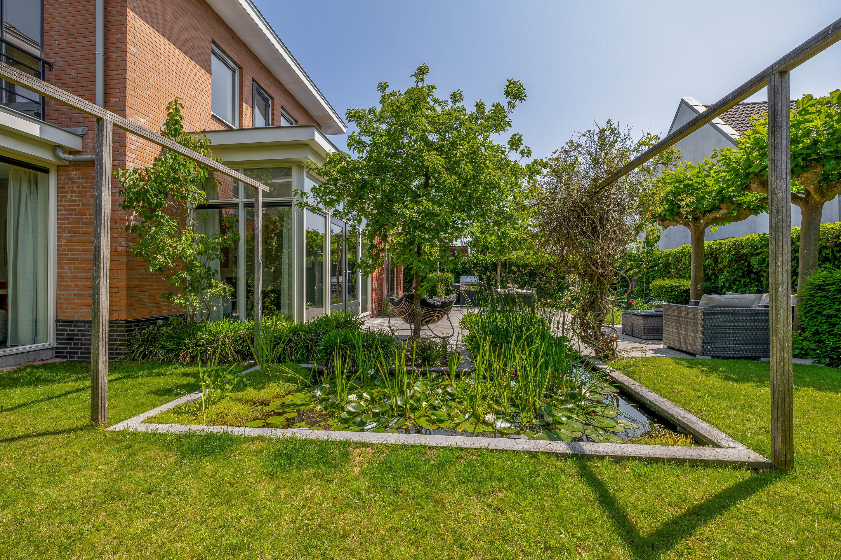 Tuin De woning is omgeven door een verzorgde tuin met veel groen en diverse terrassen. Aan de achterzijde bevindt zich een kleine siervijver, en dankzij de ligging op het zuiden is de achtertuin de hele dag zonnig. Voor extra gemak is er aan de zijkant van het huis een overkapping om tuinkussens droog op te bergen.