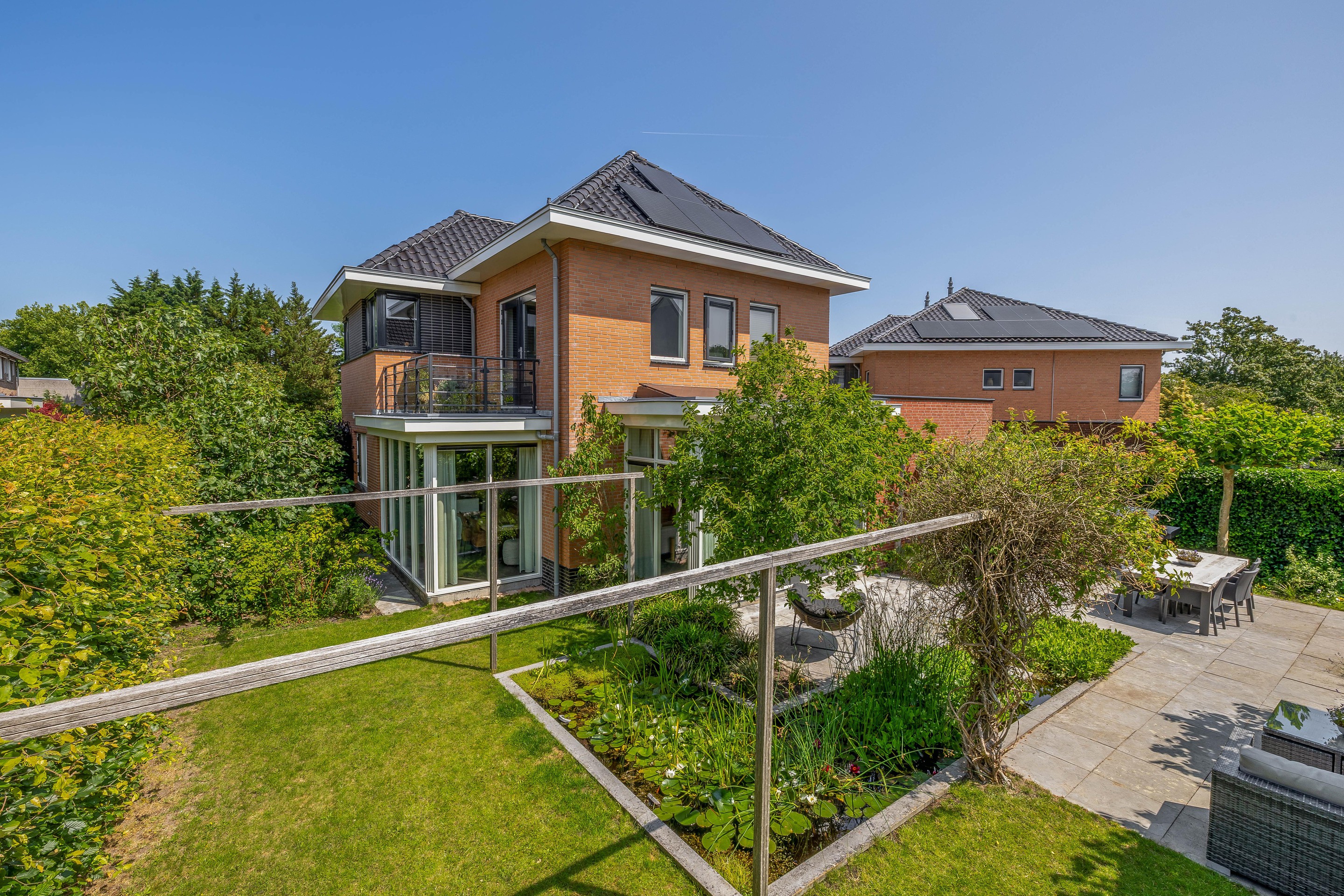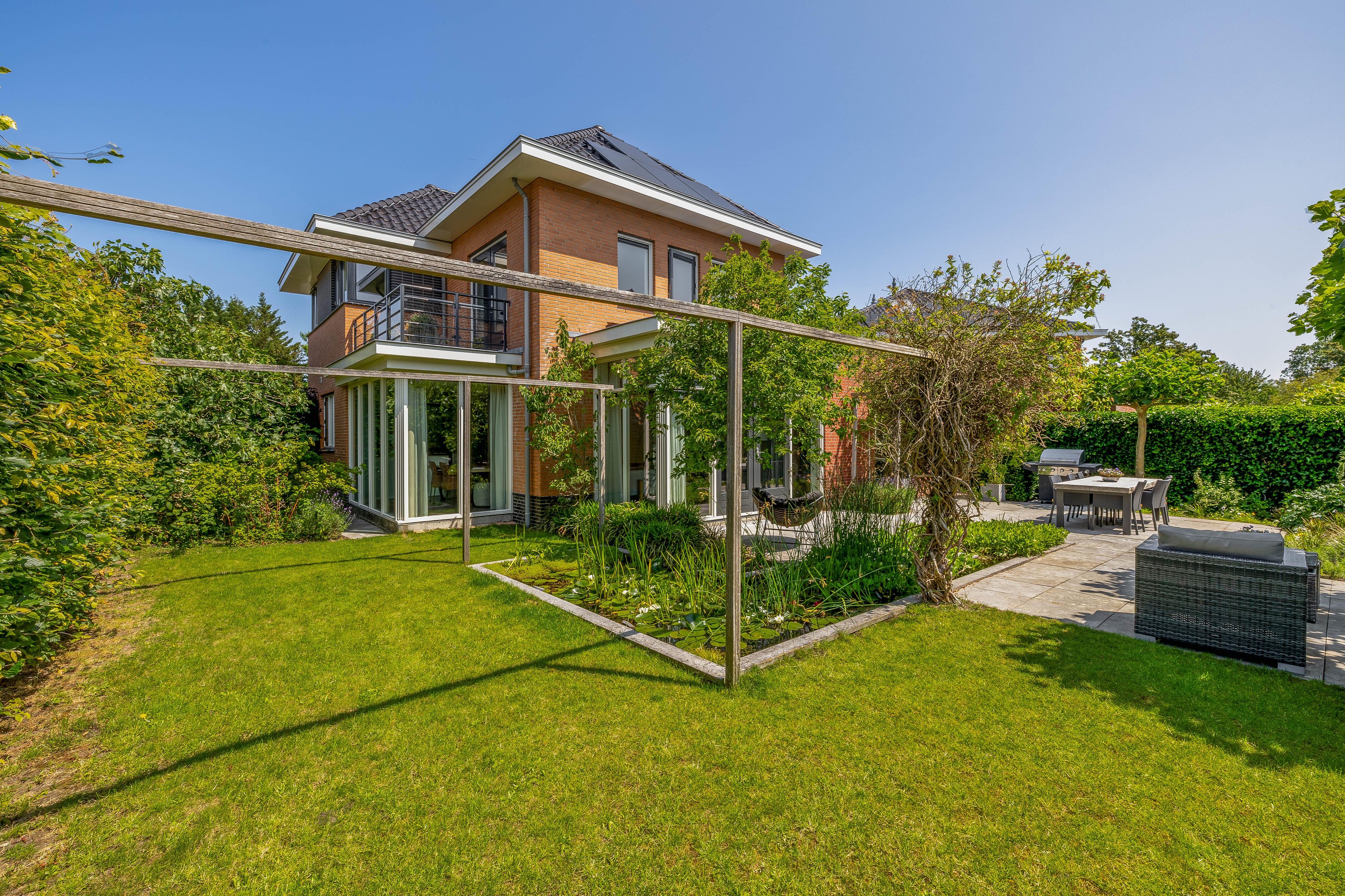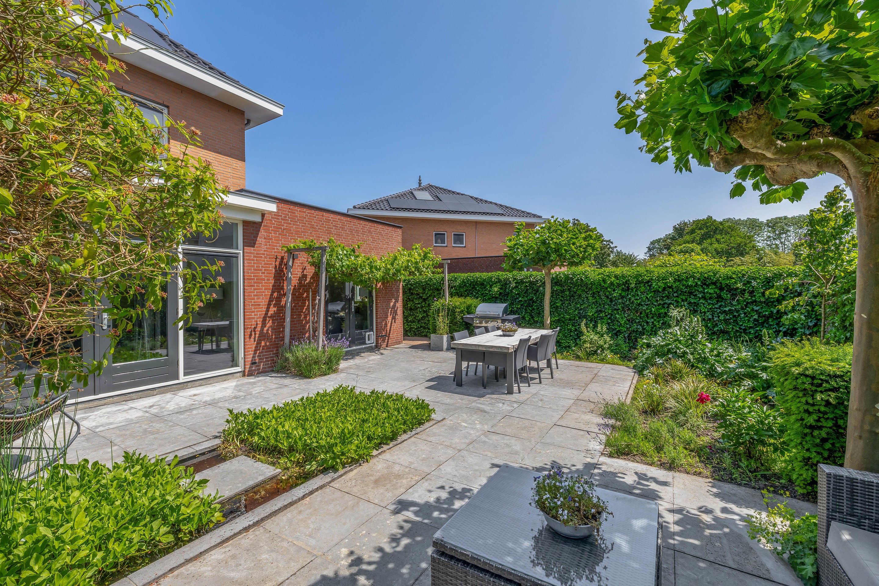 Tuin De woning is omgeven door een verzorgde tuin met veel groen en diverse terrassen. Aan de achterzijde bevindt zich een kleine siervijver, en dankzij de ligging op het zuiden is de achtertuin de hele dag zonnig. Voor extra gemak is er aan de zijkant van het huis een overkapping om tuinkussens droog op te bergen.