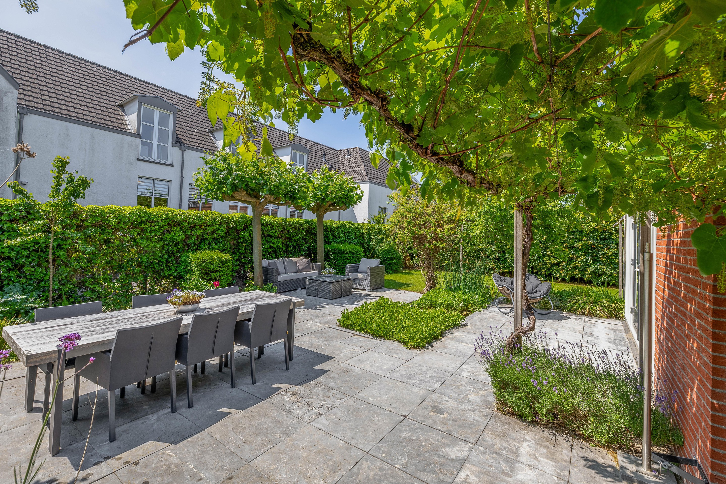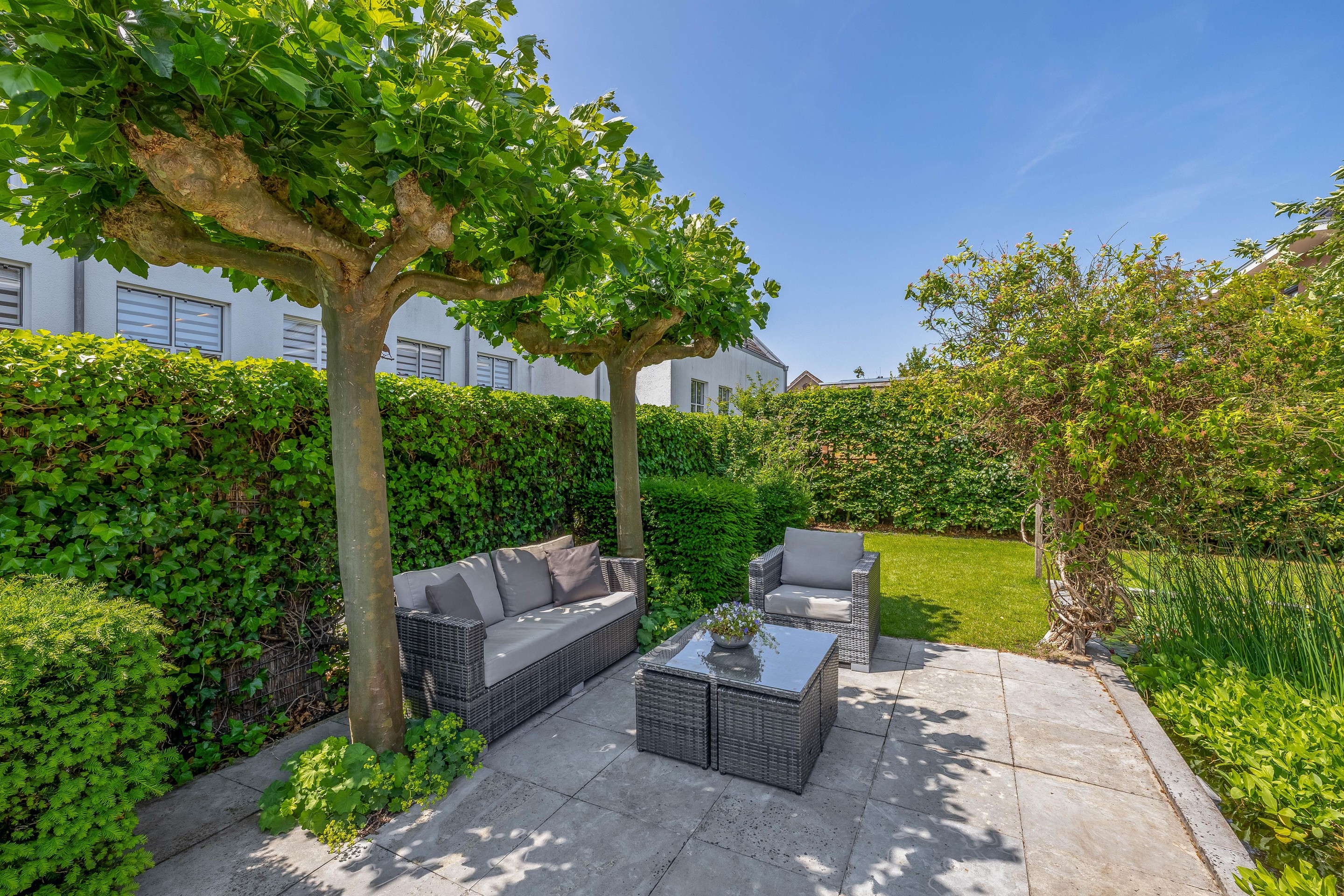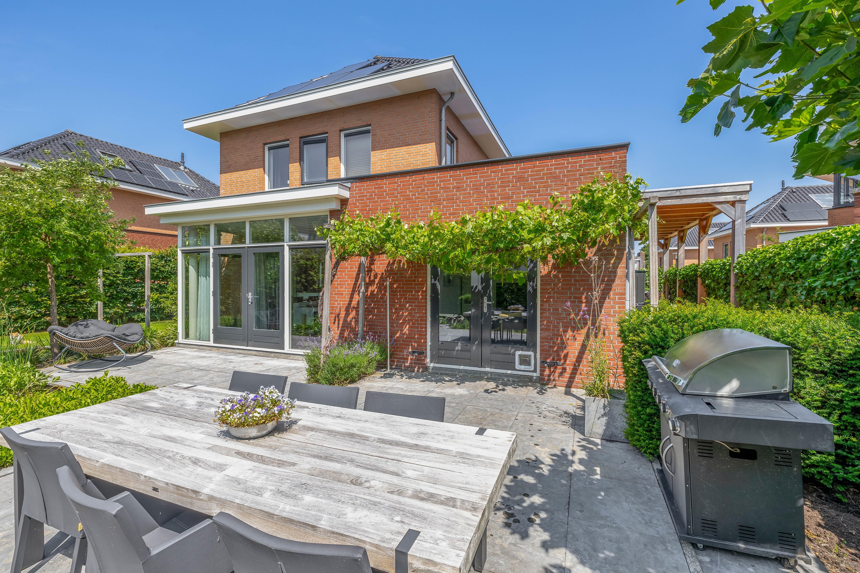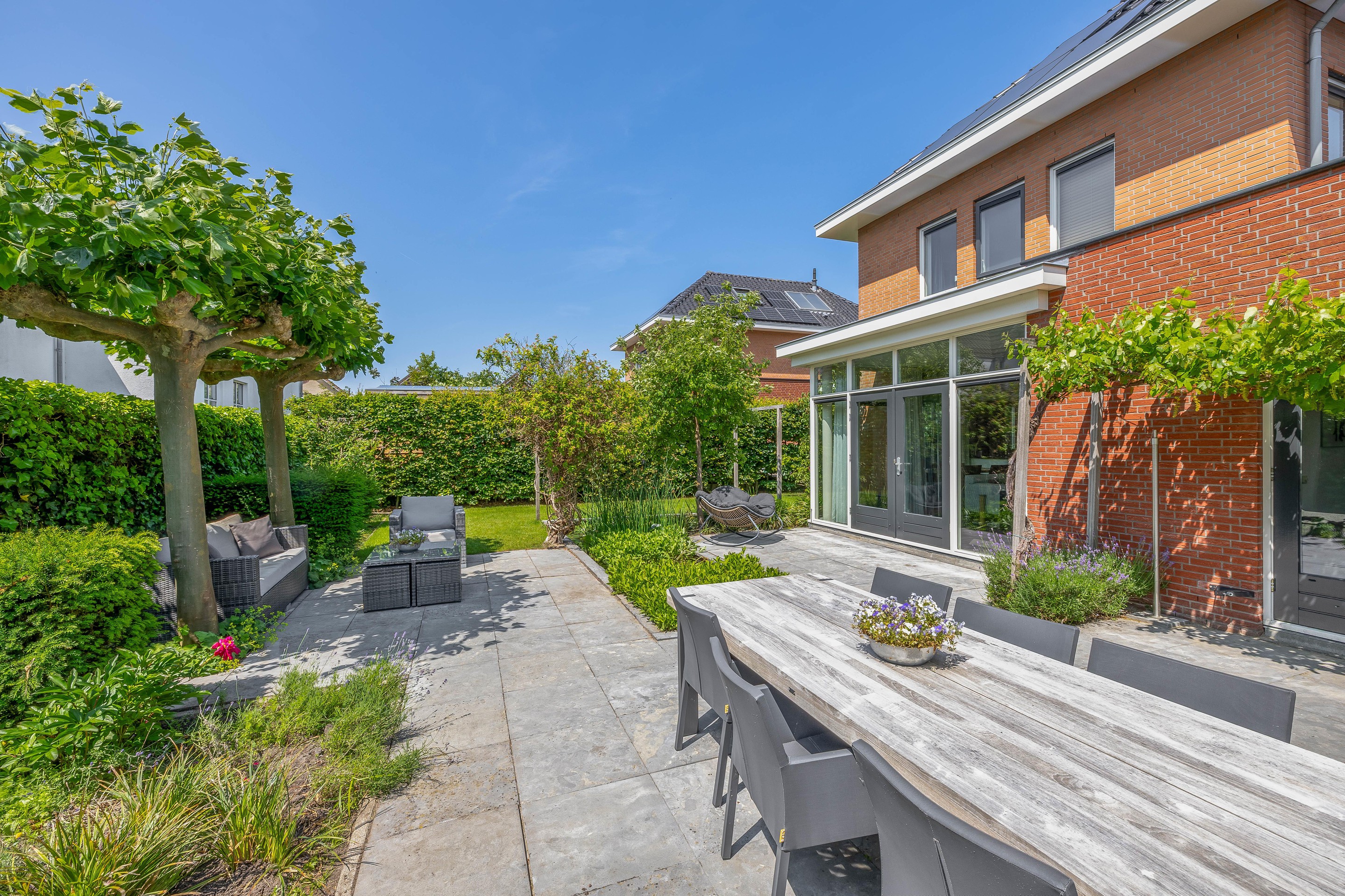 Tuin De woning is omgeven door een verzorgde tuin met veel groen en diverse terrassen. Aan de achterzijde bevindt zich een kleine siervijver, en dankzij de ligging op het zuiden is de achtertuin de hele dag zonnig. Voor extra gemak is er aan de zijkant van het huis een overkapping om tuinkussens droog op te bergen.