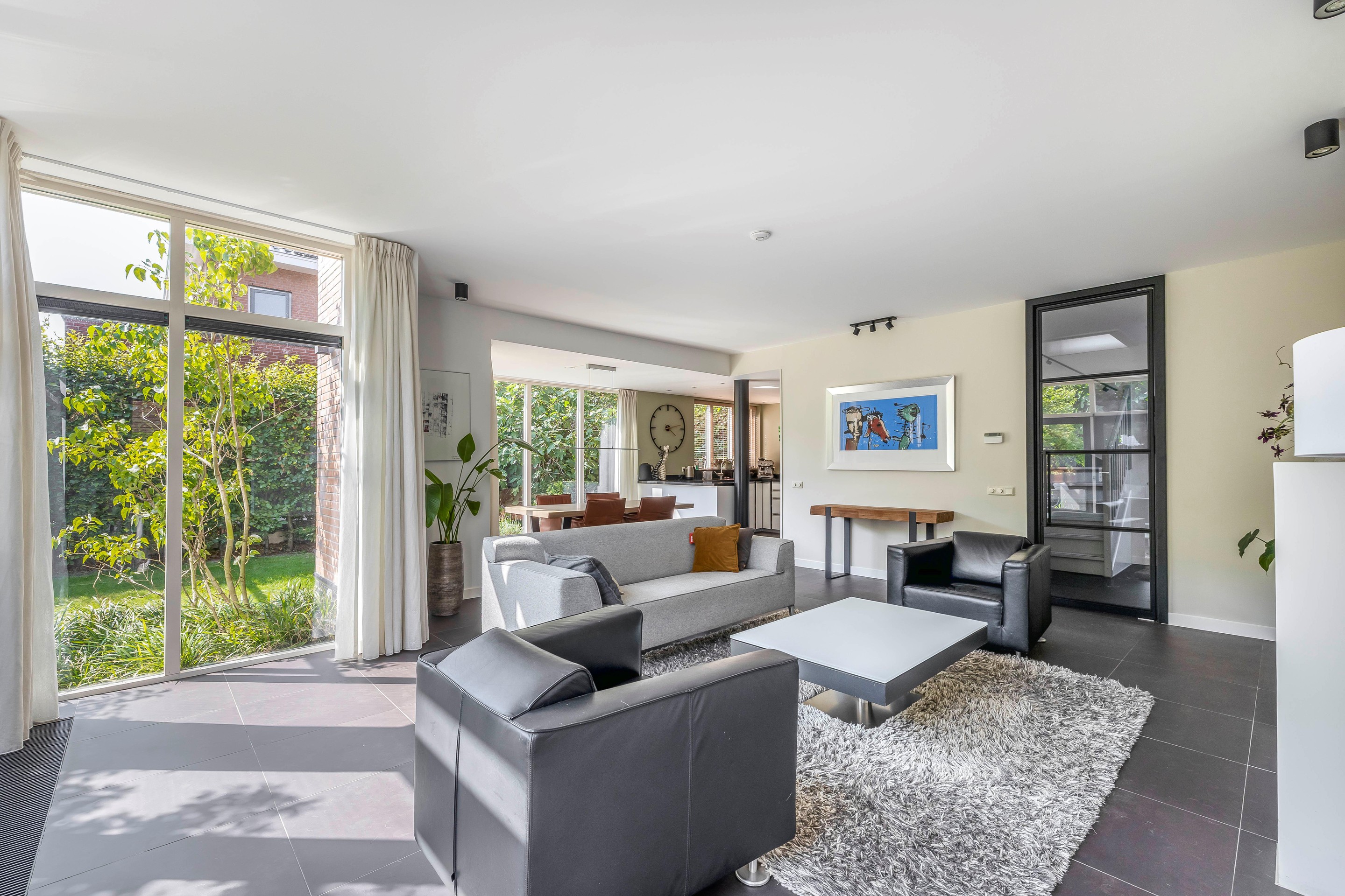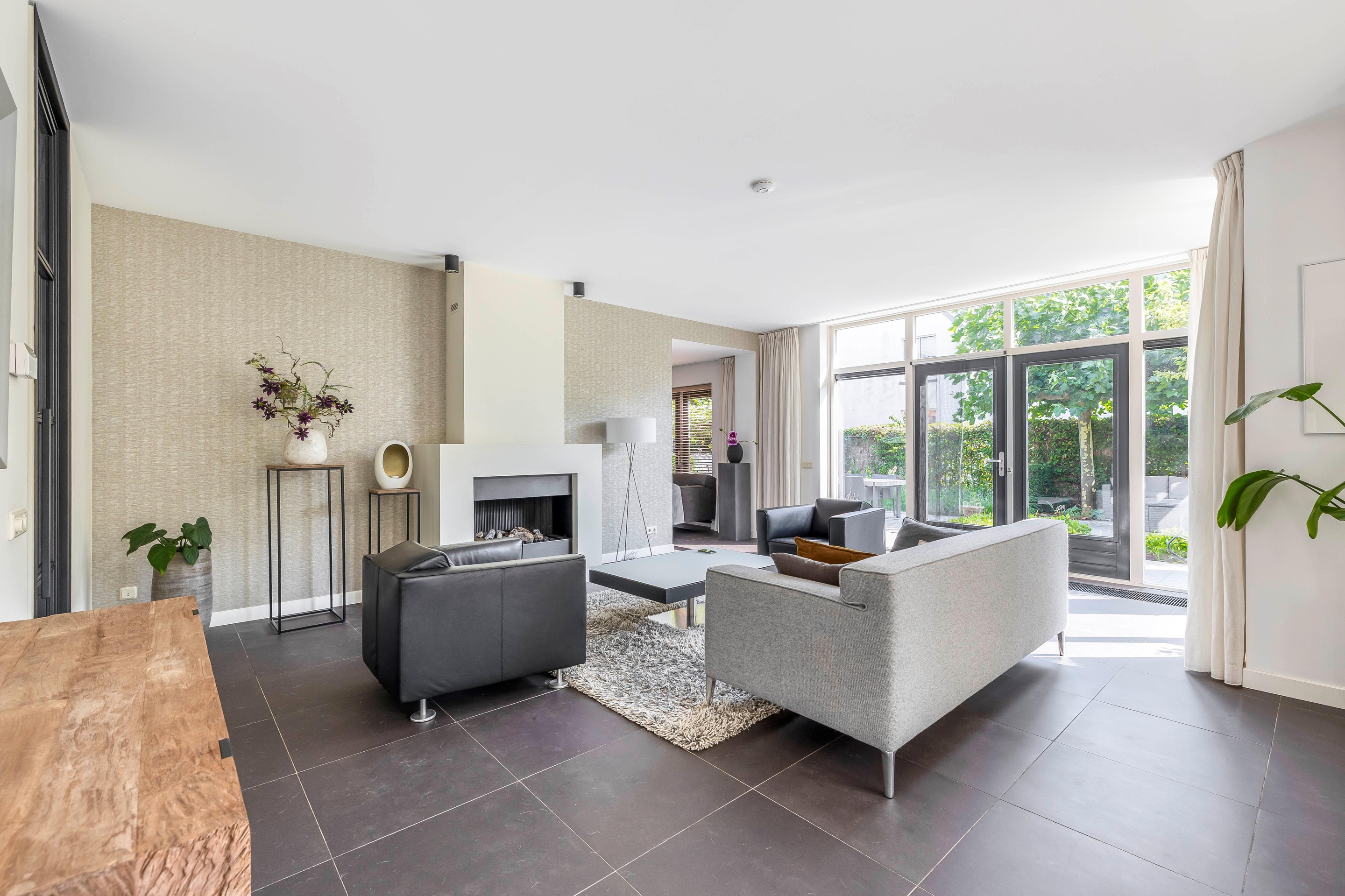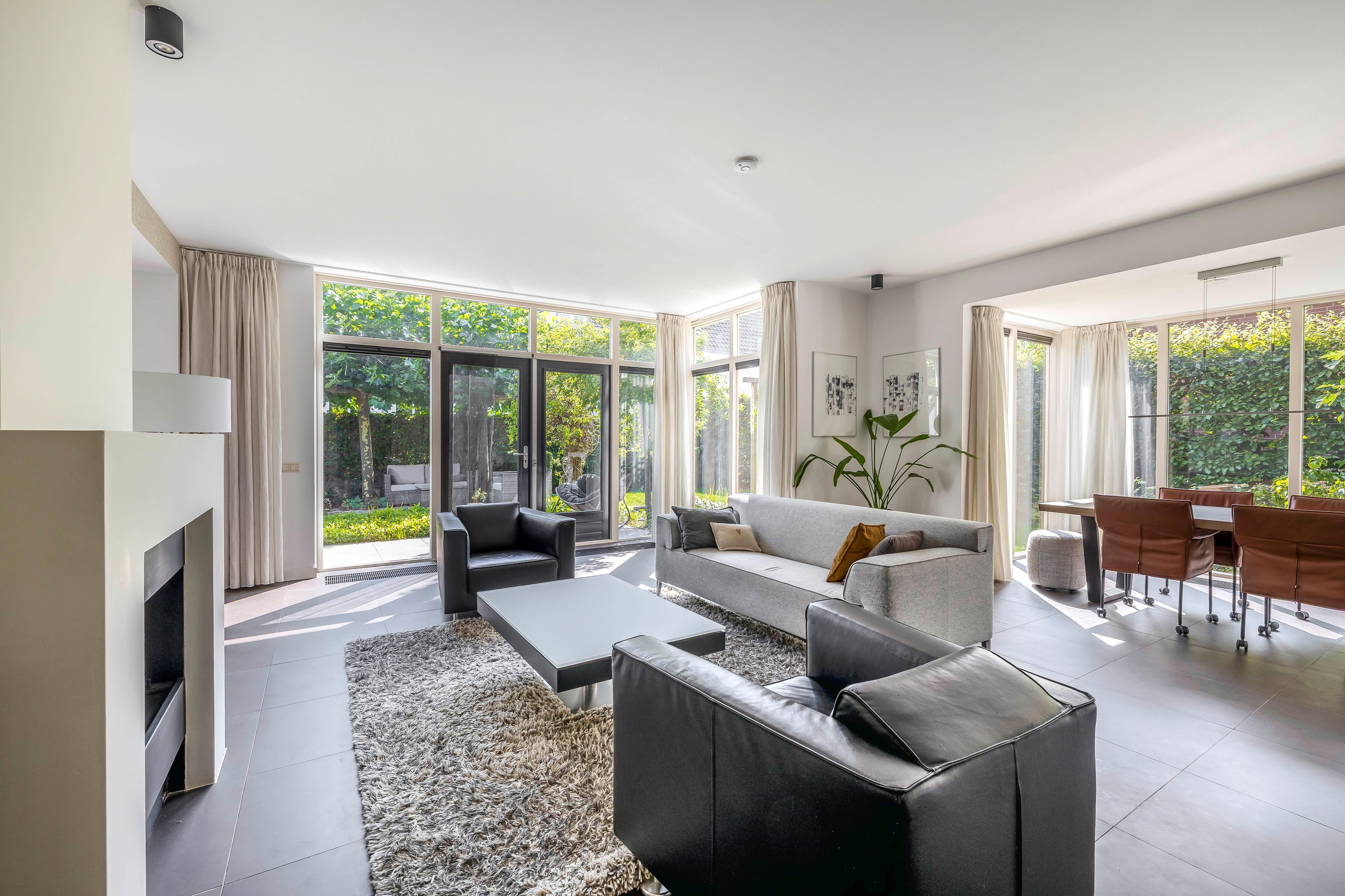 De woonkamer is een opvallend lichte en zonnige ruimte dankzij de hoge raampartijen en de openslaande deuren naar de achtertuin. Een sfeervolle gashaard met schouw vormt het hart van de ruimte. Vanuit de woonkamer is er een doorgang naar een aparte televisiekamer, die eveneens openslaande deuren naar de tuin heeft. Deze kamer is optimaal ingericht voor ontspanning, met een speciale wand voor een groot tv-scherm en audioapparatuur.