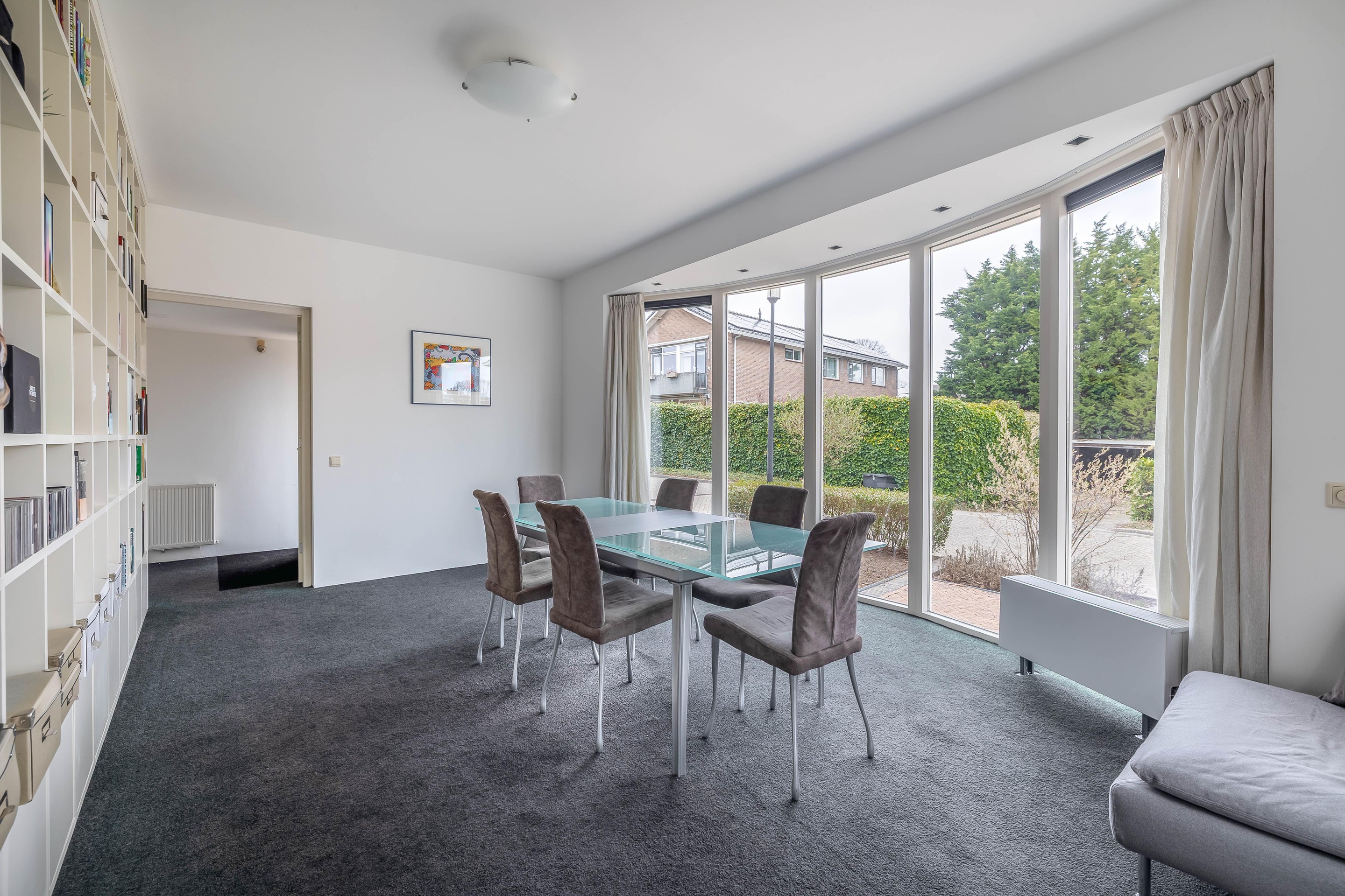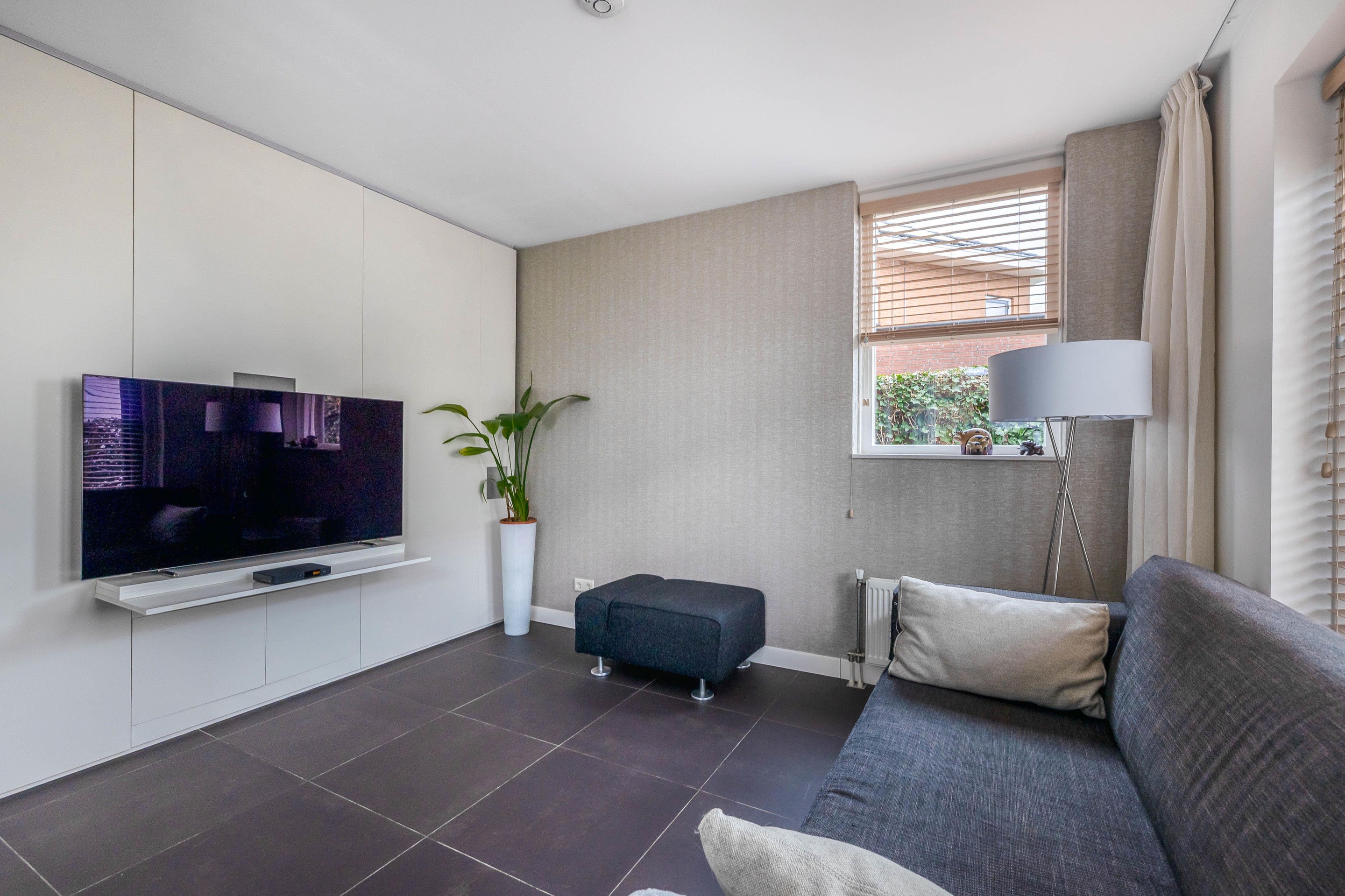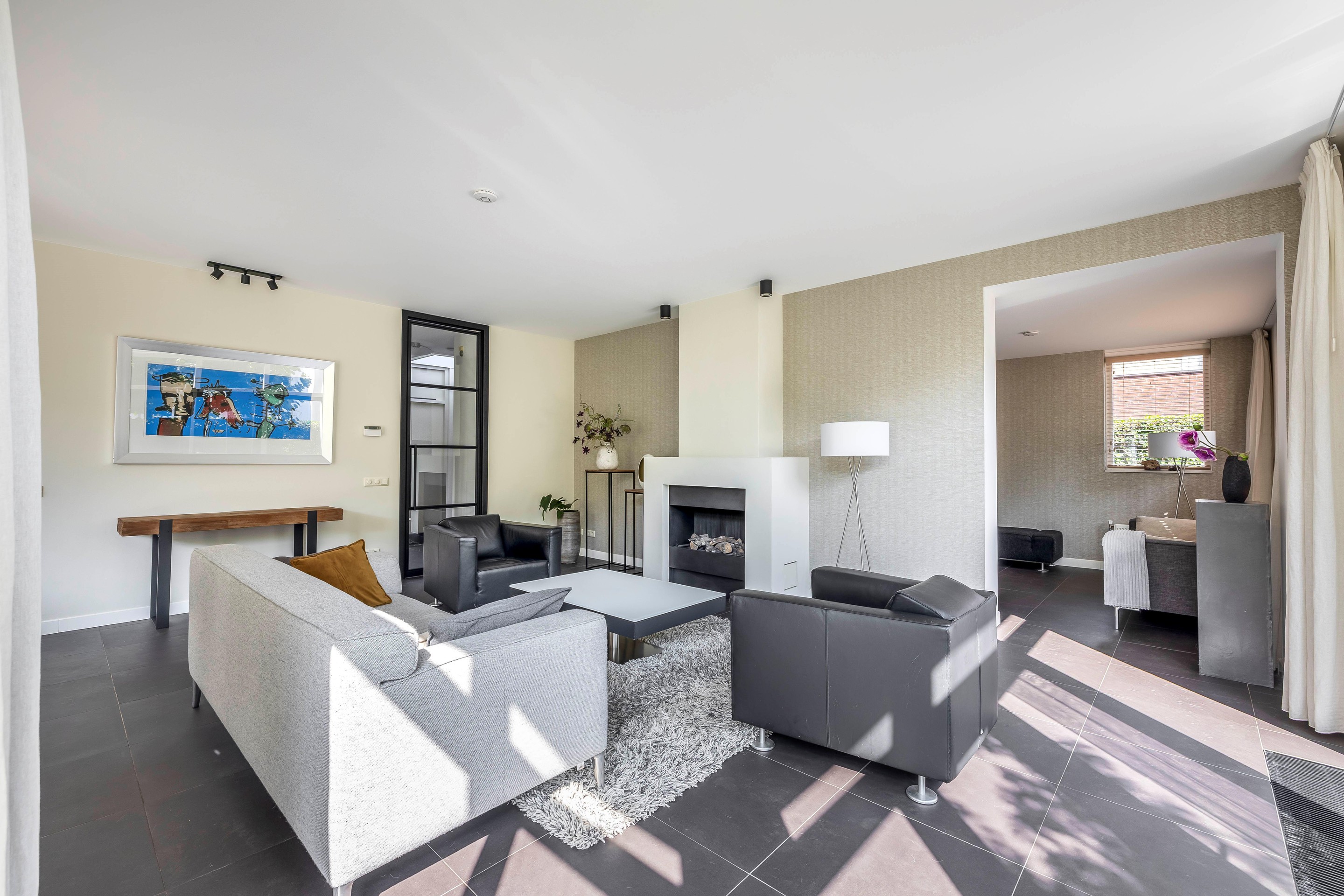De woonkamer is een opvallend lichte en zonnige ruimte dankzij de hoge raampartijen en de openslaande deuren naar de achtertuin. Een sfeervolle gashaard met schouw vormt het hart van de ruimte. Vanuit de woonkamer is er een doorgang naar een aparte televisiekamer, die eveneens openslaande deuren naar de tuin heeft. Deze kamer is optimaal ingericht voor ontspanning, met een speciale wand voor een groot tv-scherm en audioapparatuur.
