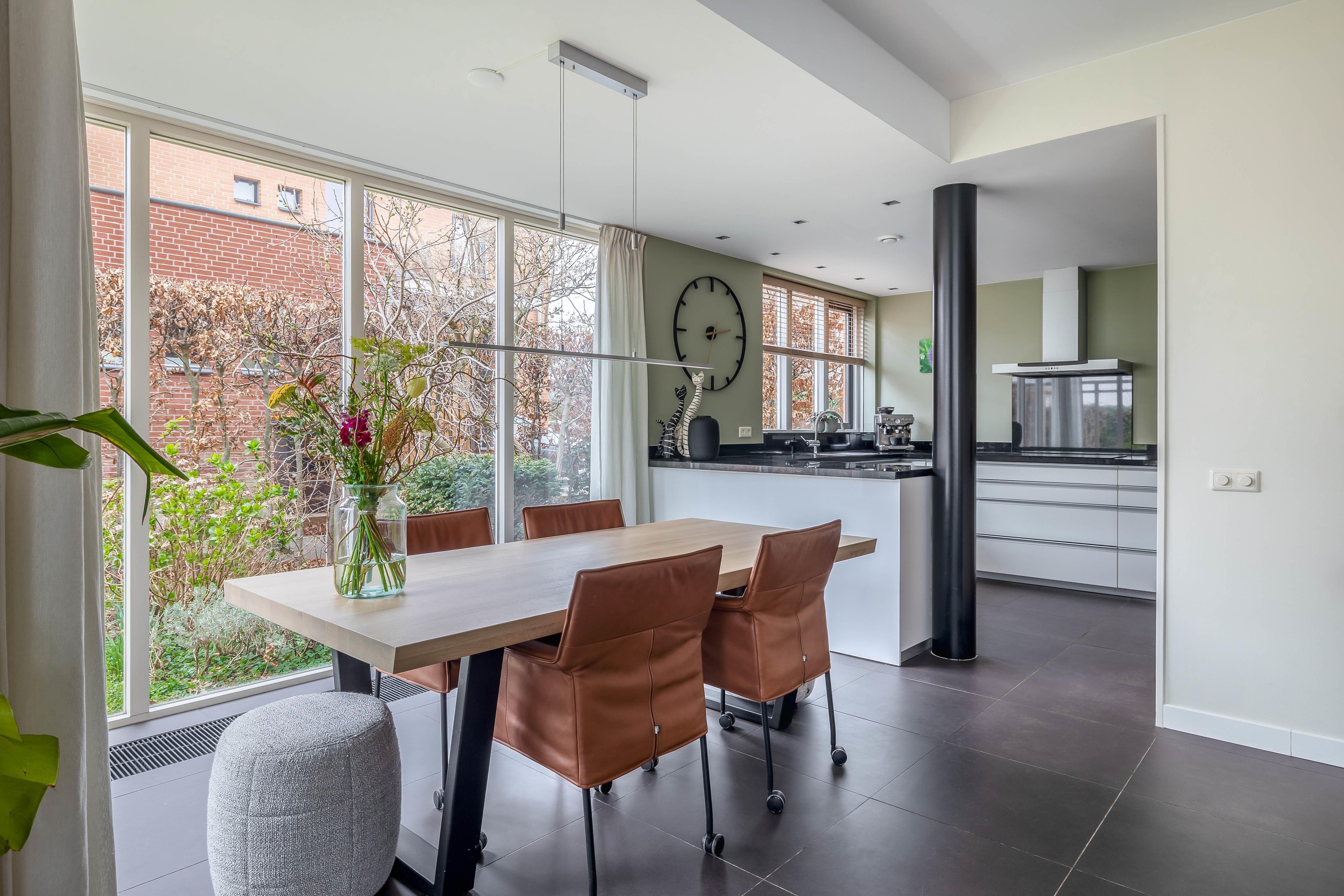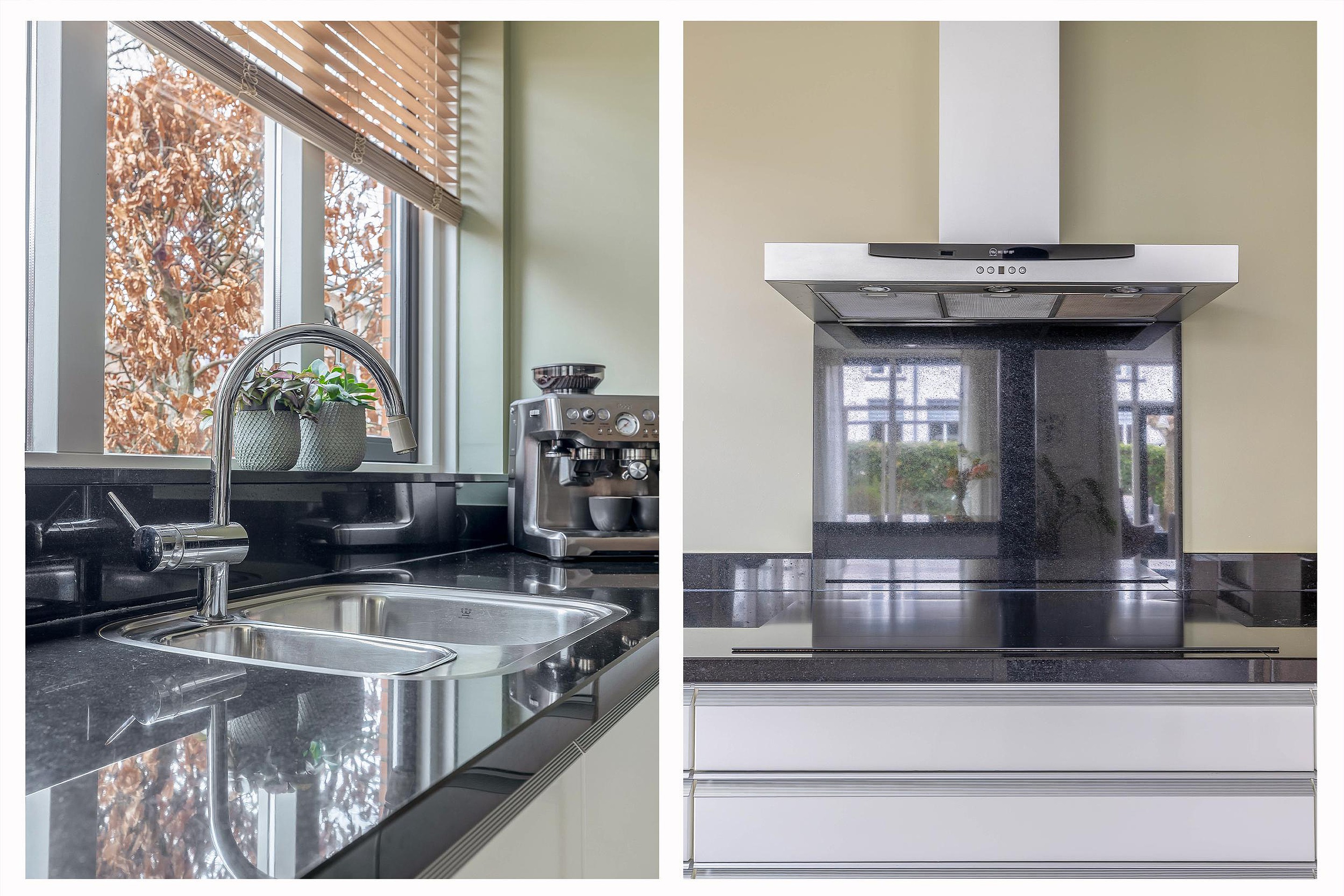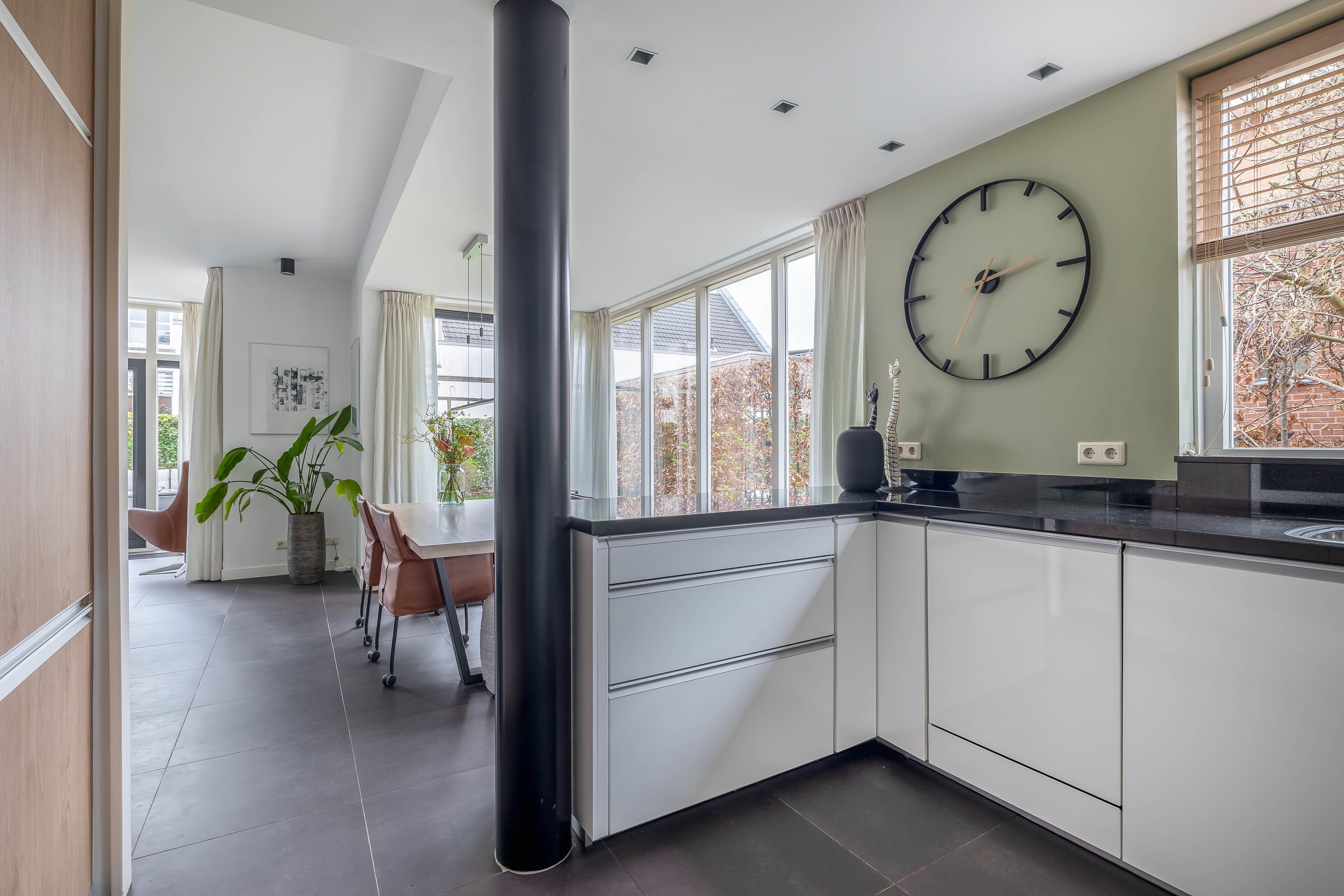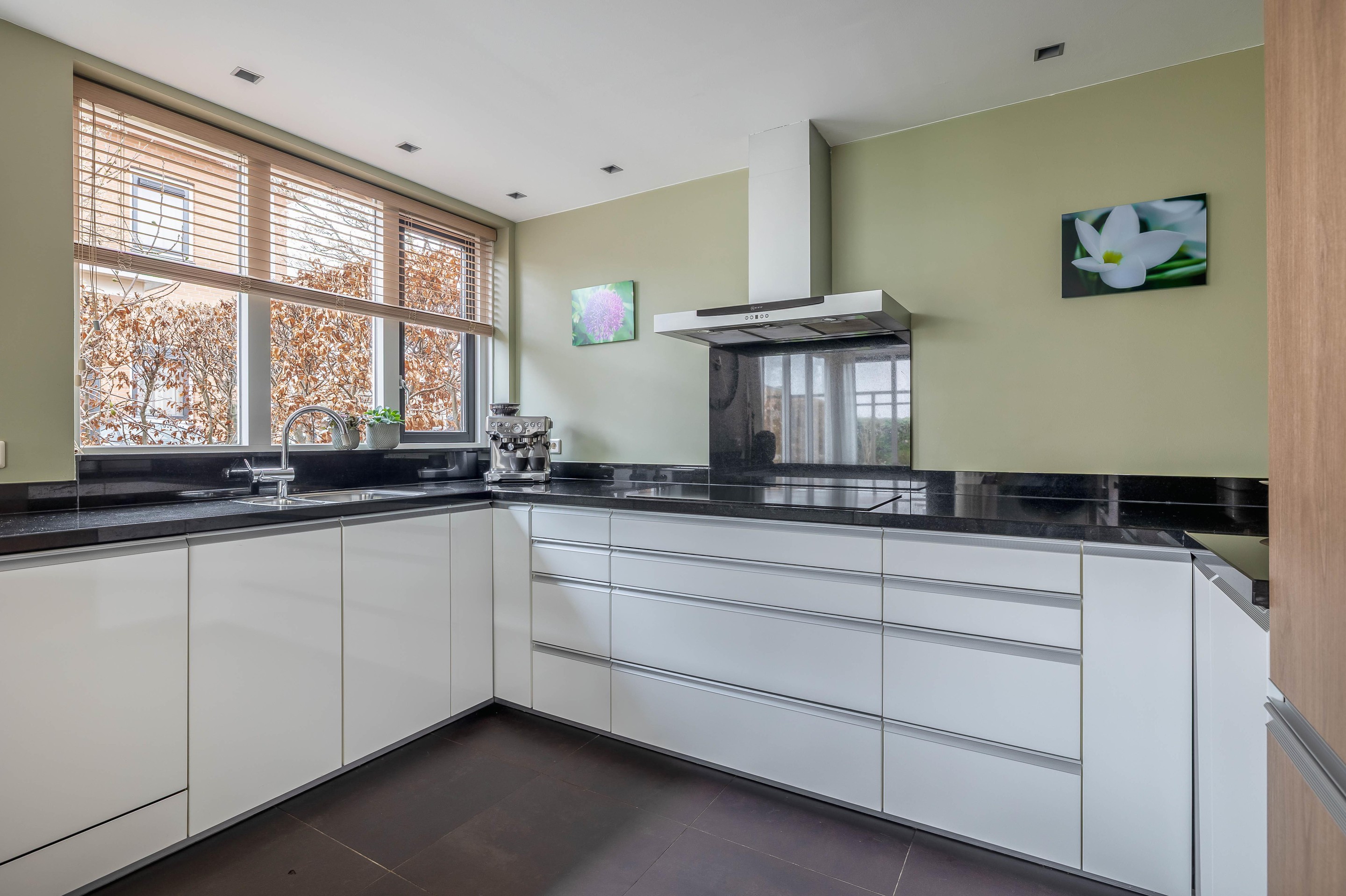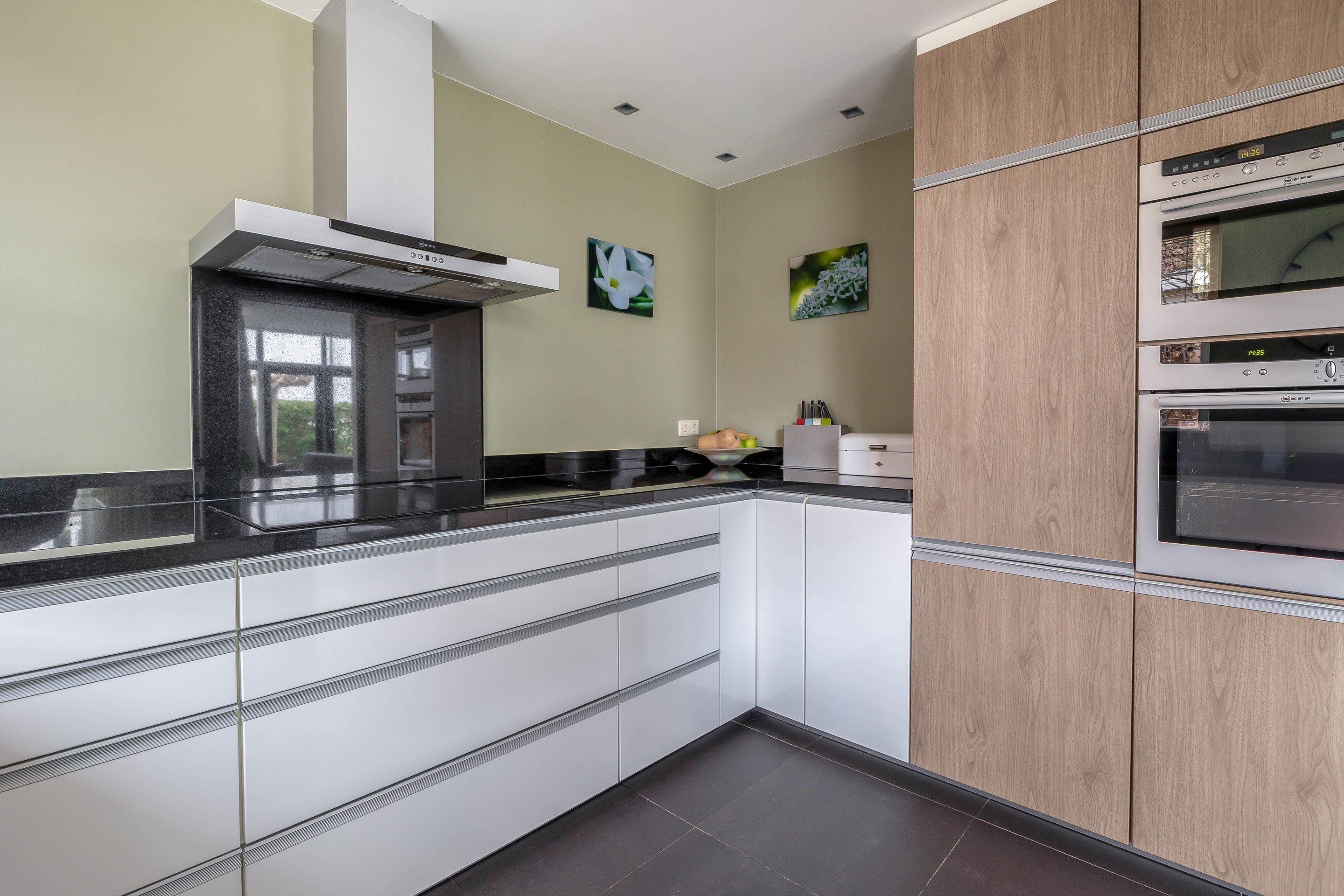 De halfopen en ruime keuken staat in verbinding met de woonkamer. Deze lichte keuken is uitgerust met hoogwaardige inbouwapparatuur, waaronder een koel-vriescombinatie, vaatwasser, een inductiekookplaat met zes zones, een afzuigkap, oven en combimagnetron. Het verhoogde werkblad van graniet en de aanwezige close-in boiler (2021) maken de keuken compleet.