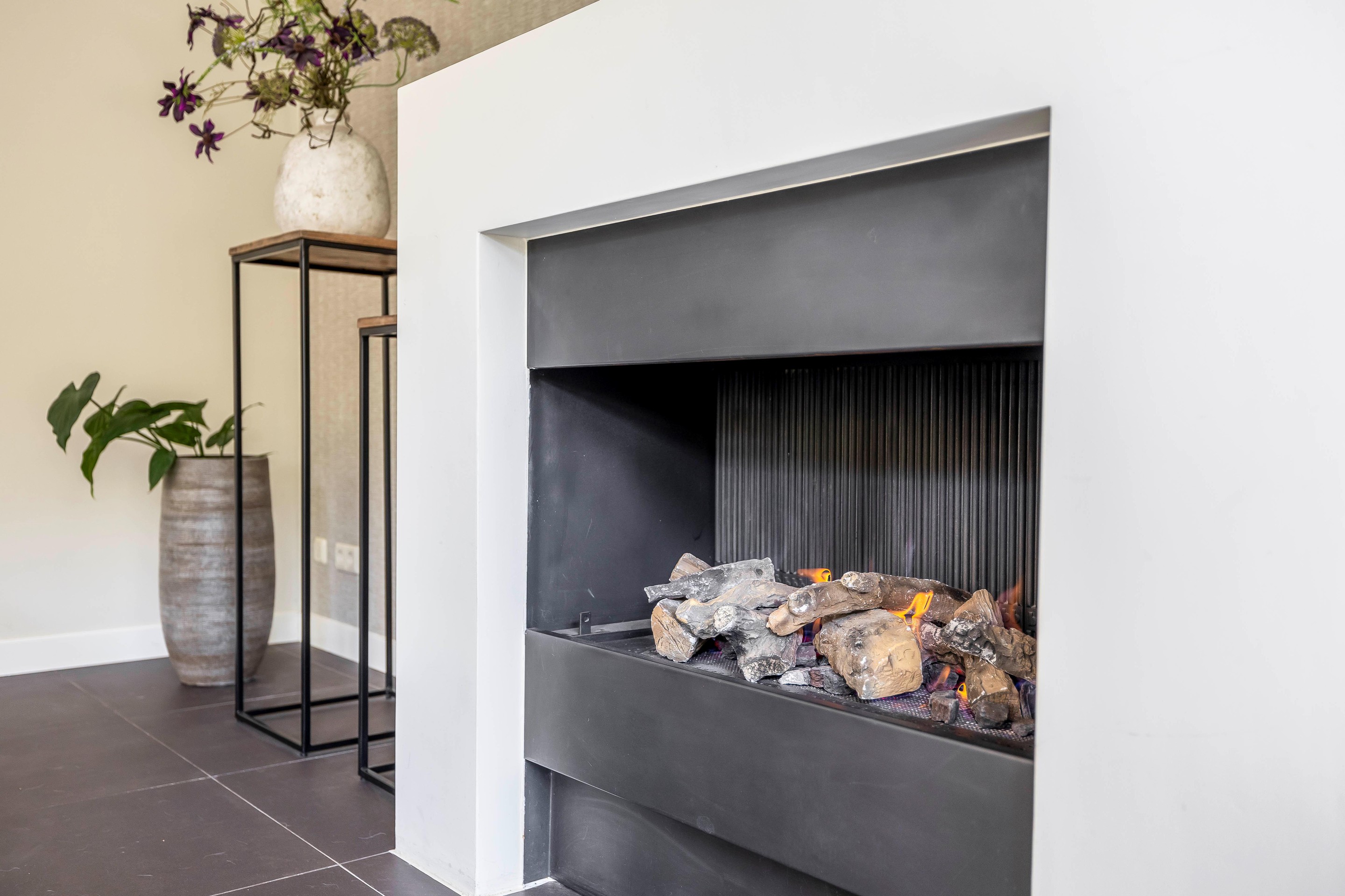 Bij de openslaande deuren van de woonkamer en de glaswand aan de zijkant is een convectorput aangelegd voor optimale warmteverdeling.
