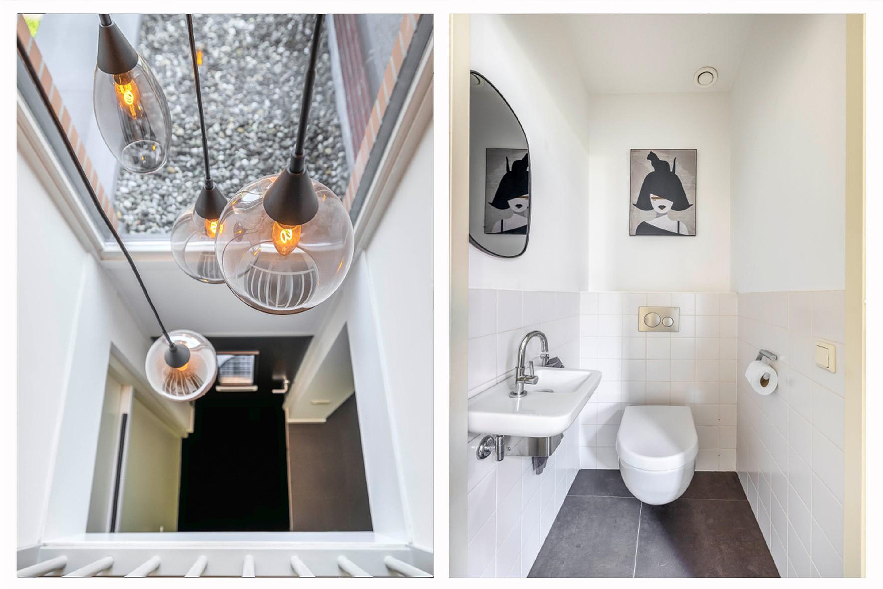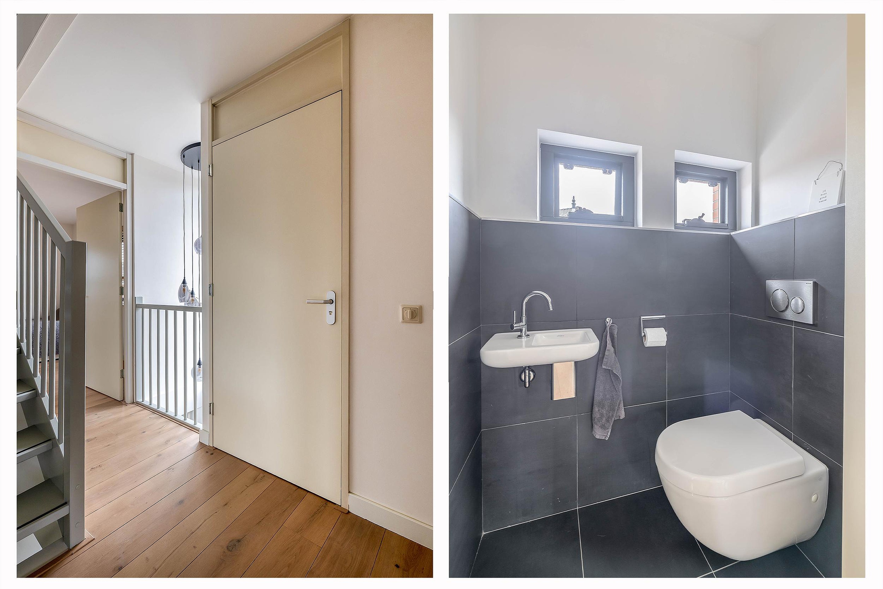 Eerste verdieping Ruime ruime overloop met een kleine vide met groot raam voor daglicht op de overloop. Op deze verdieping bevindt zich een aparte toiletruimte met een hangend toilet en een fonteintje.