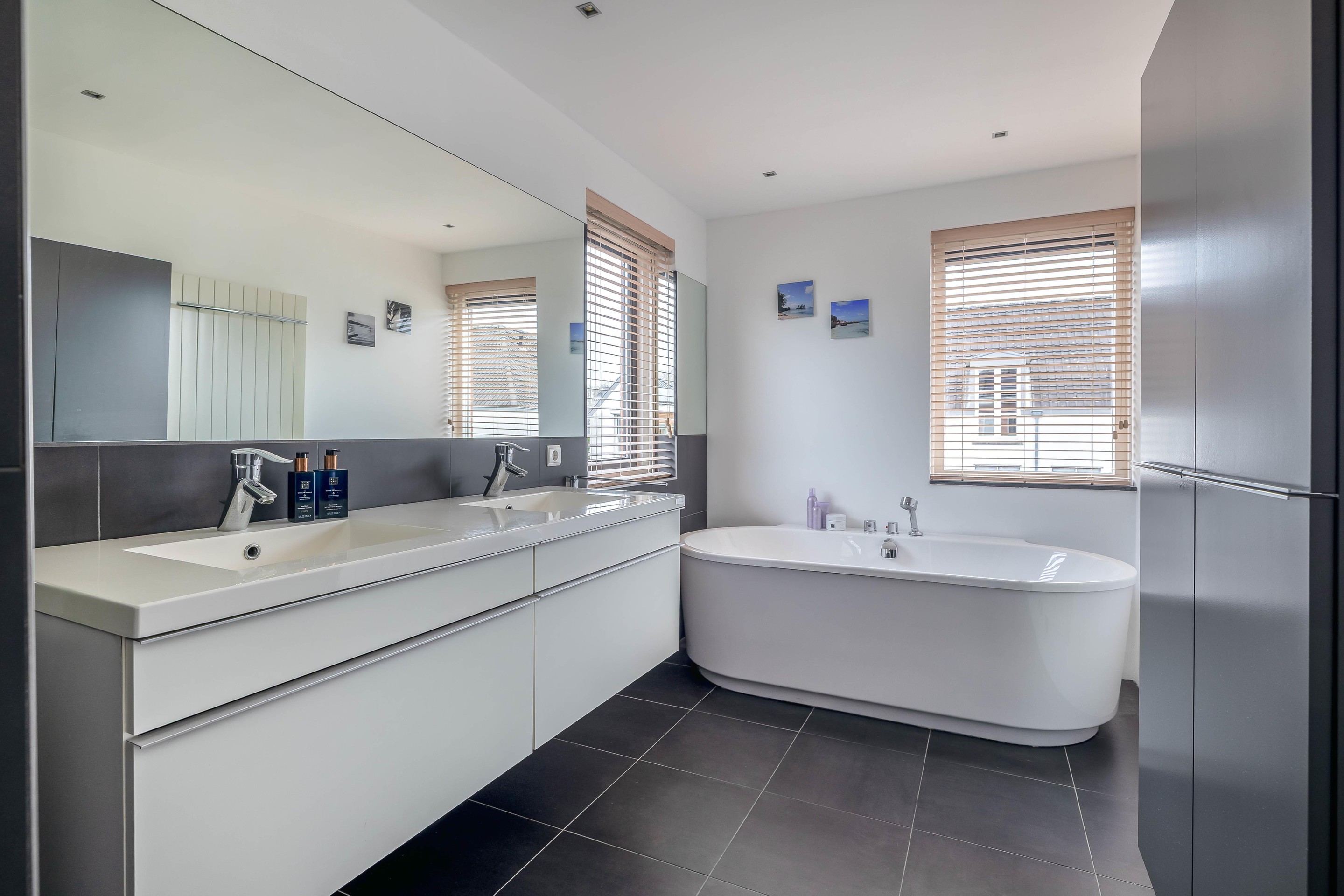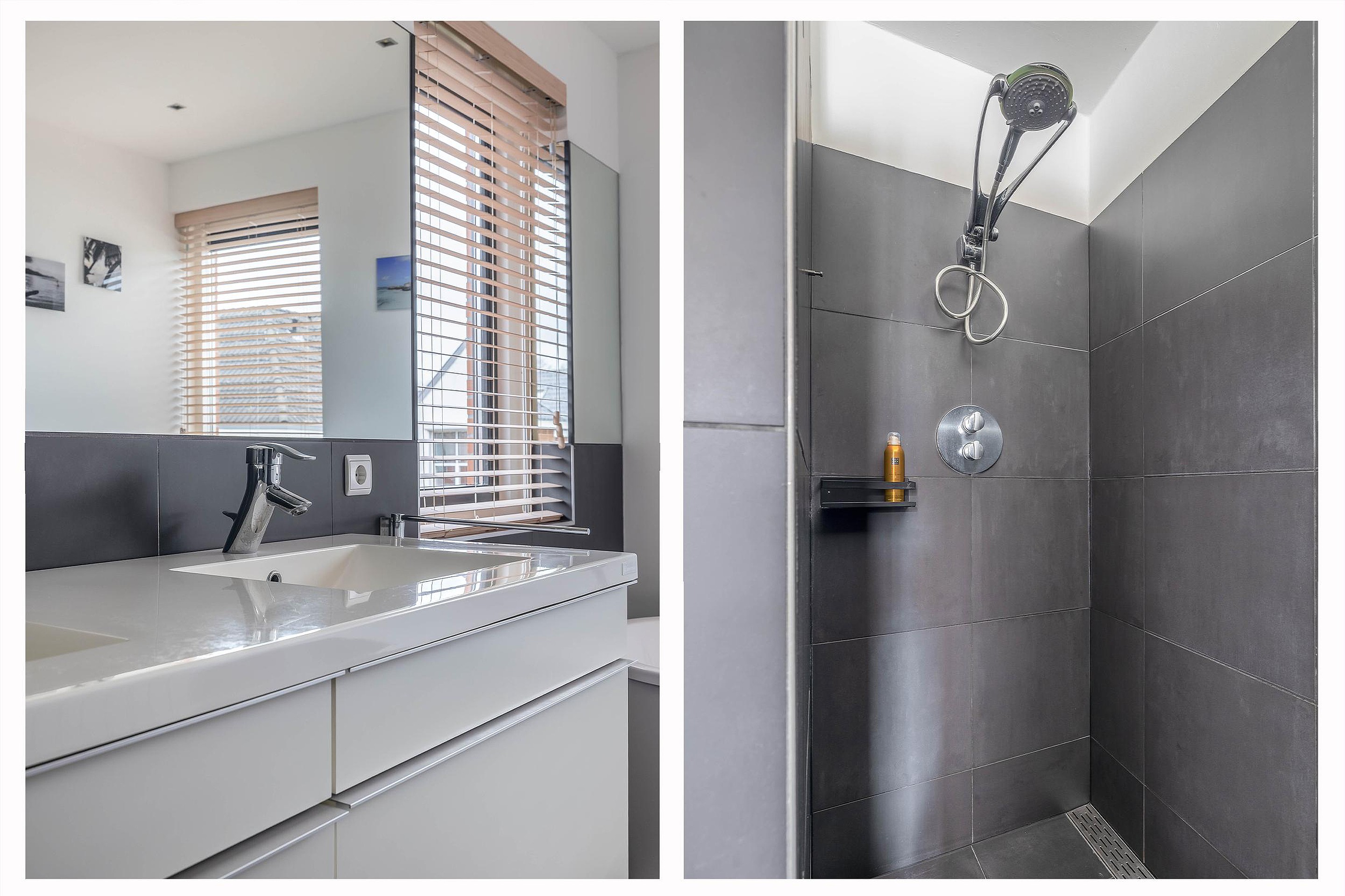 De badkamer is uitgerust met een luxe inloopdouche en een vrijstaand ligbad, perfect om te ontspannen. Het wastafelmeubel met dubbele wasbak biedt voldoende ruimte voor twee personen. De plavuizenvloer, met elektrische vloerverwarming, zorgt voor een aangenaam comfort.