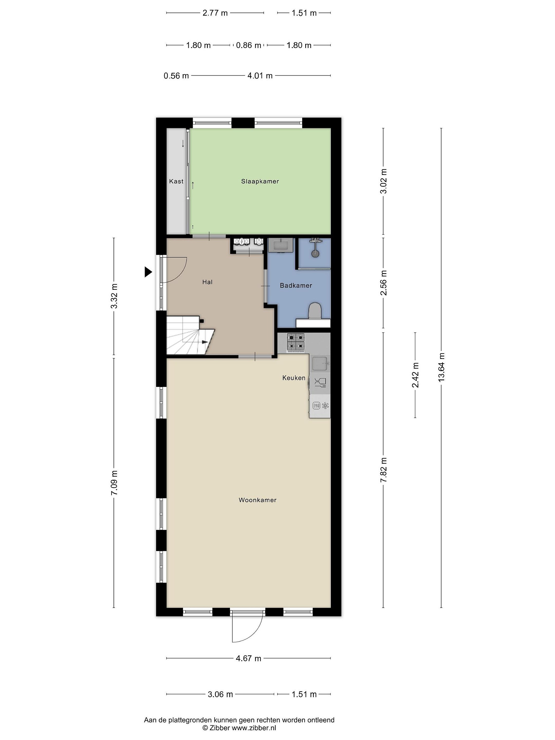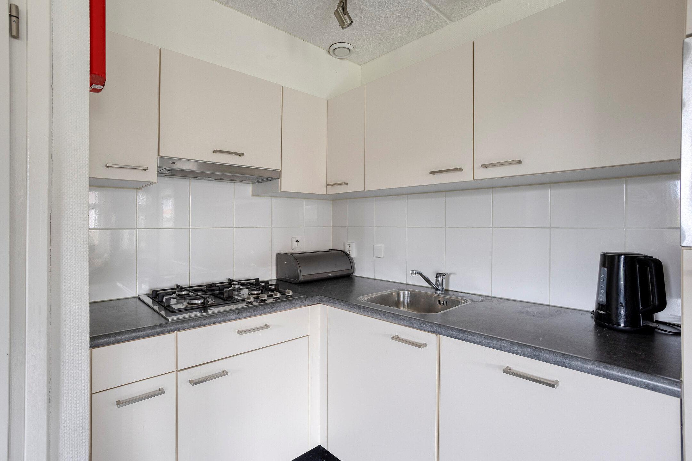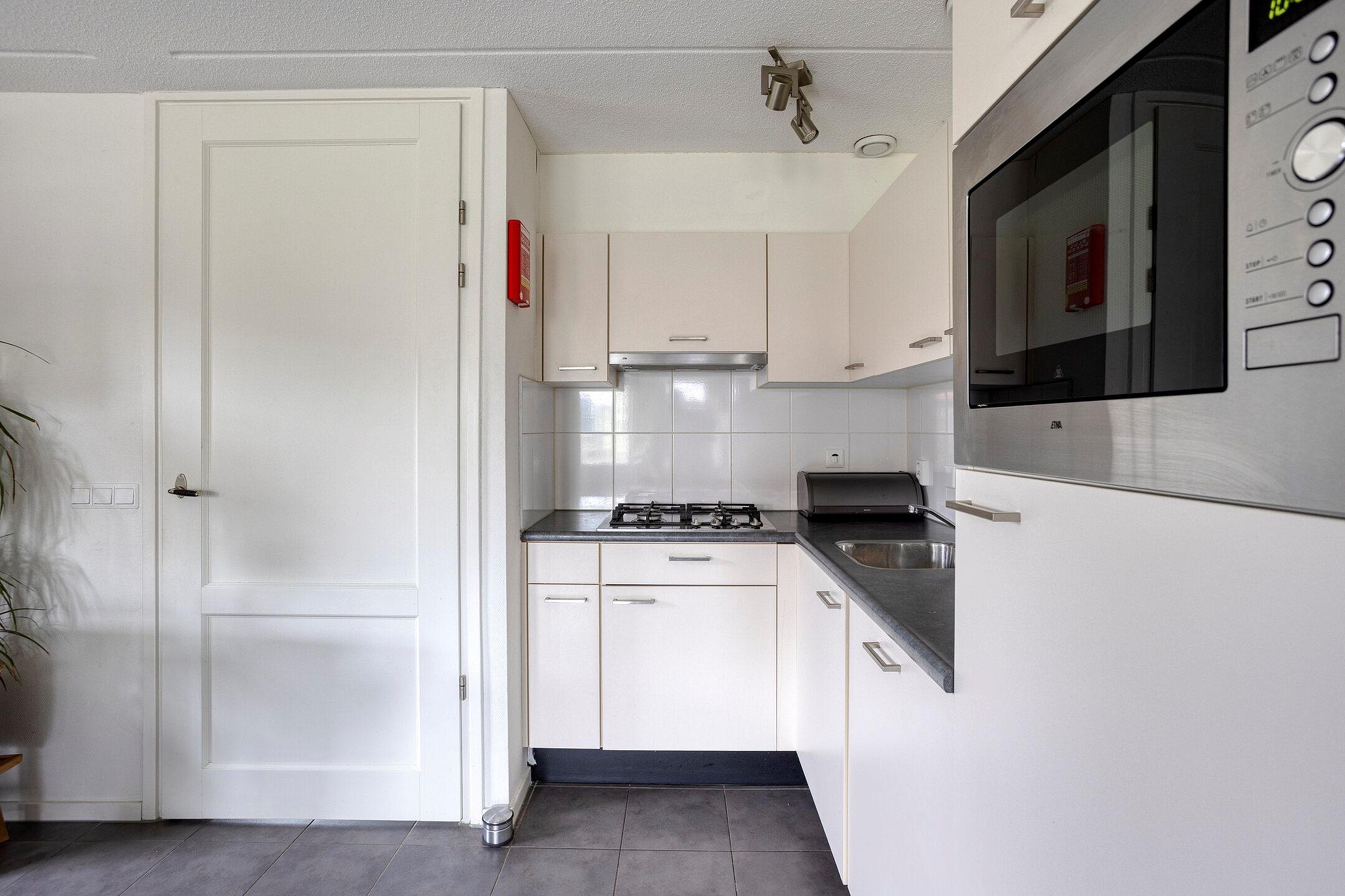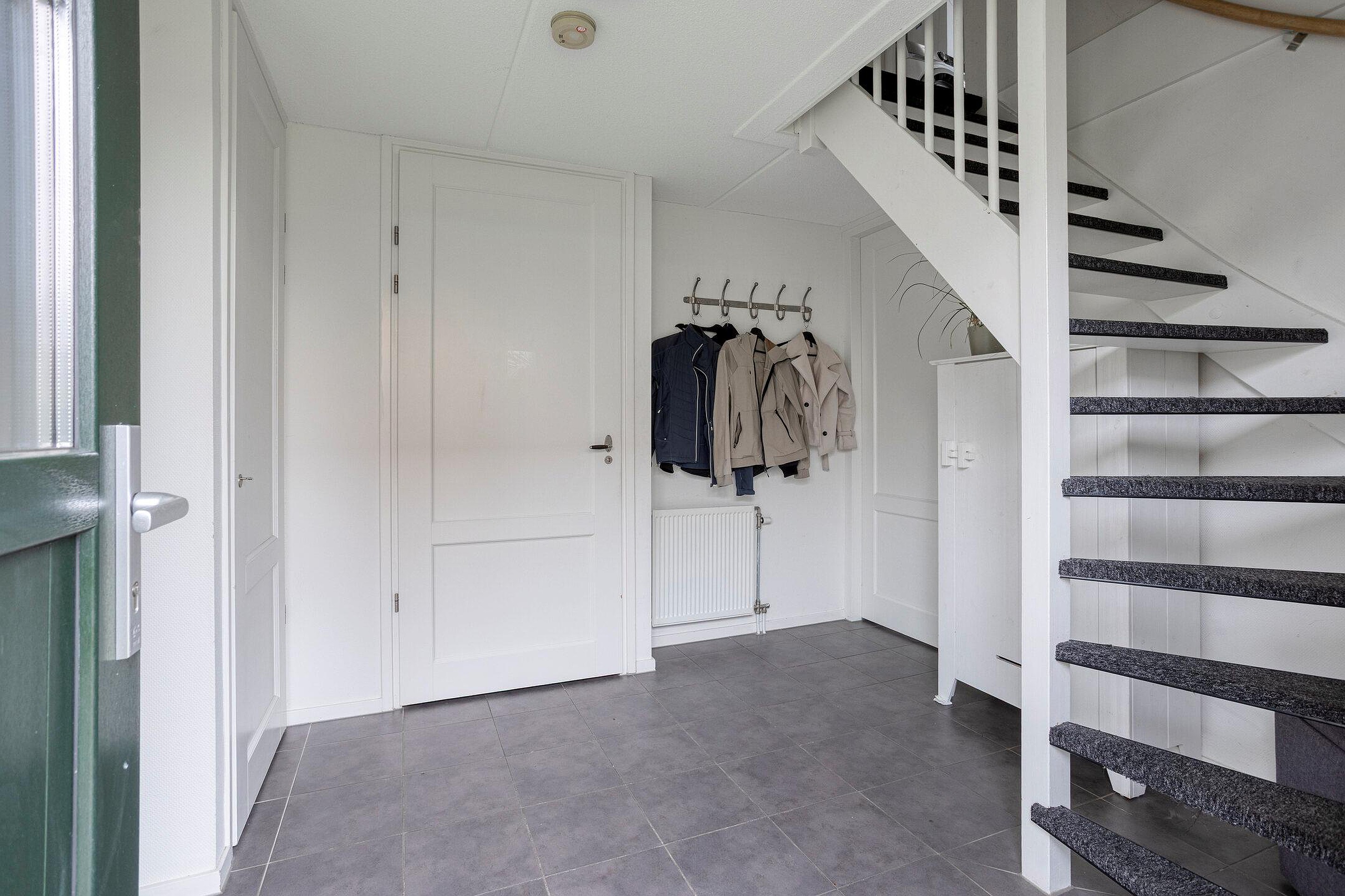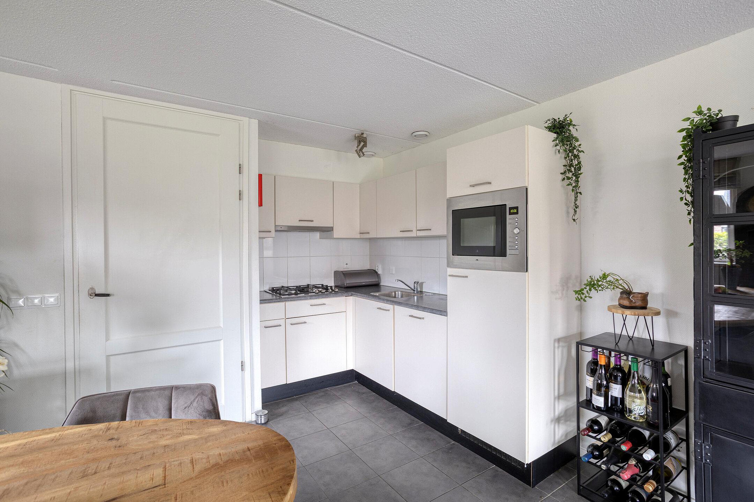 Via de entree heb je toegang tot zowel de woonkamer met keuken als de slaapkamer en de badkamer met toilet. De hal biedt ruimte voor een garderobe en bevat de trap naar de eerste verdieping. De fraaie woonkamer is licht en open dankzij de mooie raampartijen. Via de deur in de woonkamer sta je in directe verbinding met buiten. De open keuken beschikt over voldoende opbergruimte en is voorzien van een kunststof aanrechtblad, een 4‑pits gasfornuis met RVS‑afzuigkap, een koel‑vriescombinatie, een combioven en een vaatwasser. In de keuken is voldoende ruimte om een eethoek te creëren. De slaapkamer op de begane grond heeft een prettig formaat en biedt ruimte aan een tweepersoonsbed en een kast. De badkamer is volledig betegeld in neutrale tinten en uitgerust met een douchehoek, een wastafelmeubel en een hangtoilet.