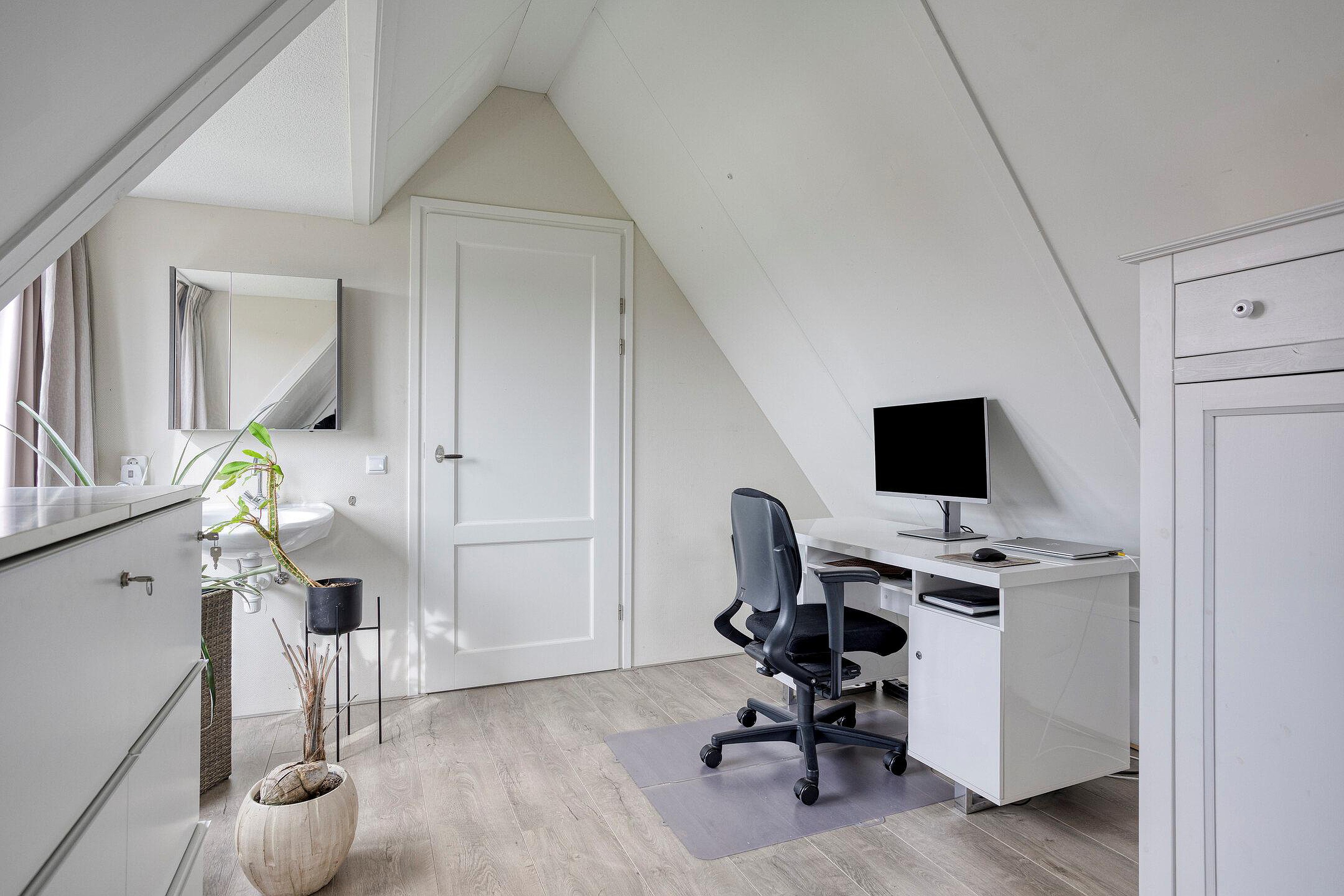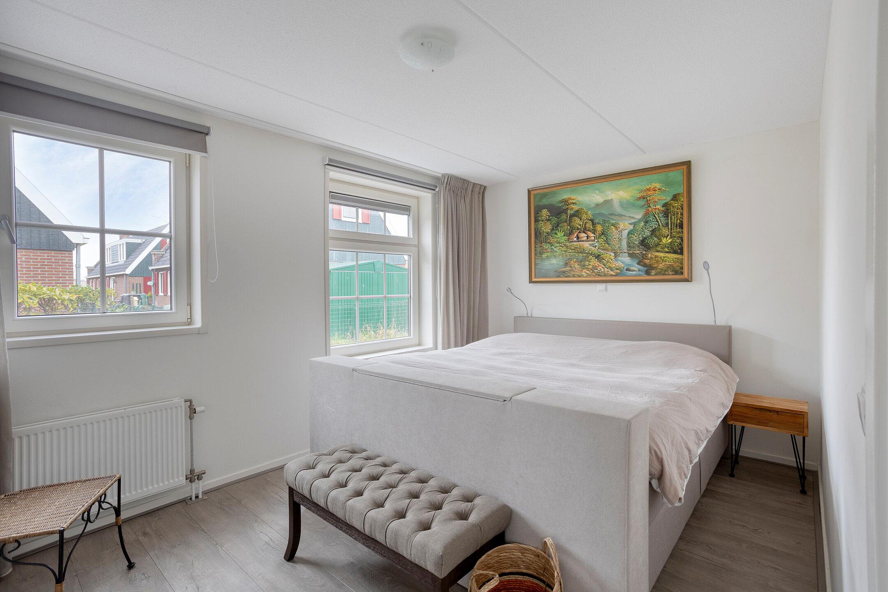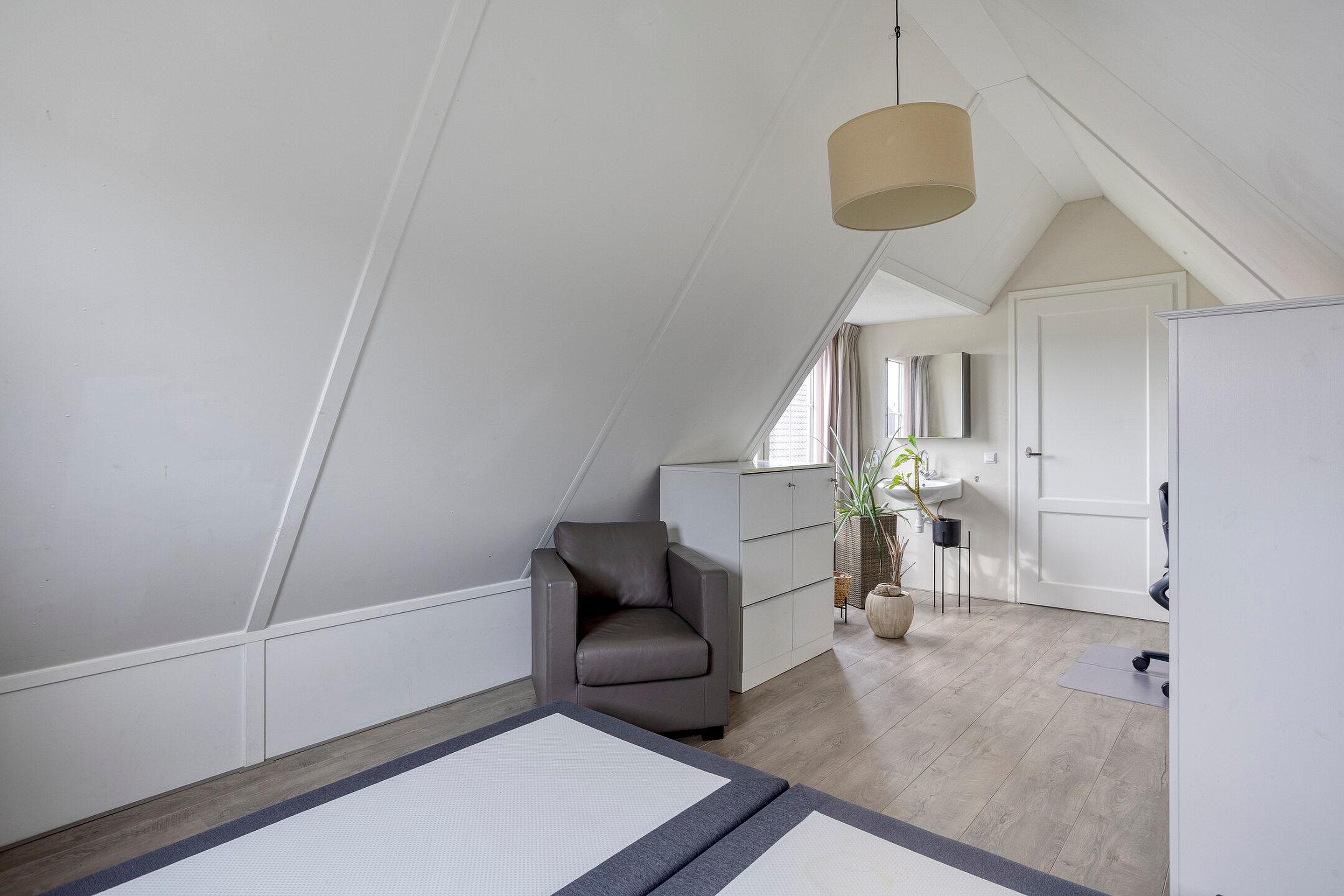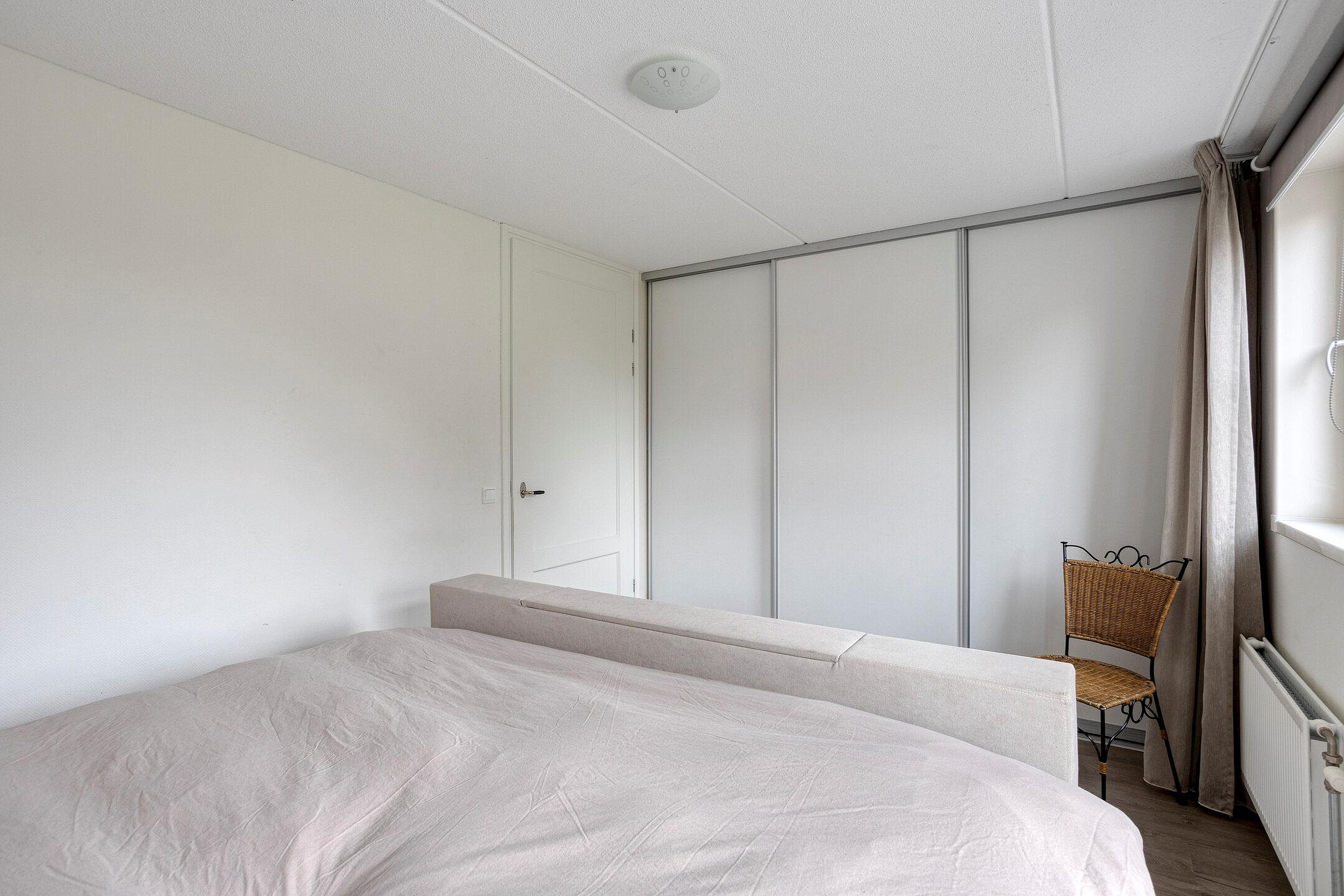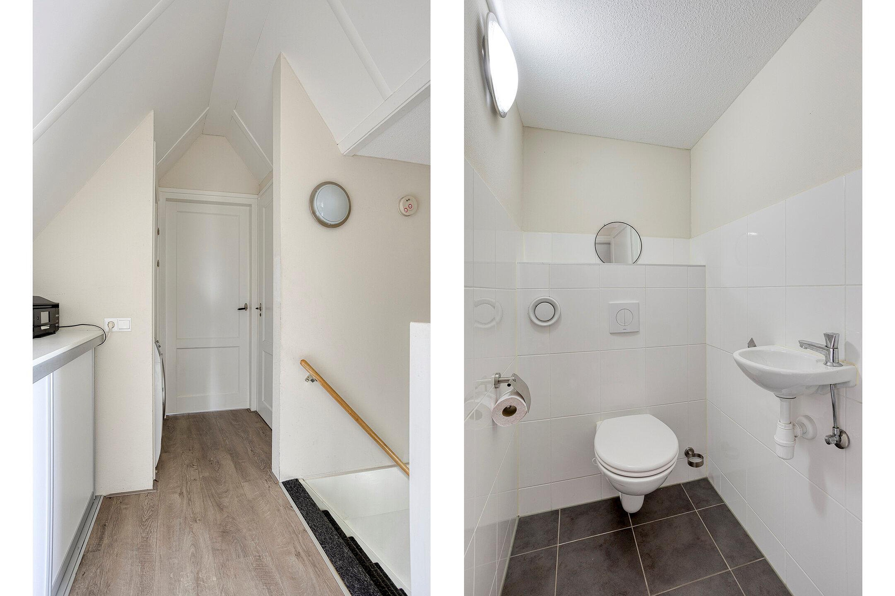 Via de open trap in de hal kom je uit op de overloop van de eerste verdieping. Vanaf hier heb je toegang tot twee slaapkamers en een separate toiletruimte. Het toilet is, net als de badkamer op de begane grond, volledig betegeld in een neutrale kleur en voorzien van een wastafel. Alle slaapkamers zijn strak afgewerkt en ogen licht, ruimtelijk en eigentijds. In beide slaapkamers is een wastafel met daarboven een spiegelkast aanwezig.