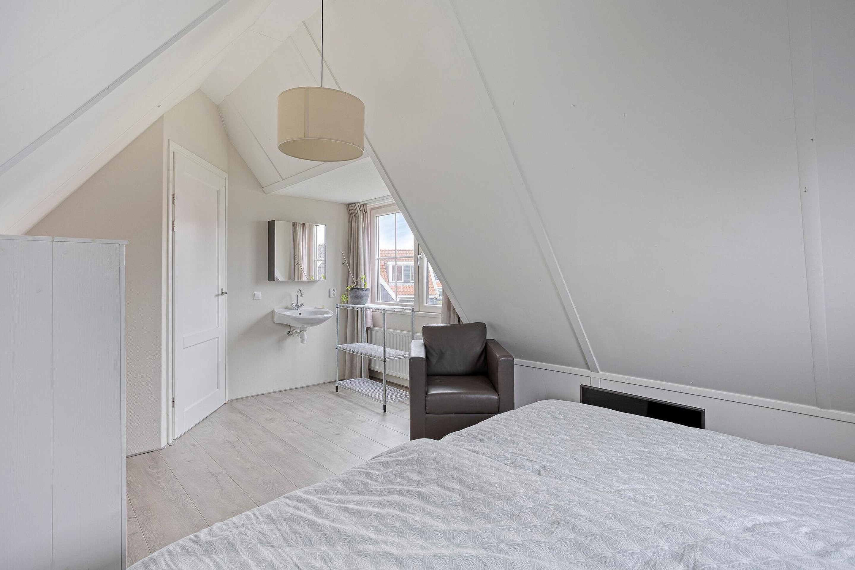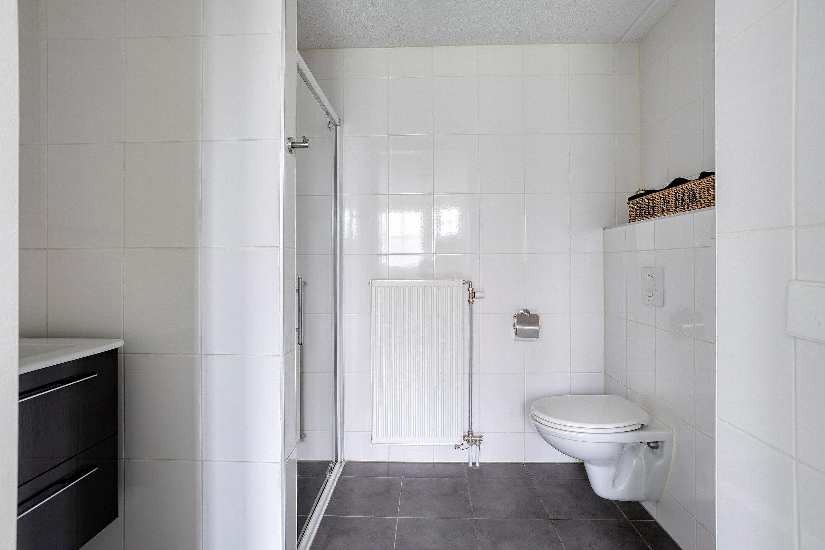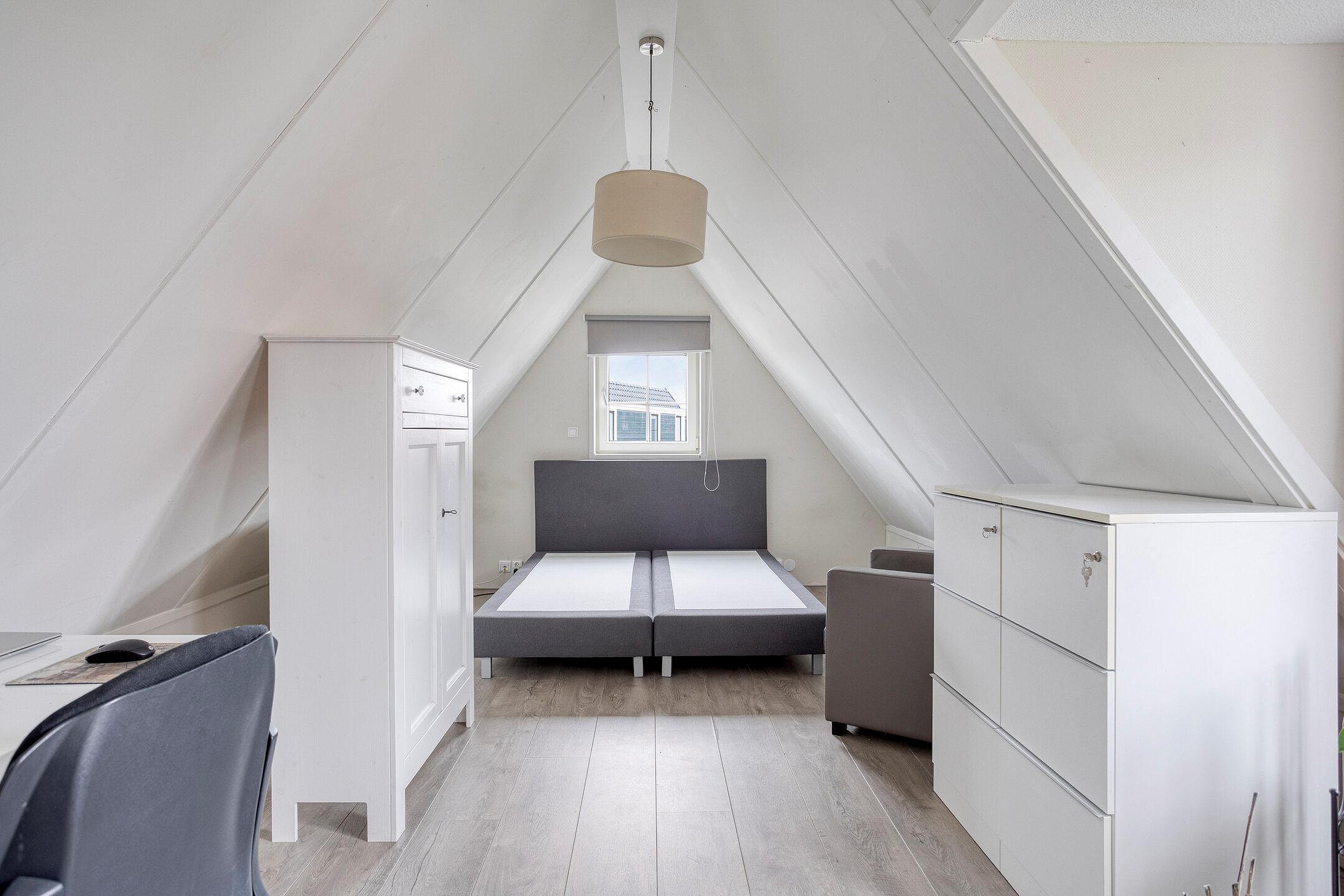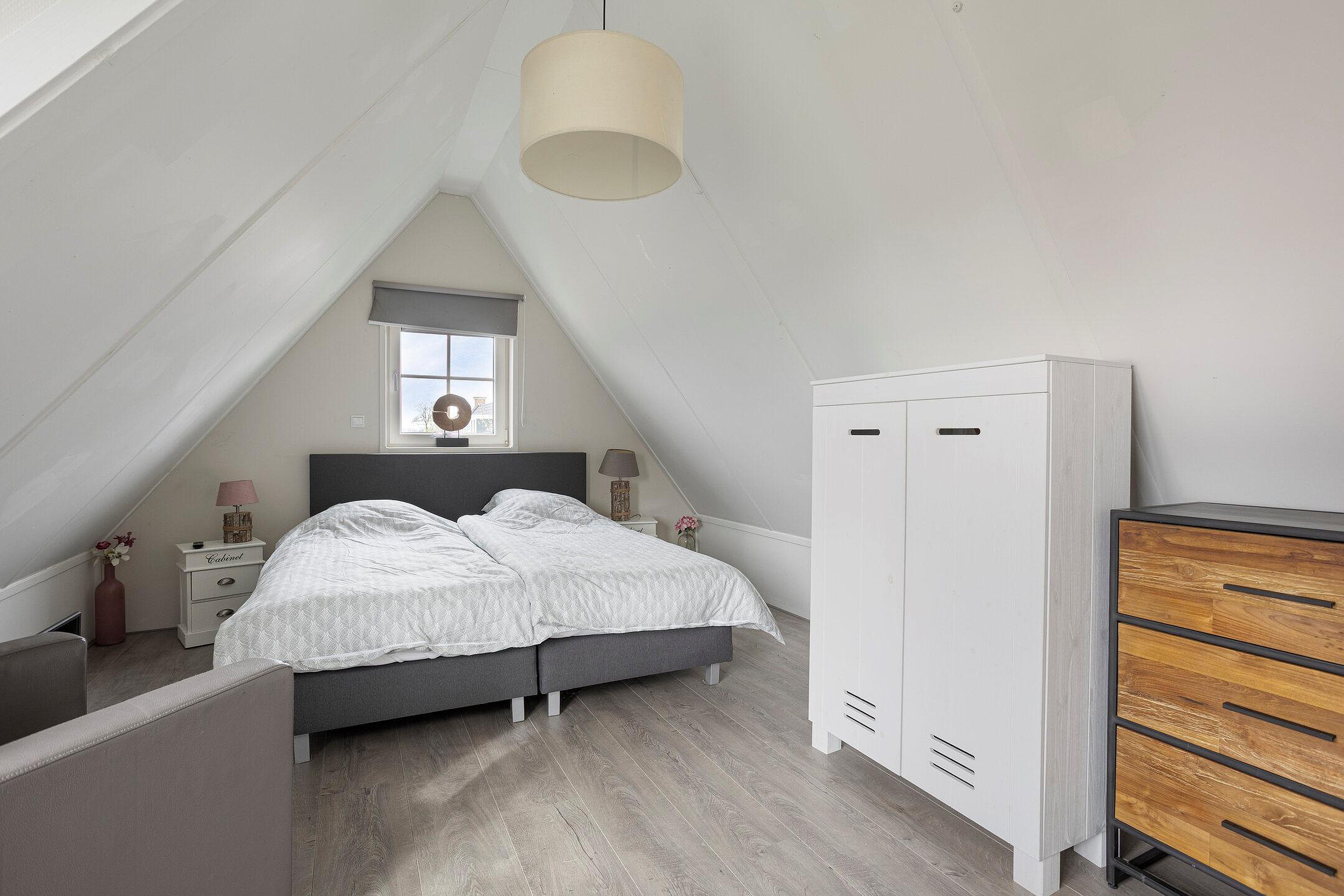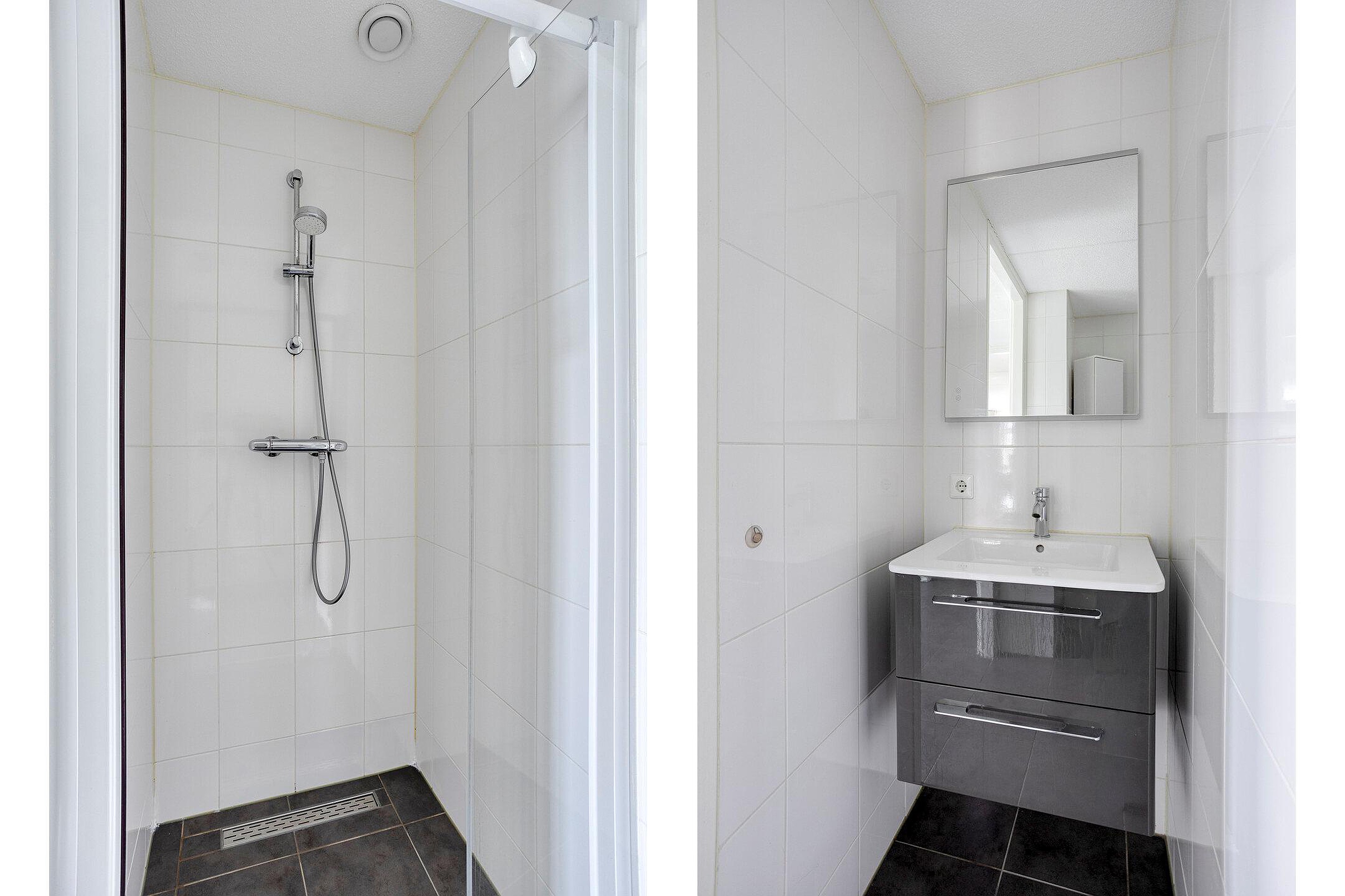 Via de open trap in de hal kom je uit op de overloop van de eerste verdieping. Vanaf hier heb je toegang tot twee slaapkamers en een separate toiletruimte. Het toilet is, net als de badkamer op de begane grond, volledig betegeld in een neutrale kleur en voorzien van een wastafel. Alle slaapkamers zijn strak afgewerkt en ogen licht, ruimtelijk en eigentijds. In beide slaapkamers is een wastafel met daarboven een spiegelkast aanwezig.