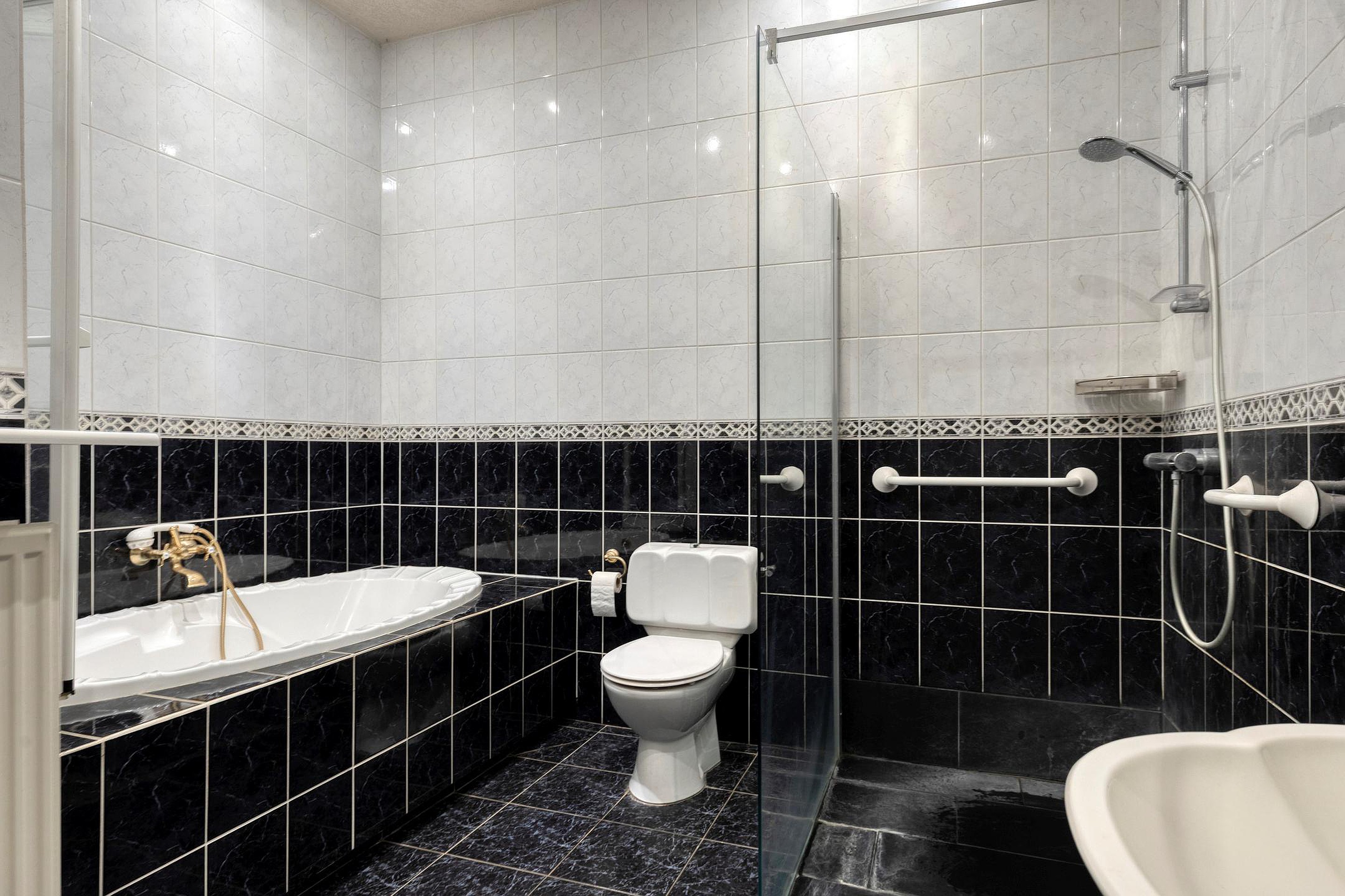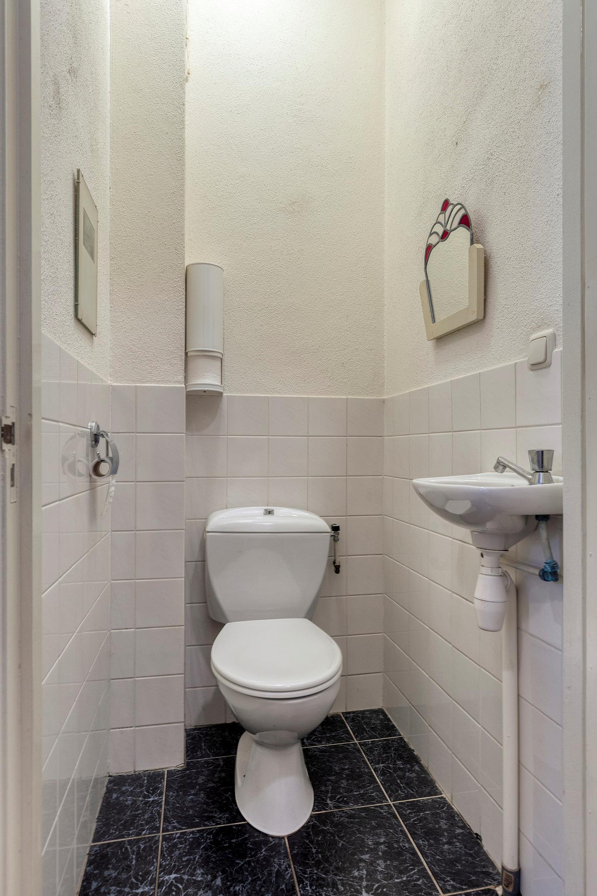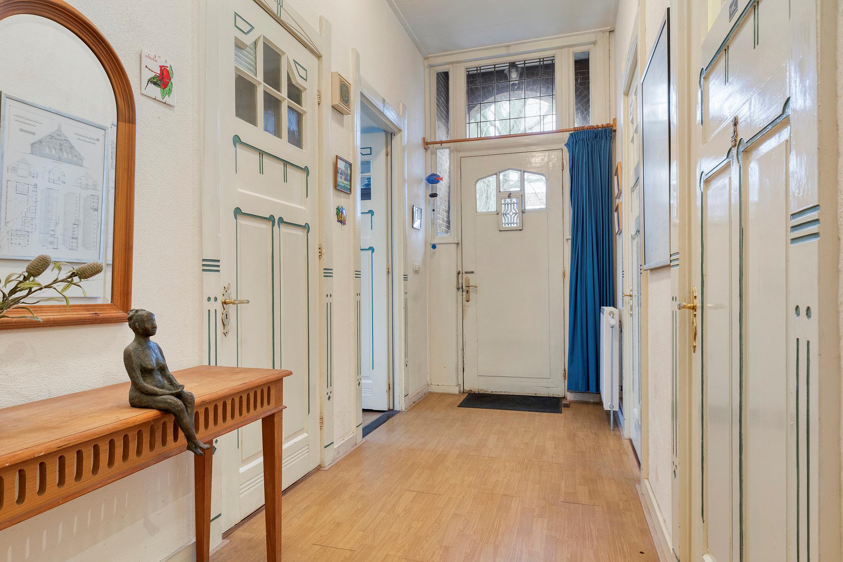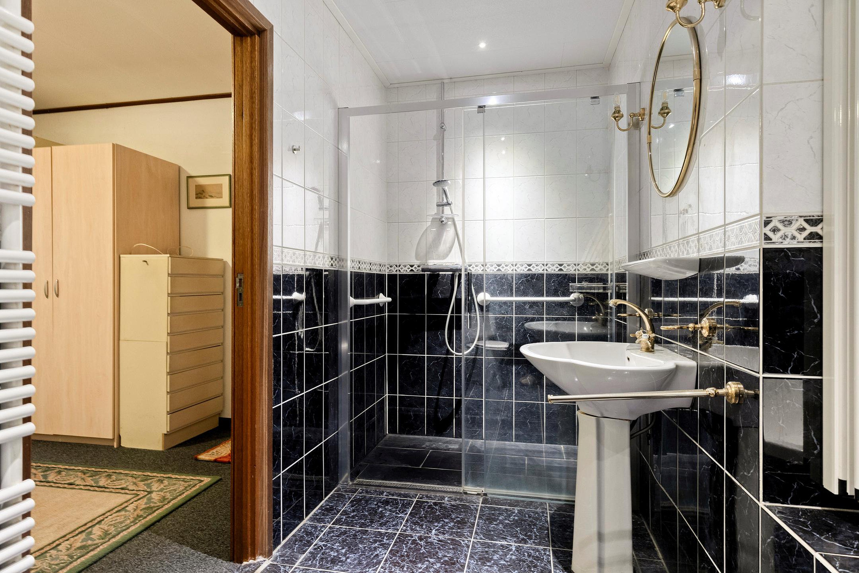 Via de statige entree betreedt u een ruime hal met aan de ene kant toegang tot de woonkamer, het souterrain en deur met toegang tot de trap naar de eerste verdieping en aan de andere kant toegang tot de woon-/werkamer, een toilet en een badkamer, voorzien van ligbad, inloopdouche, toilet en wastafel.