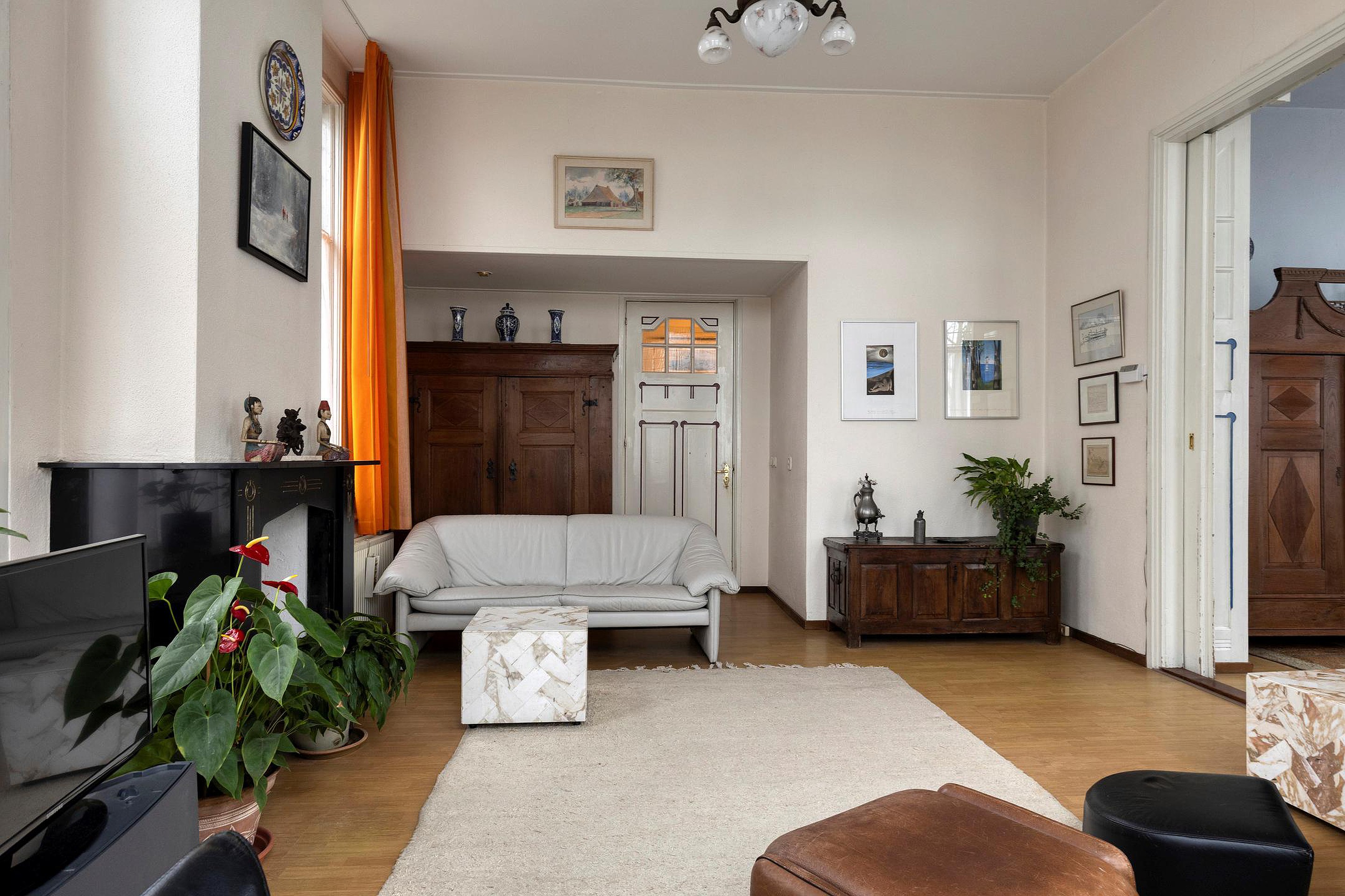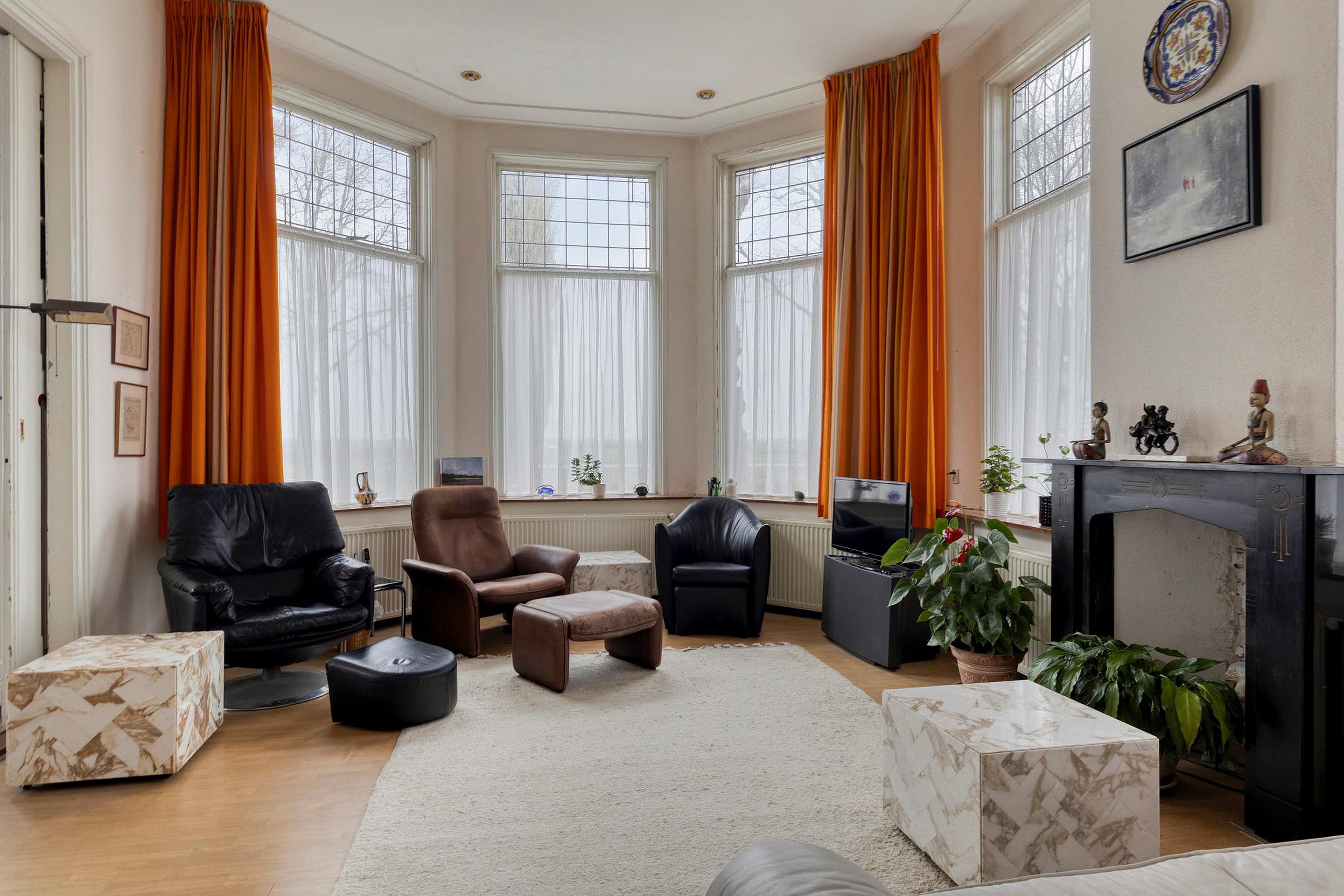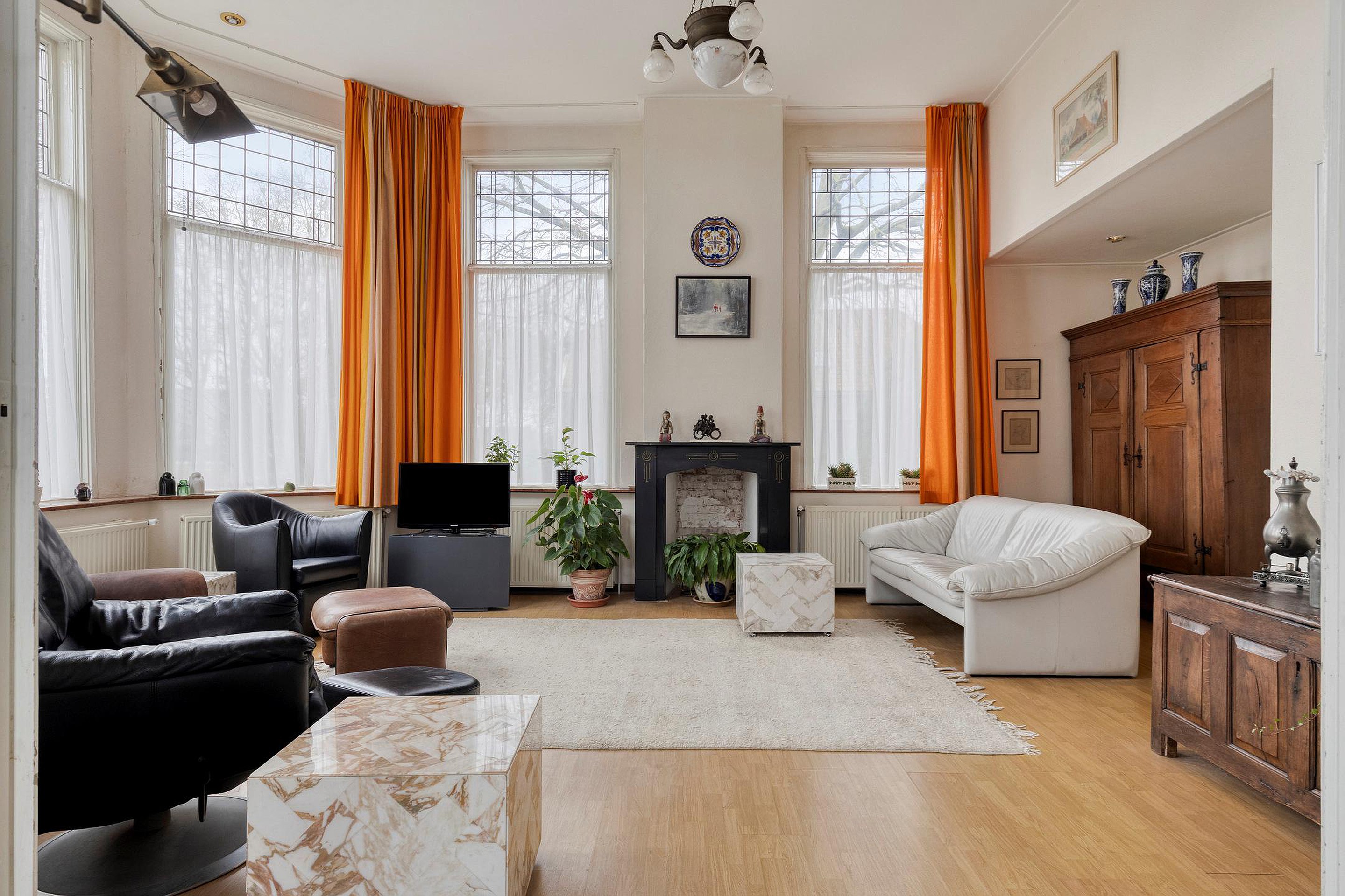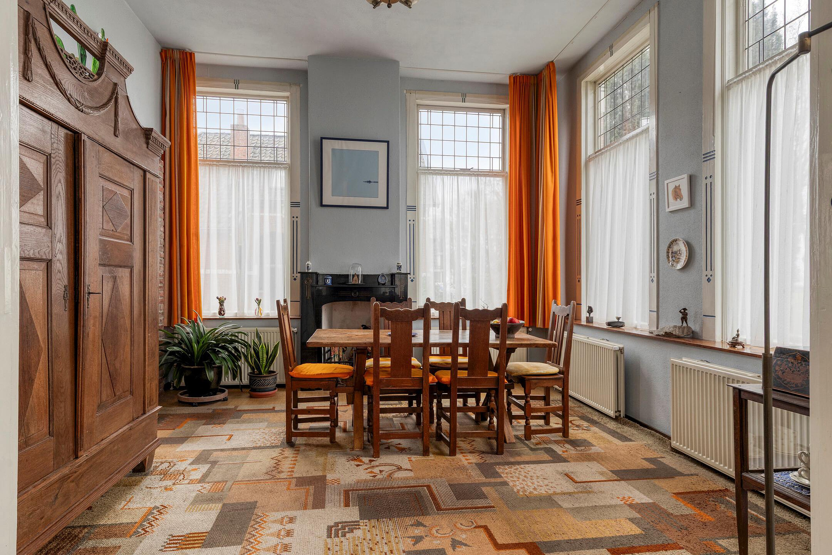 Aan de voorzijde van de woning bevinden zich de woonkamer met erker en de en-suite eetkamer. Beide ruimtes kenmerken zich door de hoge ramen met een fijne lichtinval en een aangename sfeer. ’s Ochtends ziet u hier de zon opkomen.