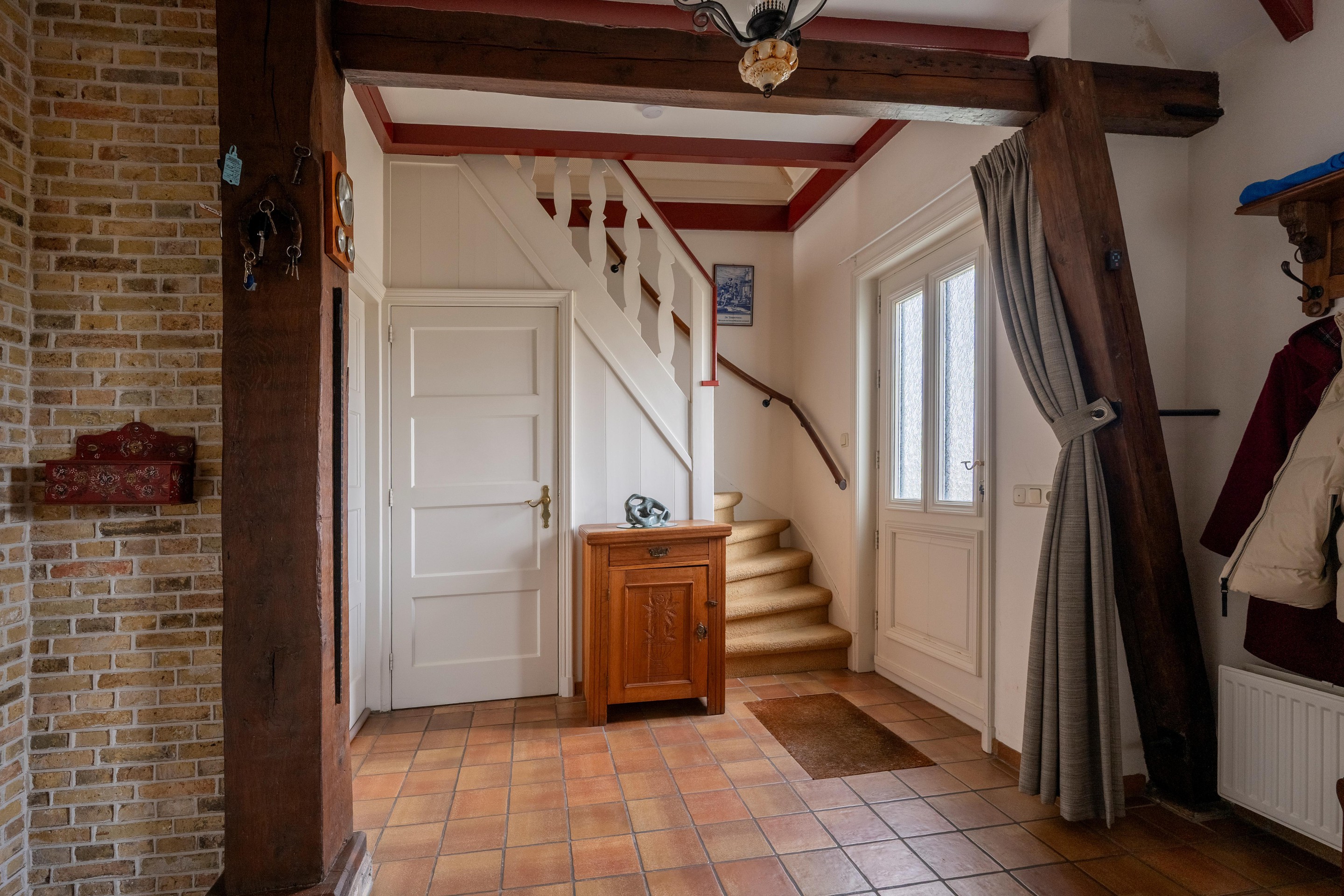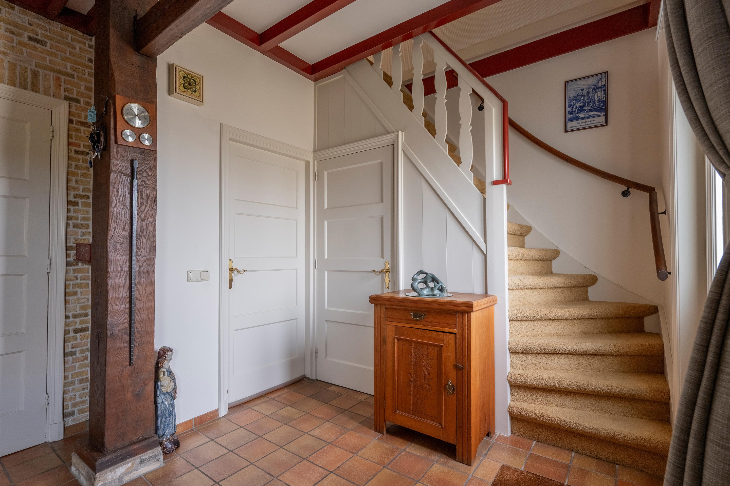 entree, hal met trapopgang met mooi schoonmetselwerk en klassieke bienten constructie, kantoor/werkkamer met kelderkast, L-vormige woonkamer met schouw en houtkachel aansluiting, openslaande tuindeuren naar zonneterras op het zuiden, woon-/leefkeuken met vloerverwarming en royaal en verzorgd keukenblok met inbouwapparatuur o.a. 5-pits gaskookplaat, koelkast, vriezer, vaatwasser, afzuigkap, veel bergruimte en natuurstenen werkblad, bijkeuken met witgoedaansluitingen en cv-installatie, badkamer voorzien van wastafelmeubel, douchehoek en designradiator, apart toilet met fonteintje, achterentree-/hal met dubbele deur, bergschuur met dubbele deur en via losse trapopgang naar bergzolder, dubbele garage met roldeuren, stalen spantconstructie, zijtoegangsdeur en via losse trap naar ruime bergzolder ca. 15 m2 met takelkraanarm, houten overkapping voor houtopslag, ruime tuin rondom met diverse heerlijke beschutte zitplekjes o.a. aan het water en aan de zijkant van de woning op het zuiden gericht , ruime en royale oprit.