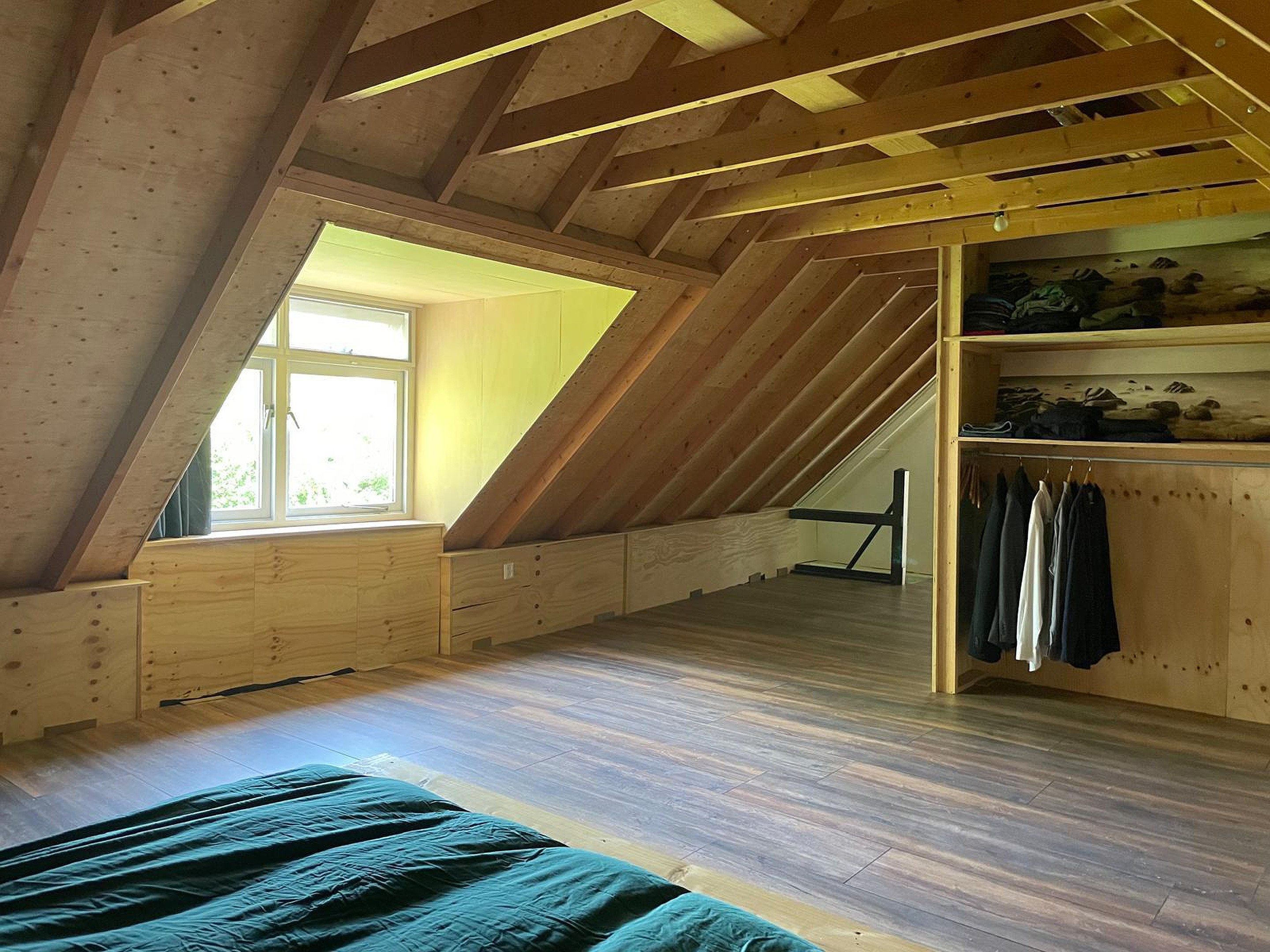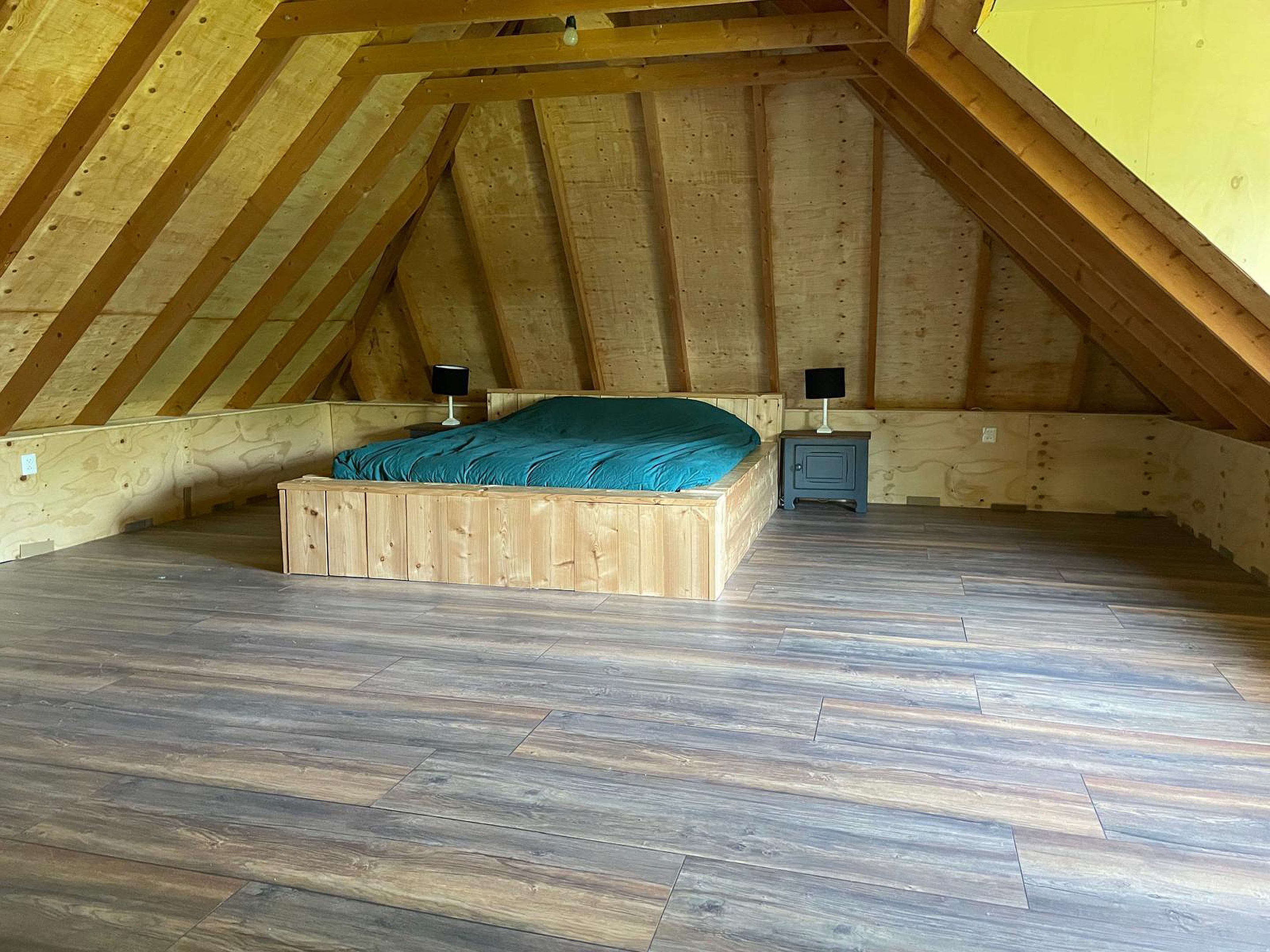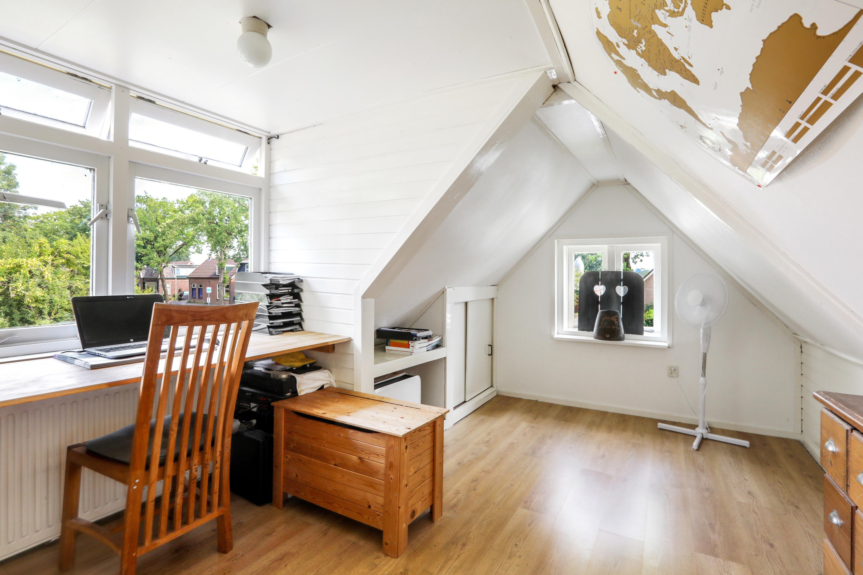 De verdieping is verdeeld in twee grote ruimten die nu in gebruik zijn als werk-/studeerkamer en als slaapkamer. Twee grote dakkapellen zorgen voor extra ruimte. Ook is er een berging/cv-ruimte aanwezig.