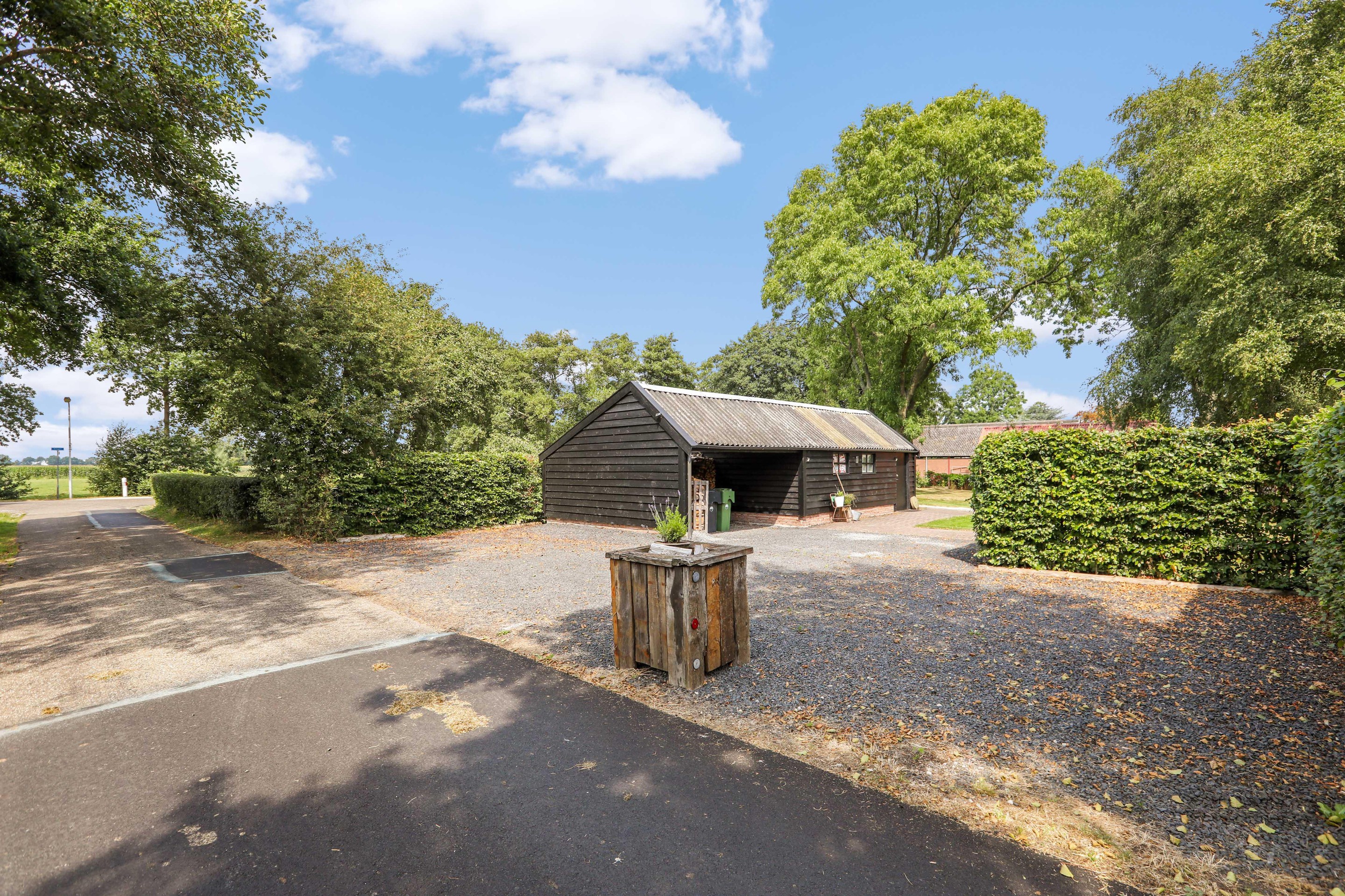 Groot erf met ruimte voor meerdere auto’s. Deels open opslag- en hobbyruimte. Voor-, zij- en achtertuin, ingericht met gazon, heggen, bomen en een riant terras. Het perceel biedt ruimte voor het houden van hobbydieren en sier- en/of moestuin.