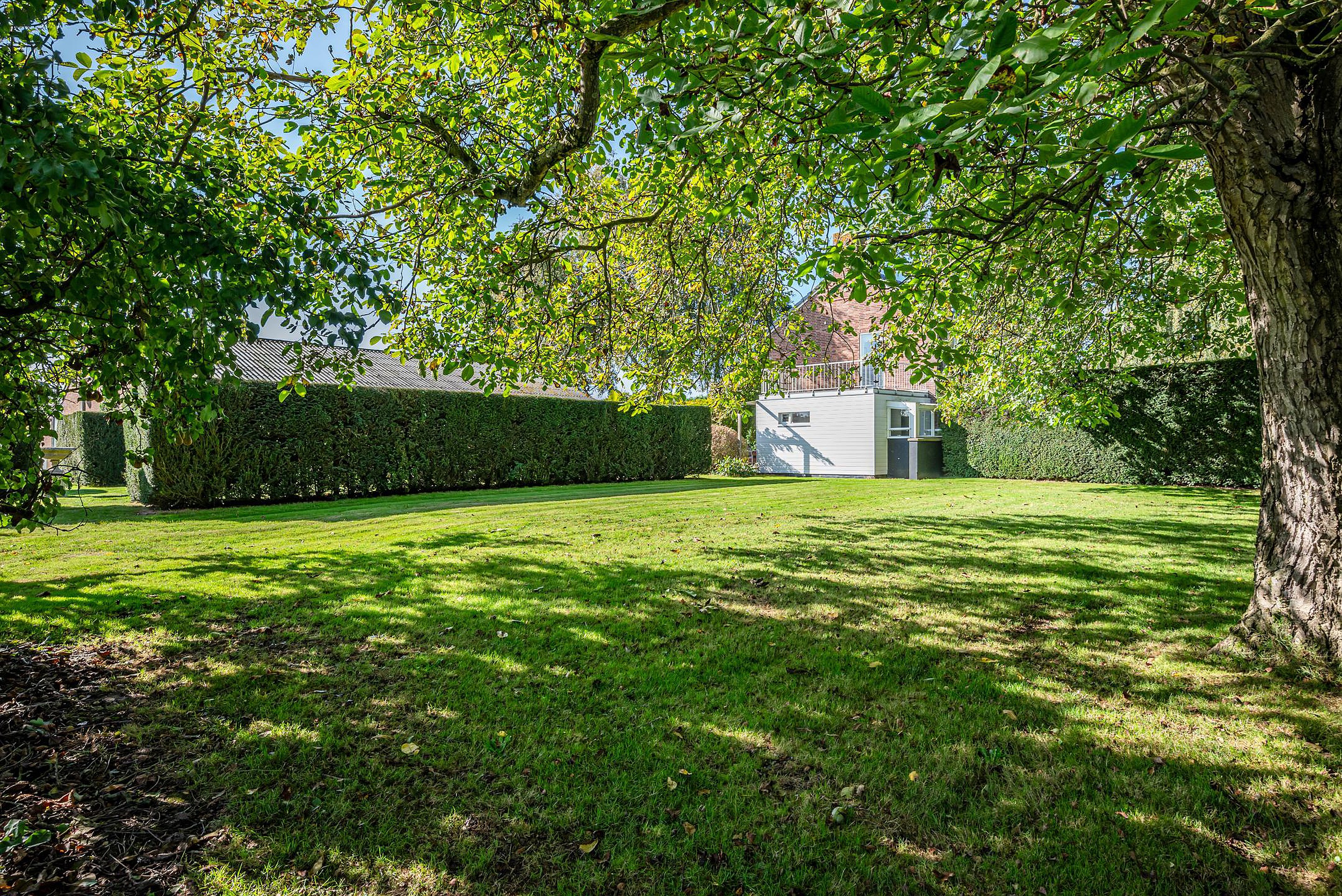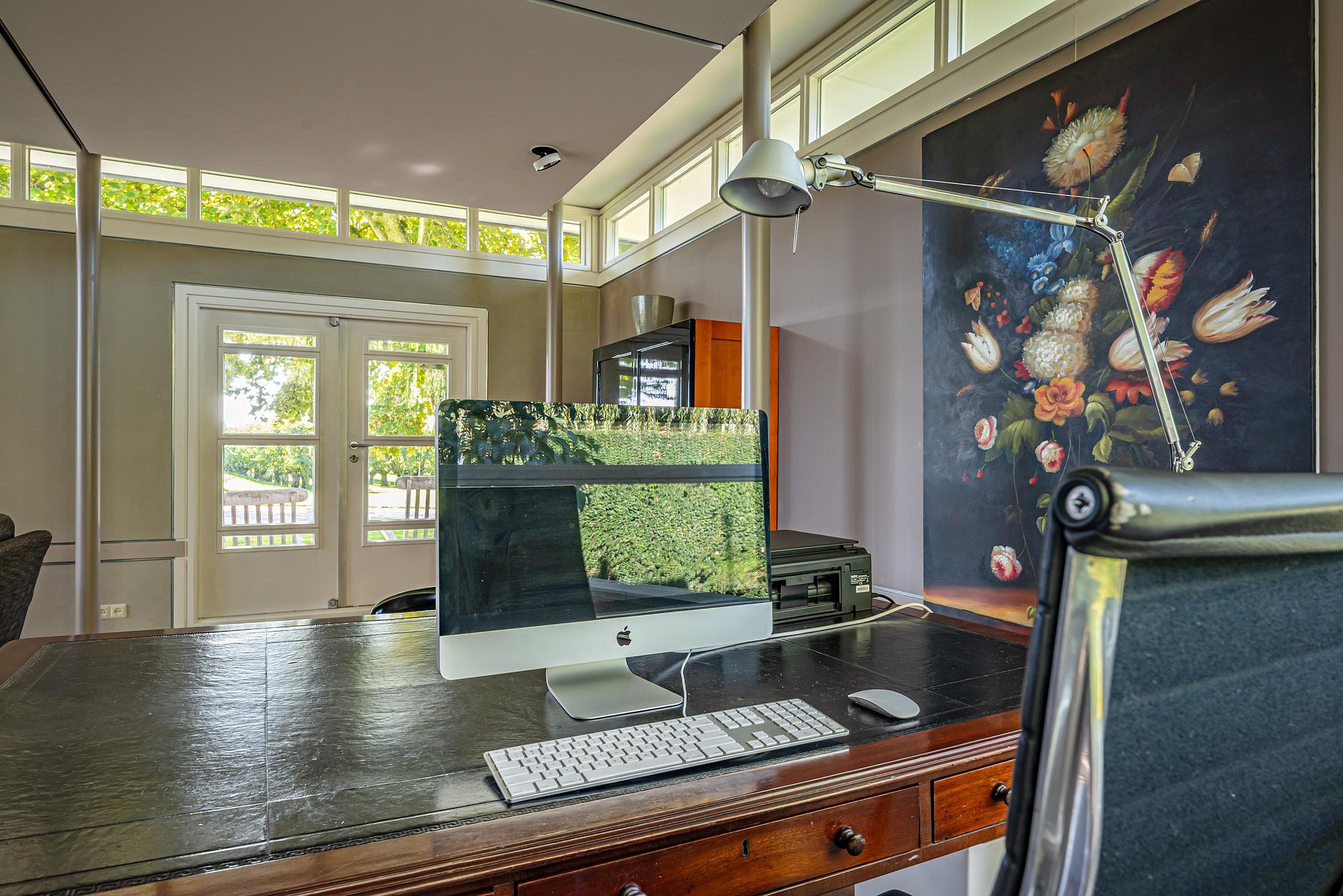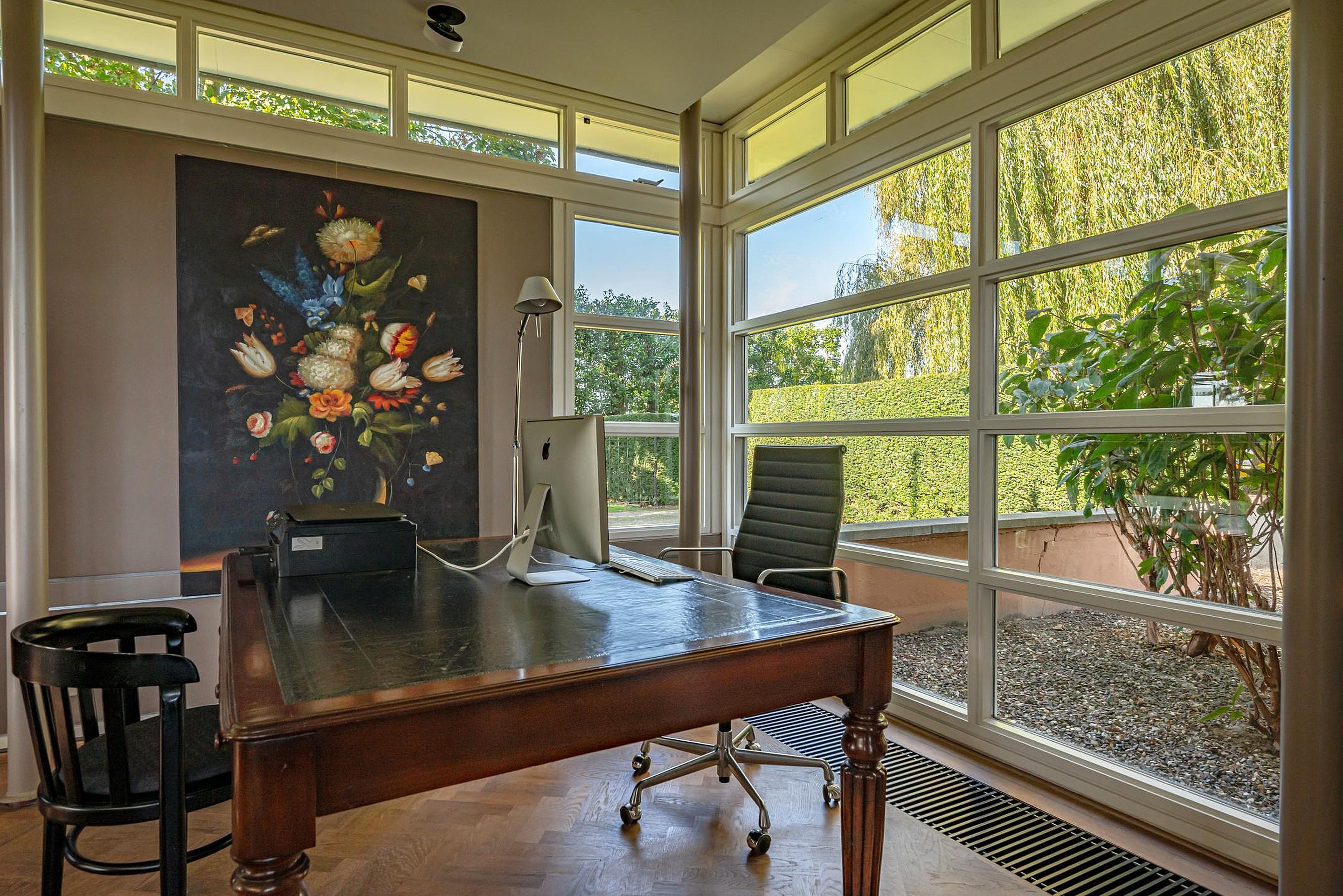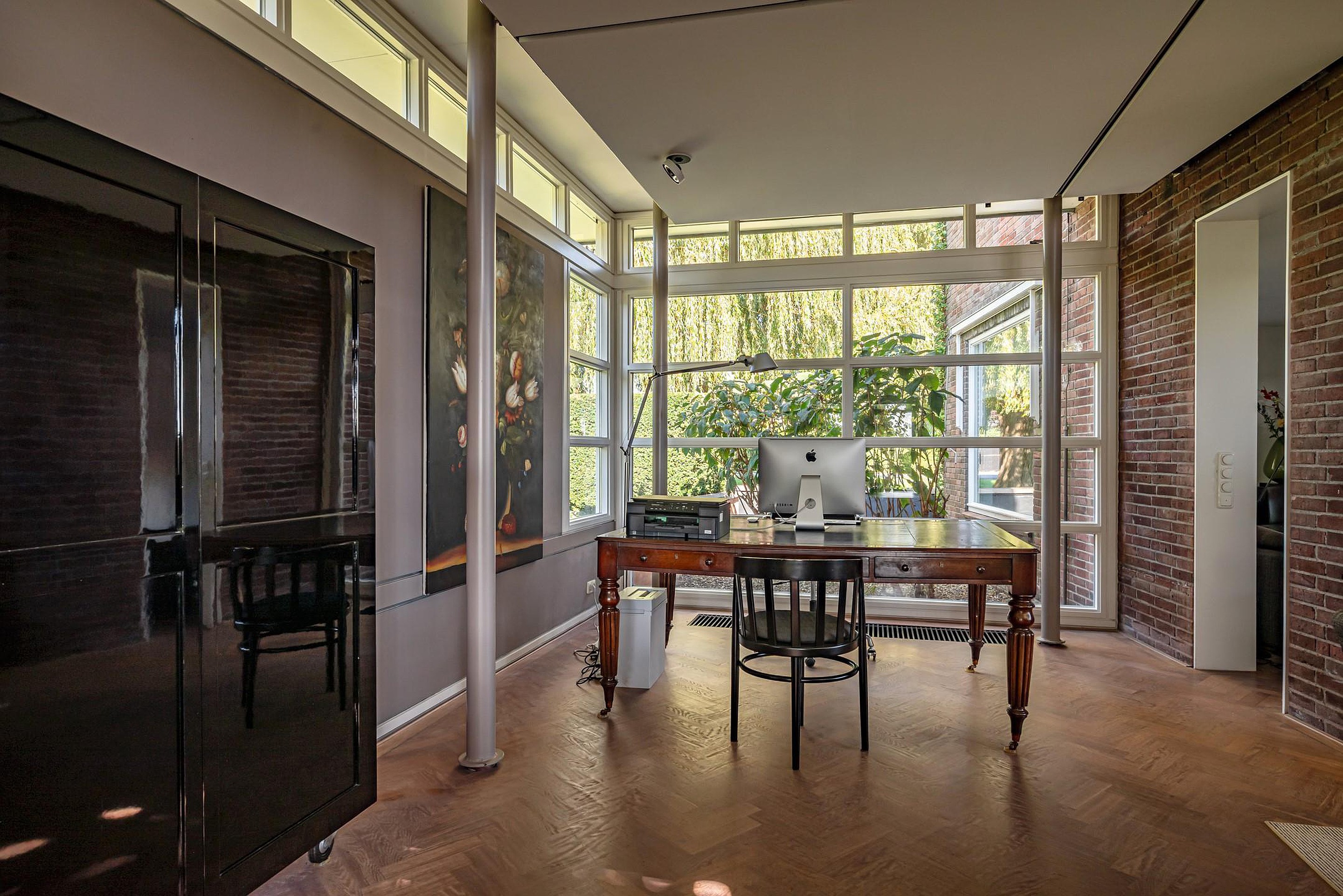 - In 1991 uitgebouwd (7,75 m x 5,50 m) met een royale zitkamer en open kantoorruimte (ook geschikt voor andere functies), met dubbele openslaande deuren naar de tuin