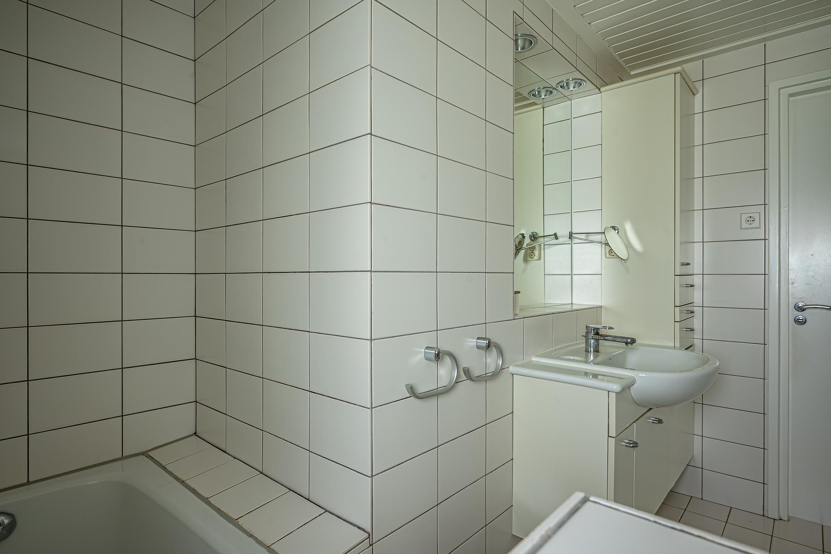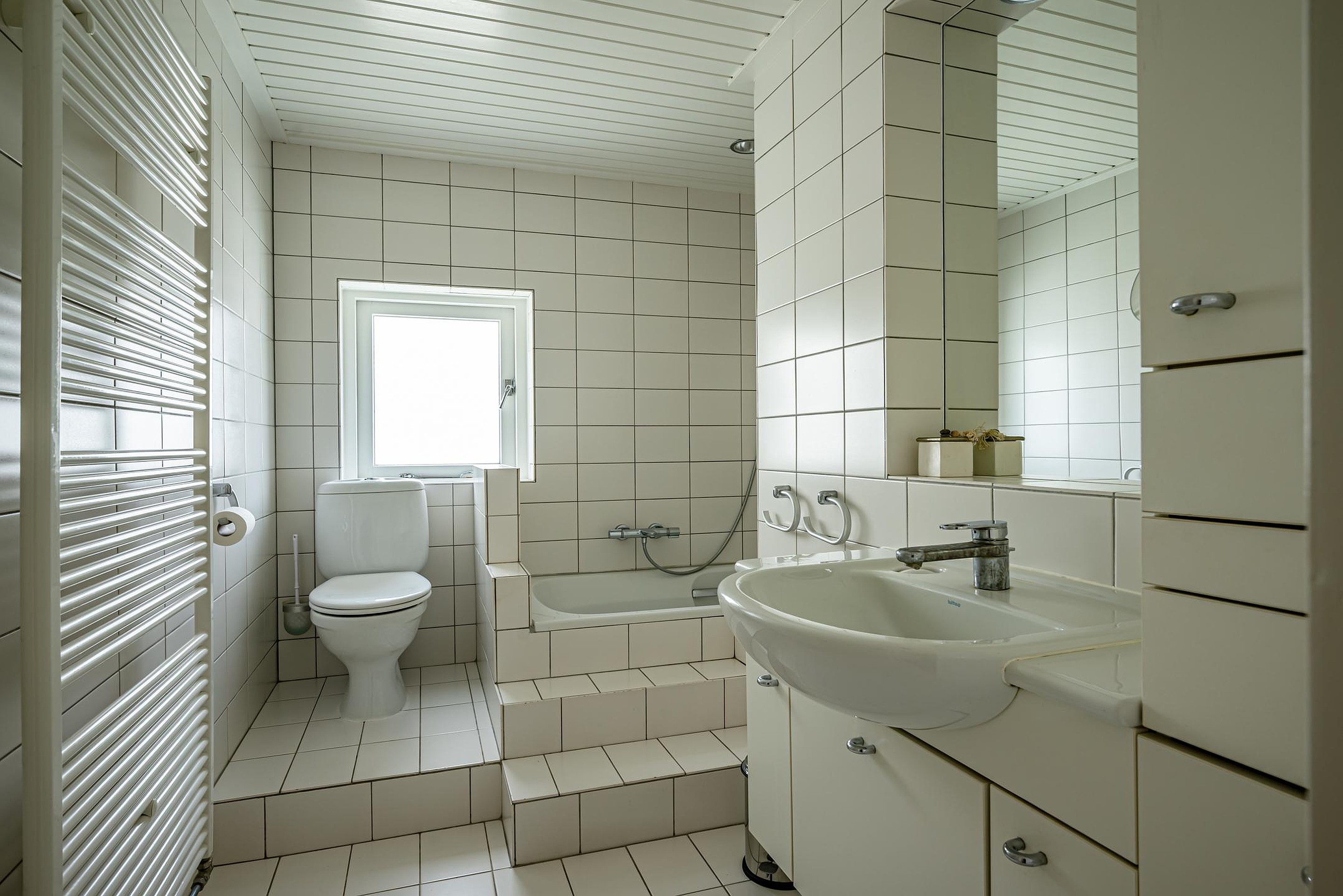 - Badkamer met toilet, wastafelmeubel, designradiator en ligbad met douche