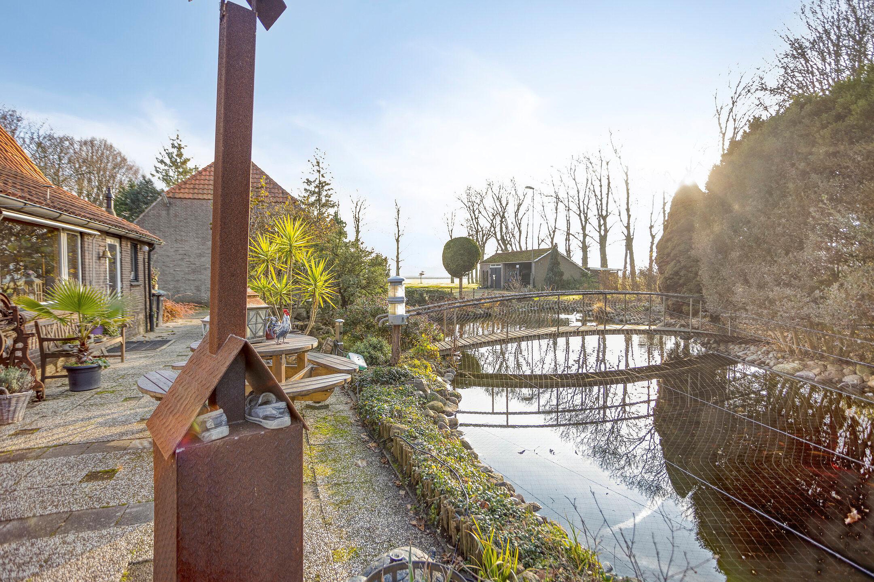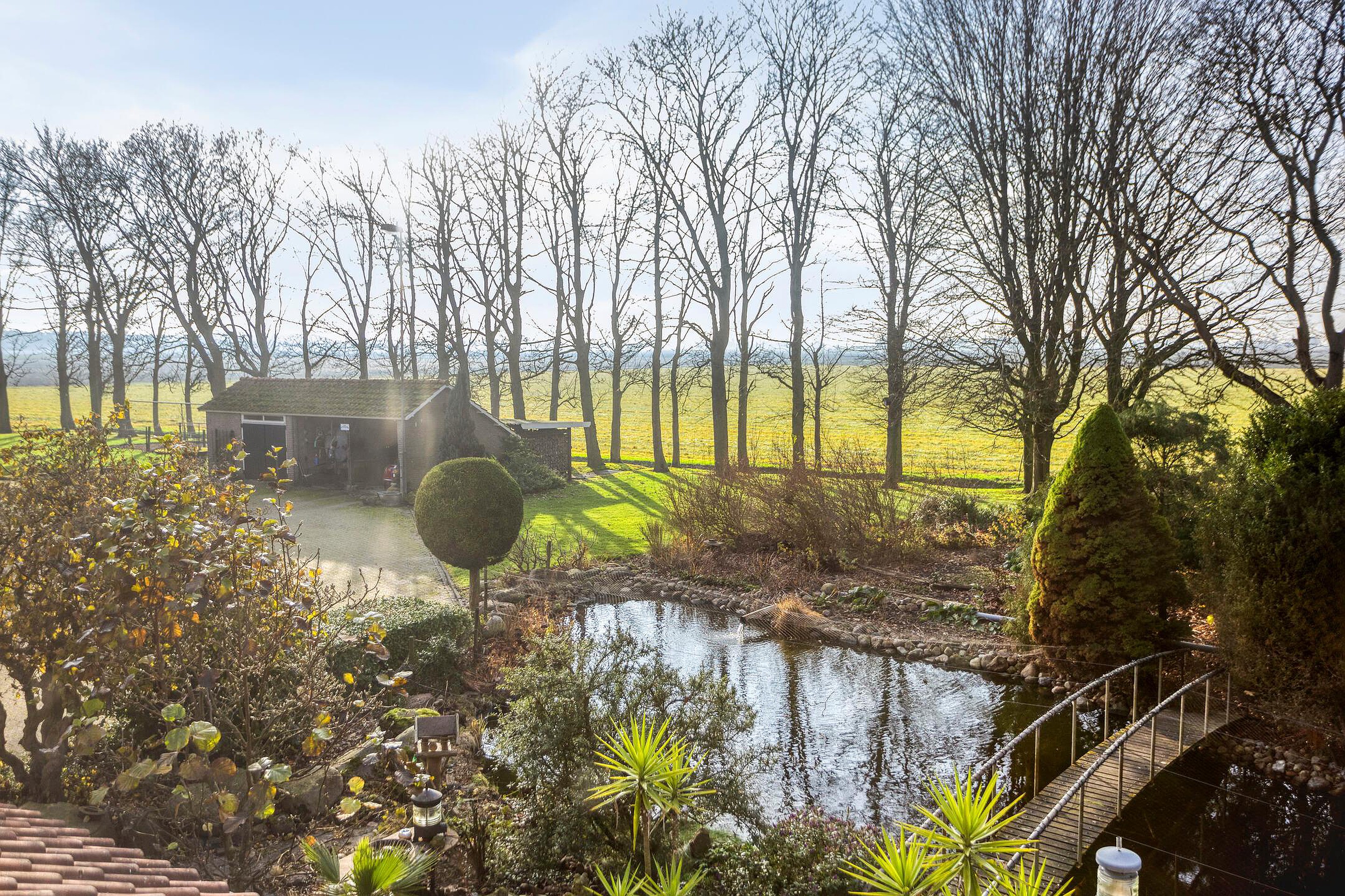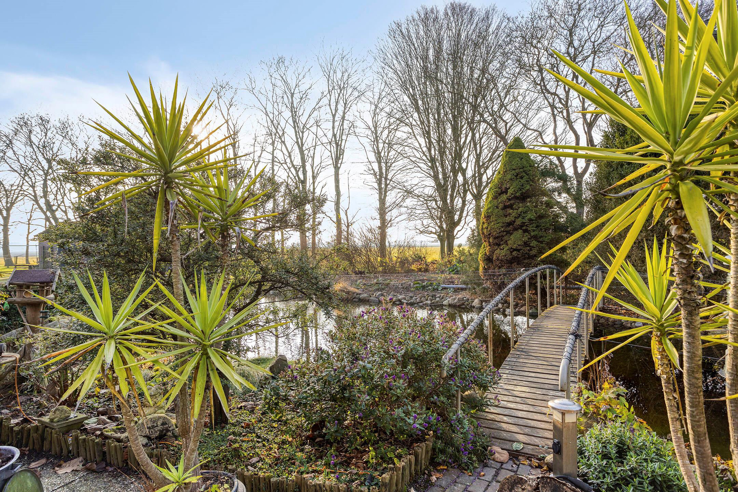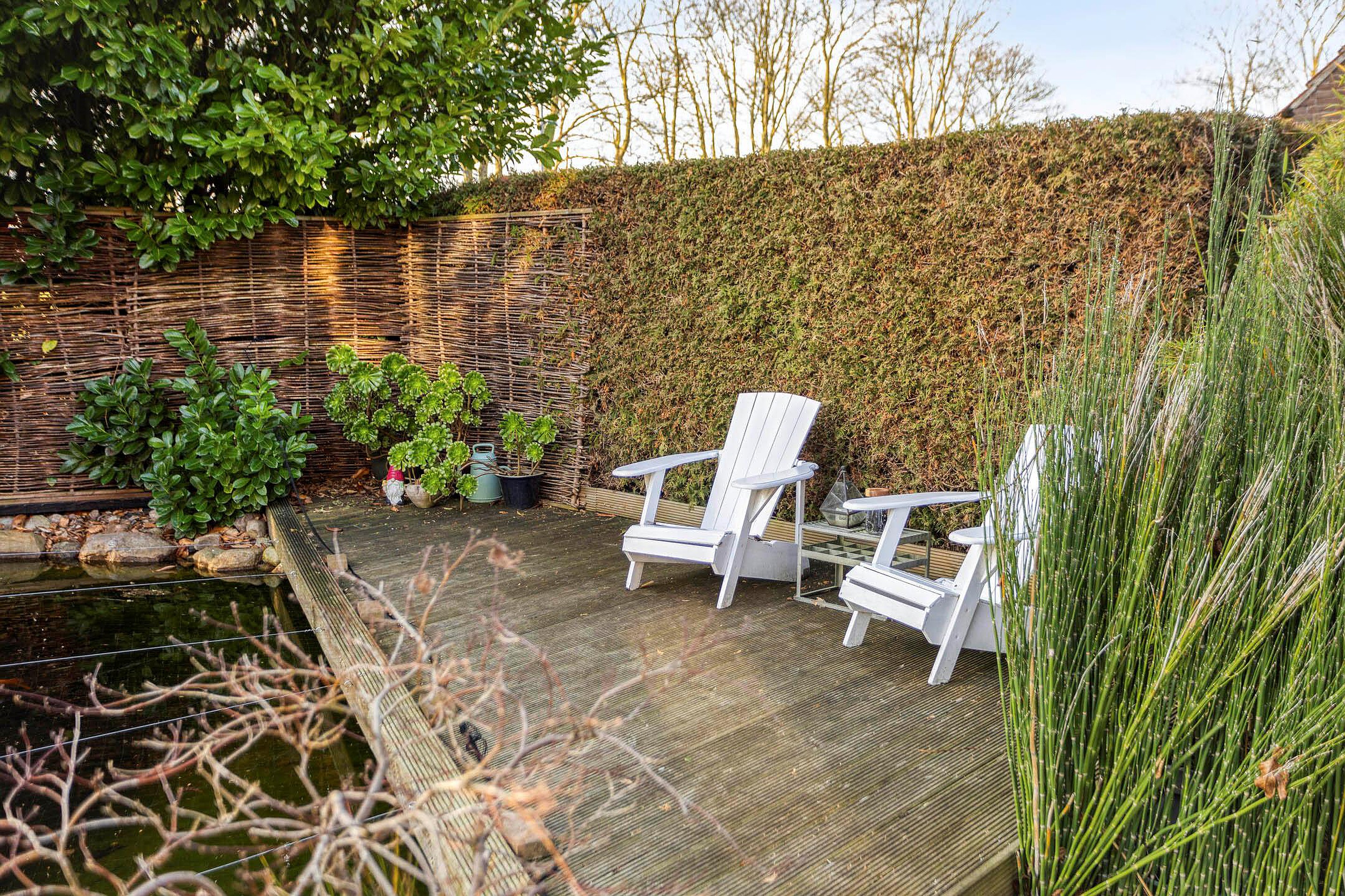 Tuin Rondom de woonboerderij ligt een fraai aangelegde sier- en landschapstuin met volwassen beplanting, meerdere zonneterrassen en volledige privacy. Absolute blikvanger is de grote vijver met koi karpers – een waar sieraad voor de tuin.