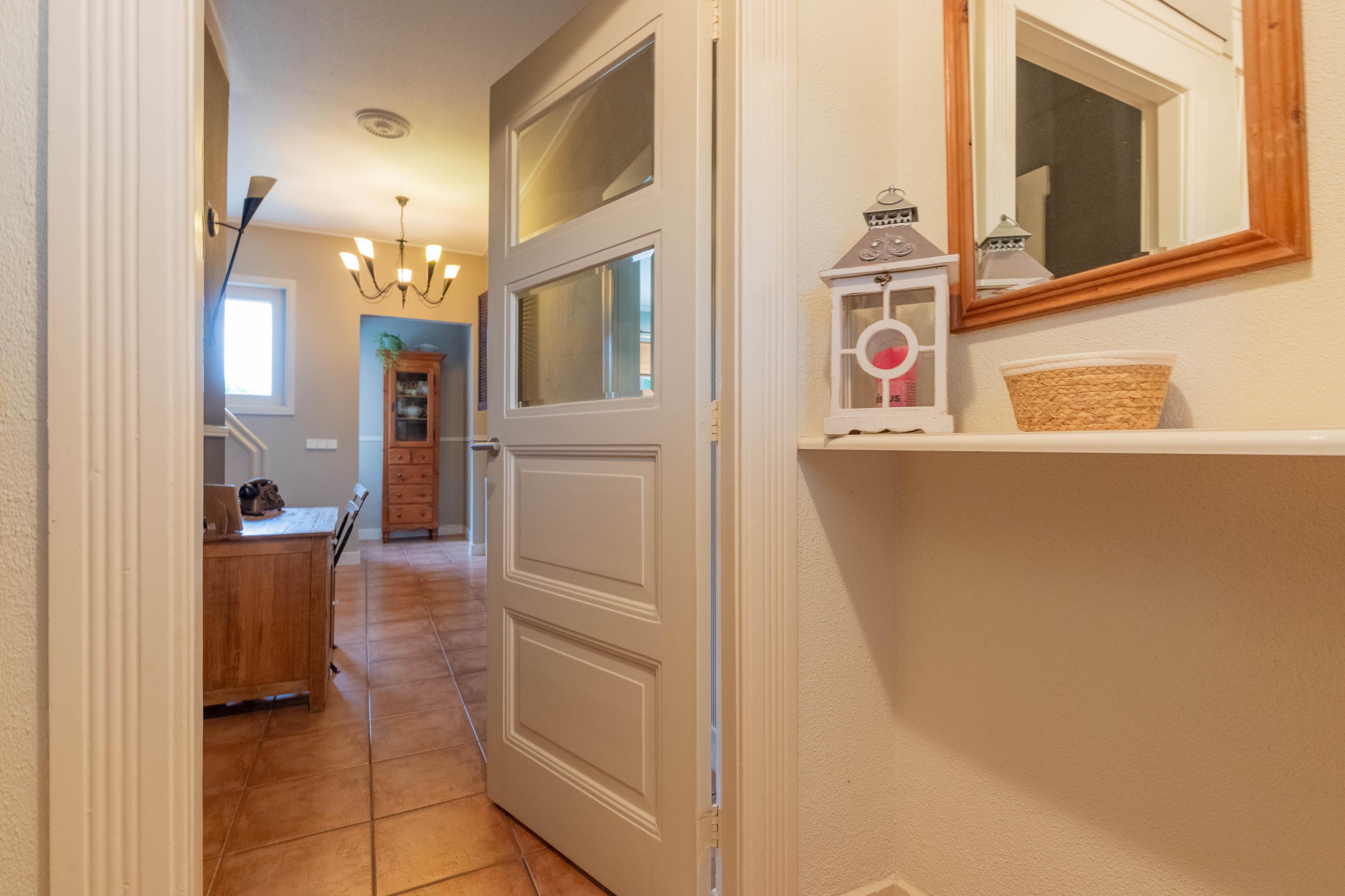 Terug in de centrale hal is de toiletruimte uitgerust met een wandcloset en fonteintje. Achter de trapopgang is er een deur naar het terras aan de achterzijde.