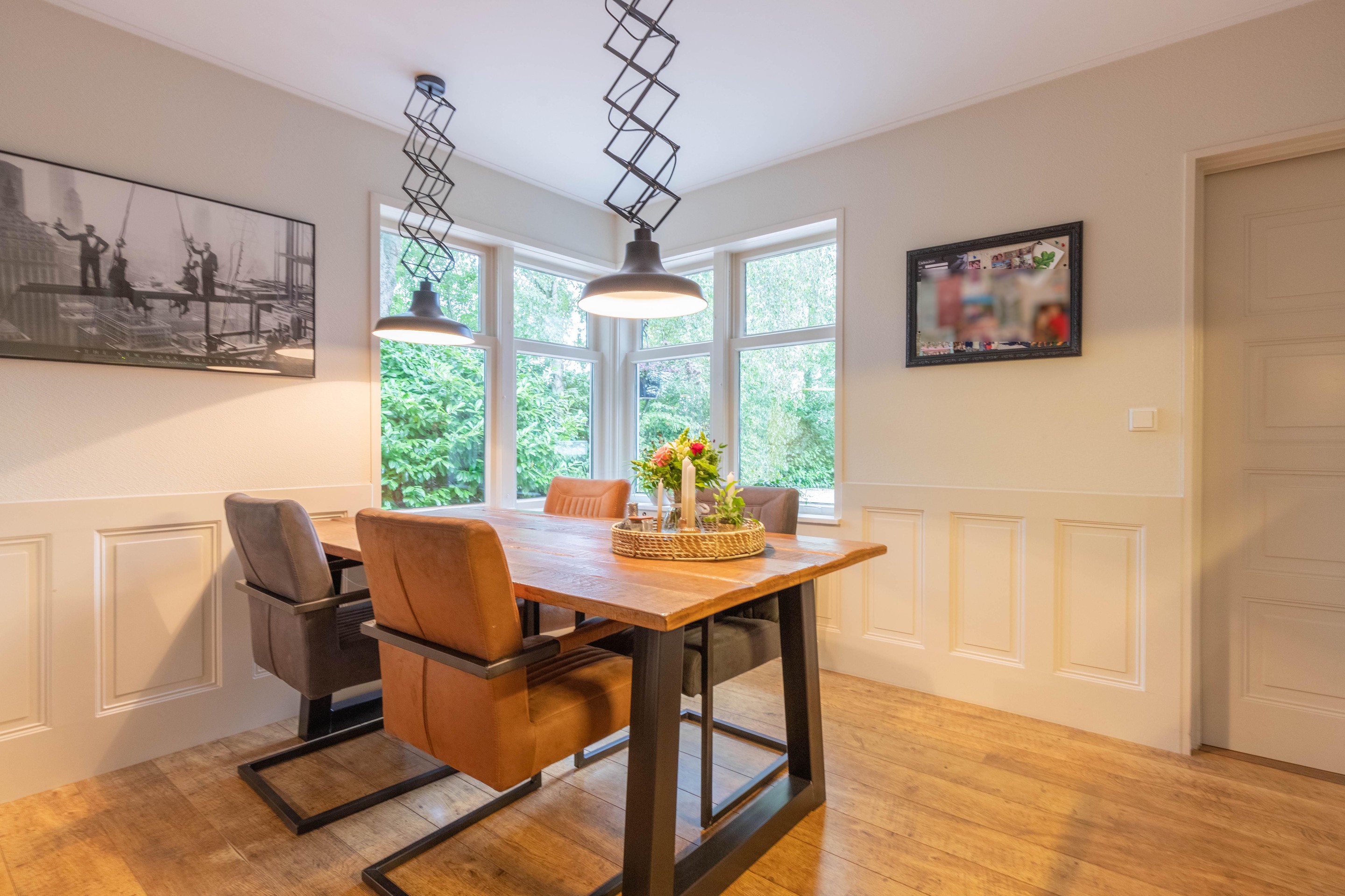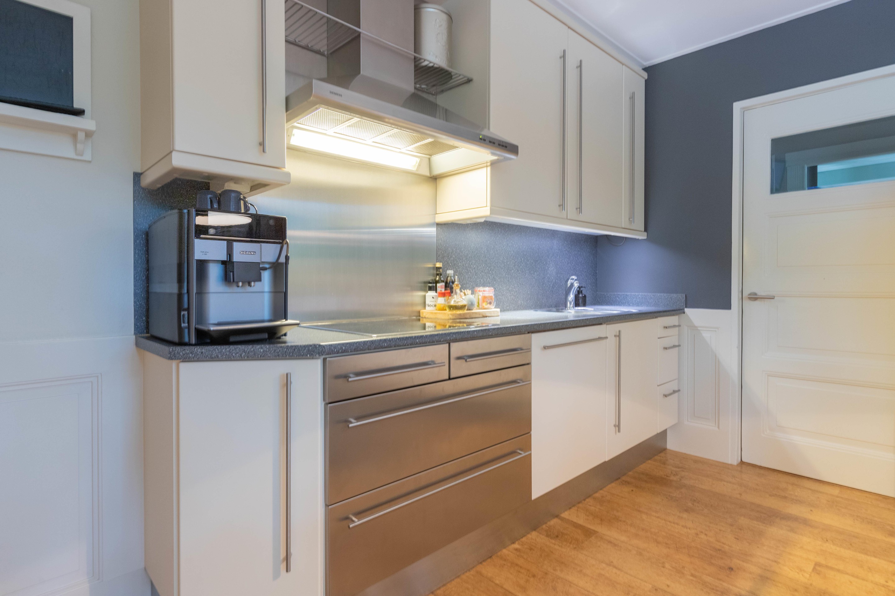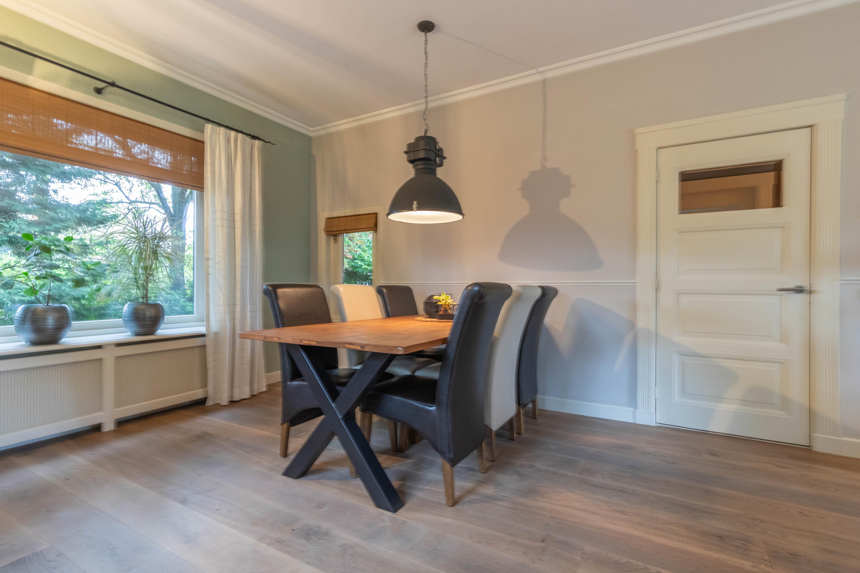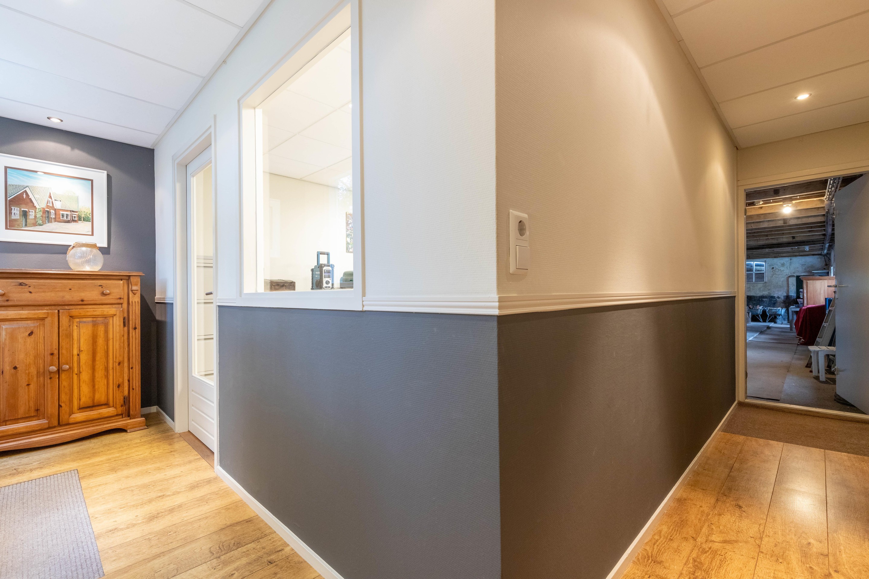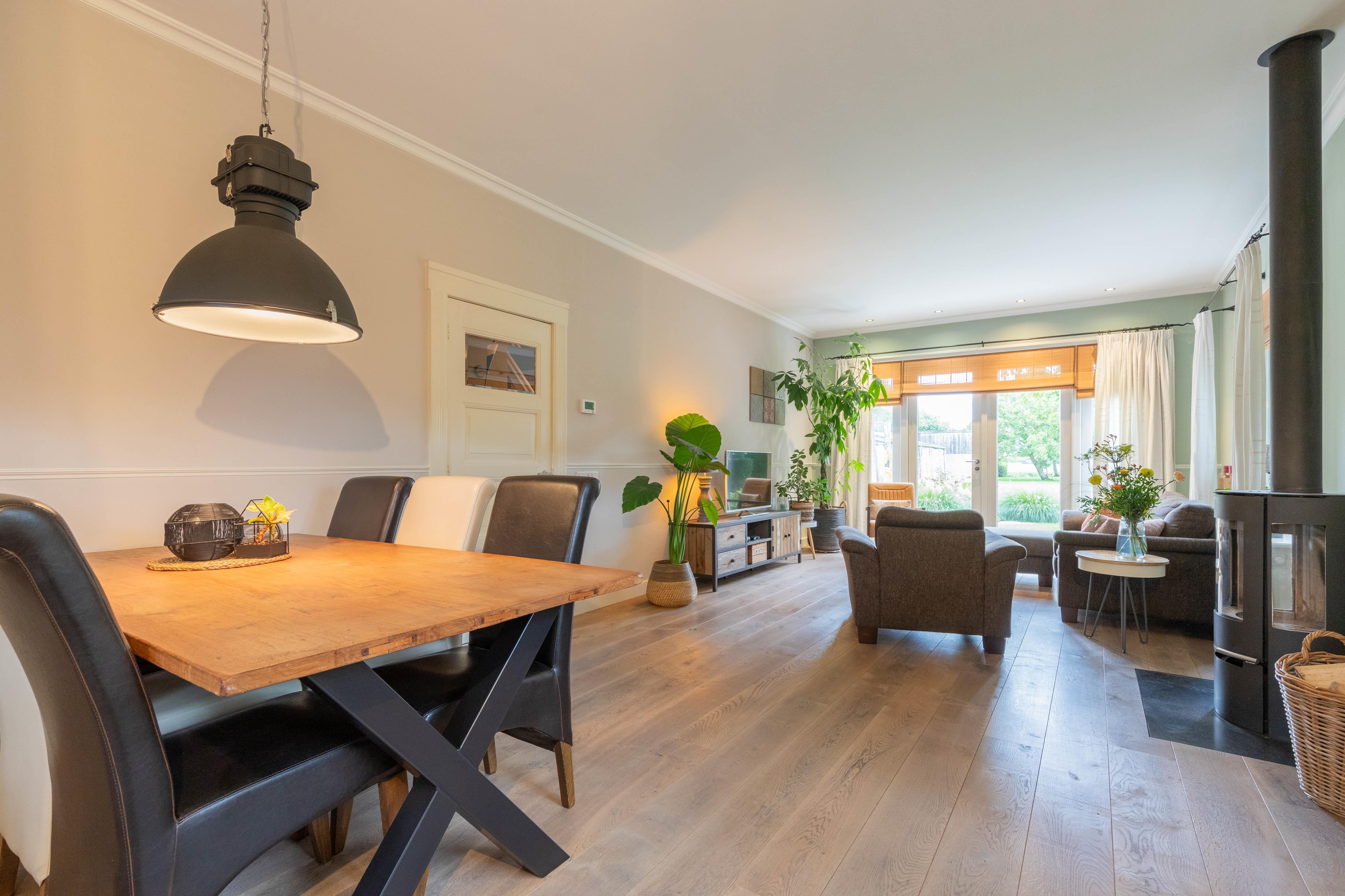 Begane grond Via de voordeur komt u in de ruime hal met plavuizen vloer. Hier heeft u toegang tot onder meer de woonkamer, keuken, toilet, trapopgang, achtertuin en meterkast (12 groepen). De woonkamer is diep en licht met ramen aan vier zijden. Het heeft een fraaie houten vloerafwerking en naast de radiatoren ook een comfortabele houtkachel. Via de dubbele openslaande deuren komt u in de achtertuin. De aan de andere zijde van de hal gelegen keuken is ruim genoeg om als woonkeuken te dienen. Het beschikt over een elektrische kookplaat, vaatwasser en koelkast. Er is vanuit de keuken ook toegang tot de hal aan de andere kant van de woning. Hier ligt onder meer het kantoor, toegang tot de kelder en tot de stal aan de achterzijde. De stal heeft nog de oude balken en aan de voorzijde is er een werkschuur ingebouwd.