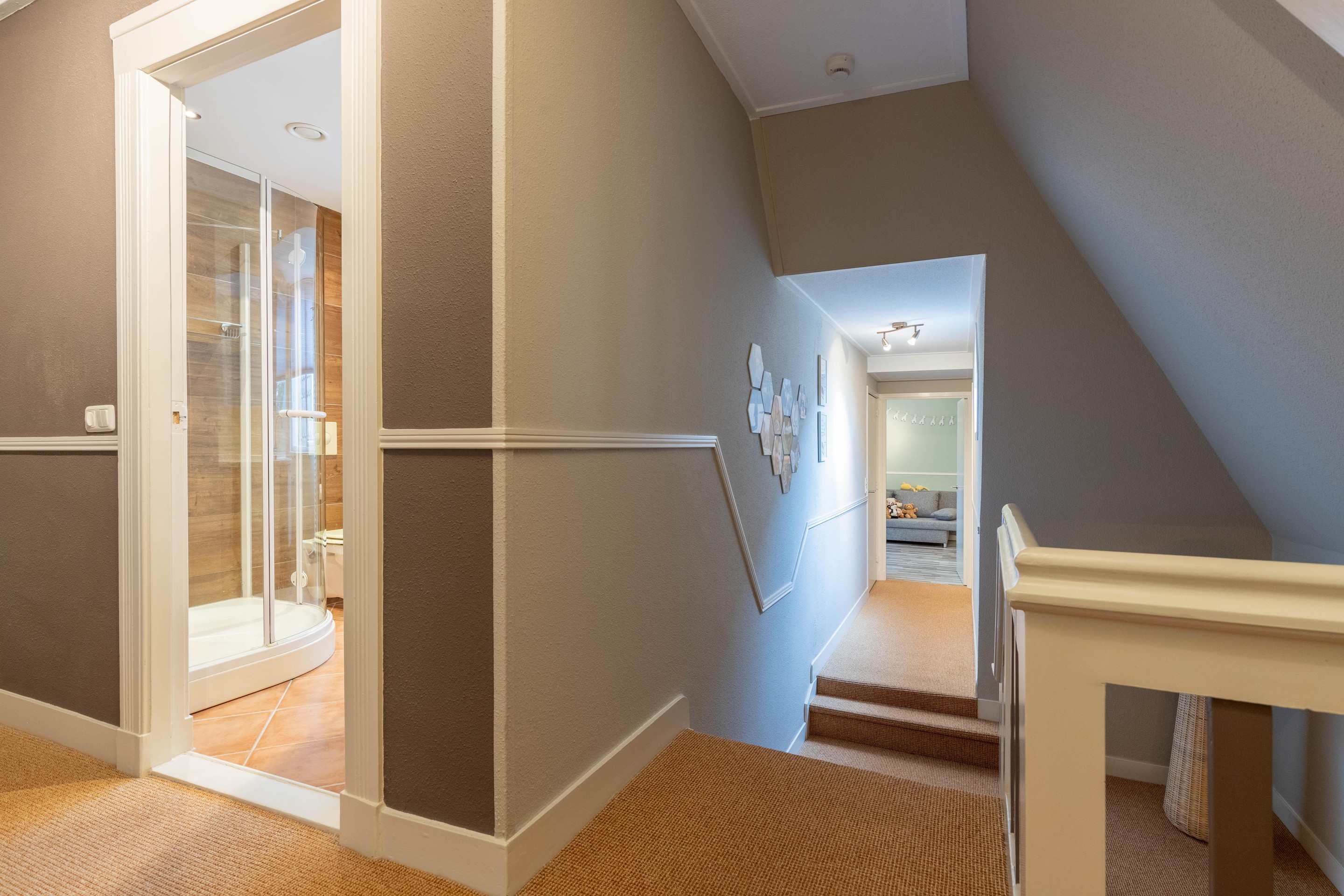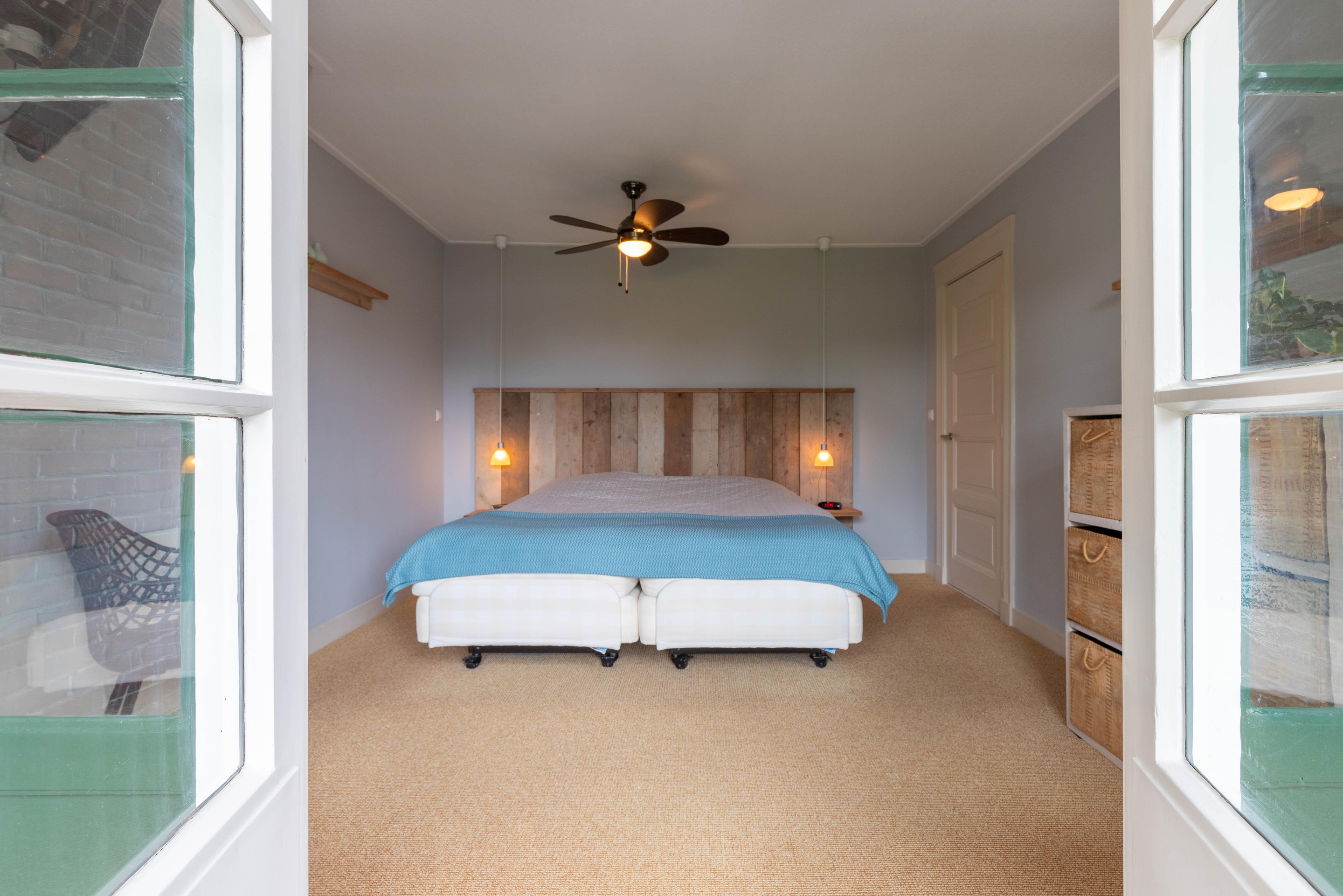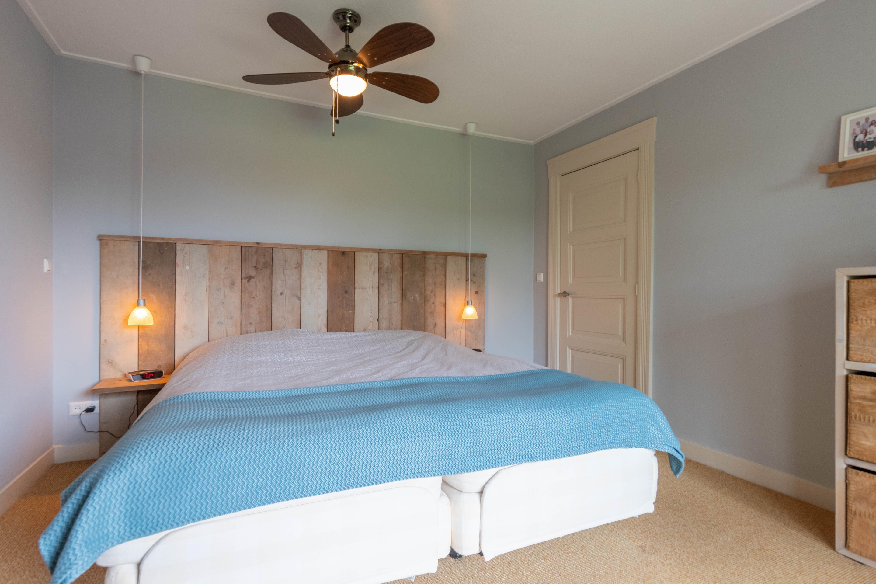 Eerste verdieping De eerste verdieping is verdeeld in twee niveaus. Op het hoogste deel liggen twee slaapkamers. De hoofdslaapkamer aan de achterzijde heeft een traditioneel balkon met uitzicht over de achtertuin en polder. Aan de voorzijde van de woning ligt een tweede ruime slaapkamer. De badkamer is uitgerust met een dubbele wastafel, douchecabine en wandcloset. Boven dit deel van de woning is nog een ruime vliering (niet beloopbaar).